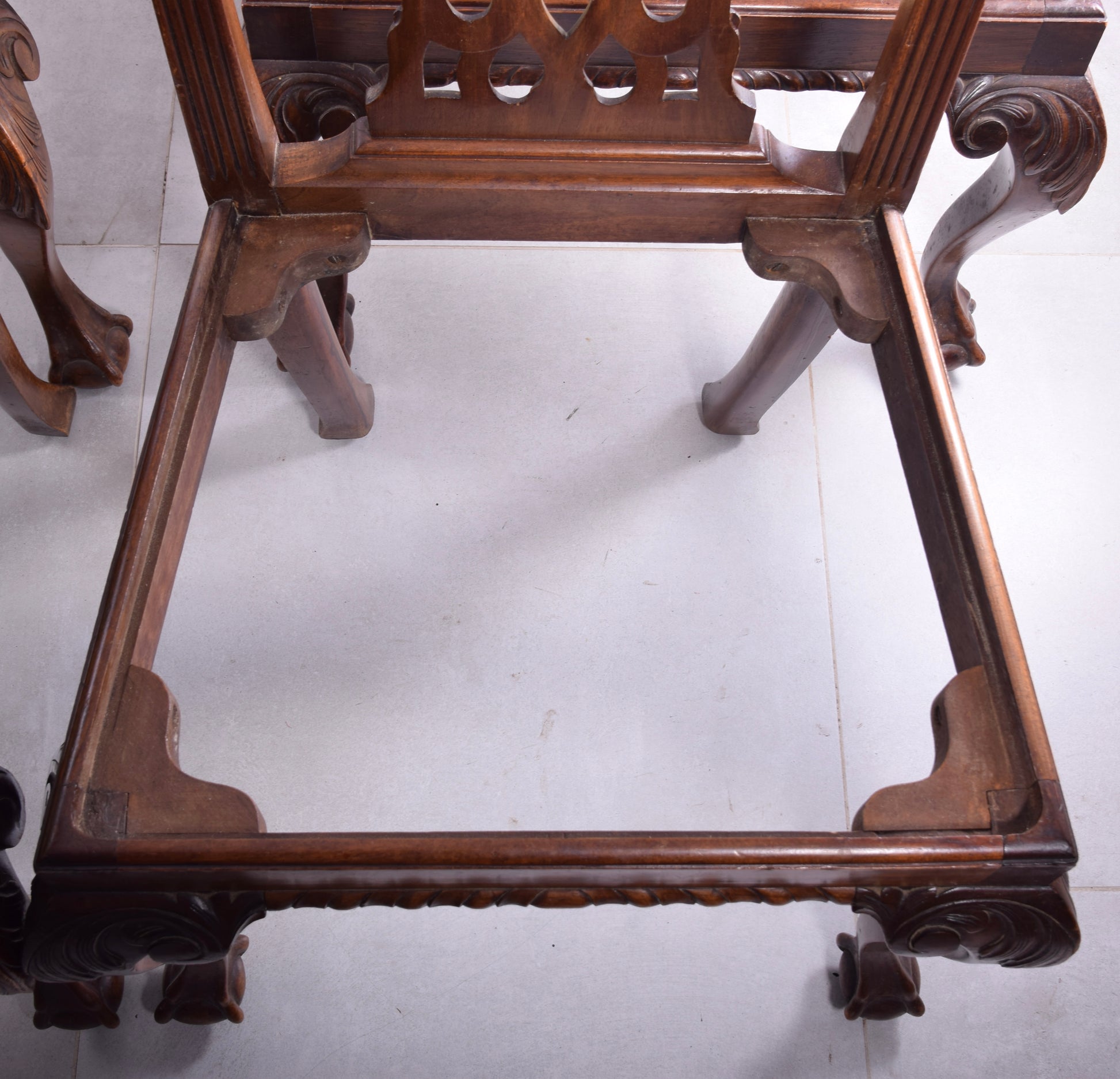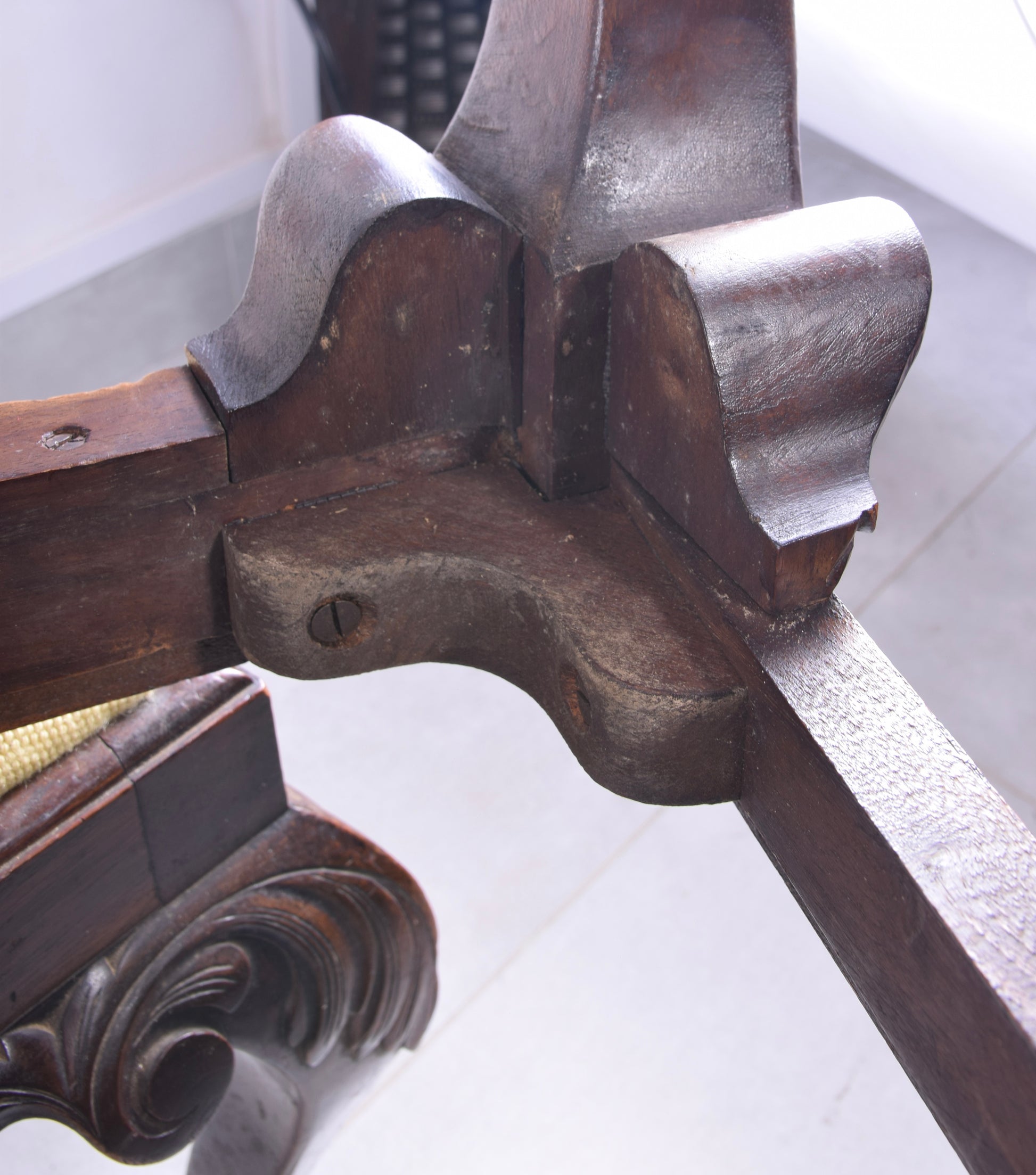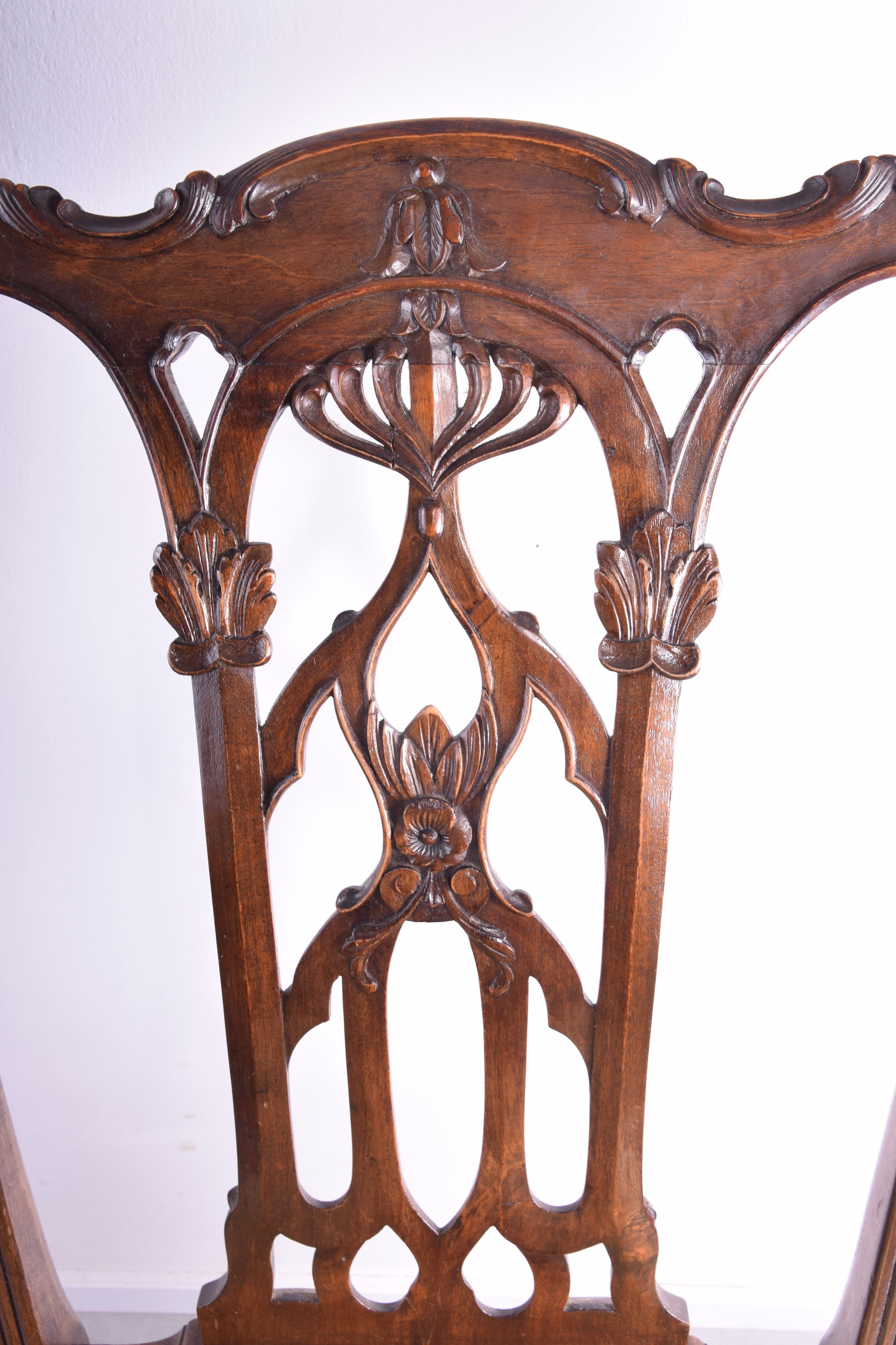 - Oparcia bogato rzeźbione, z ażurowym motywem gotyckich maswerków oraz stylizowanymi liśćmi akantu – typowe dla wysokiego Chippendale.