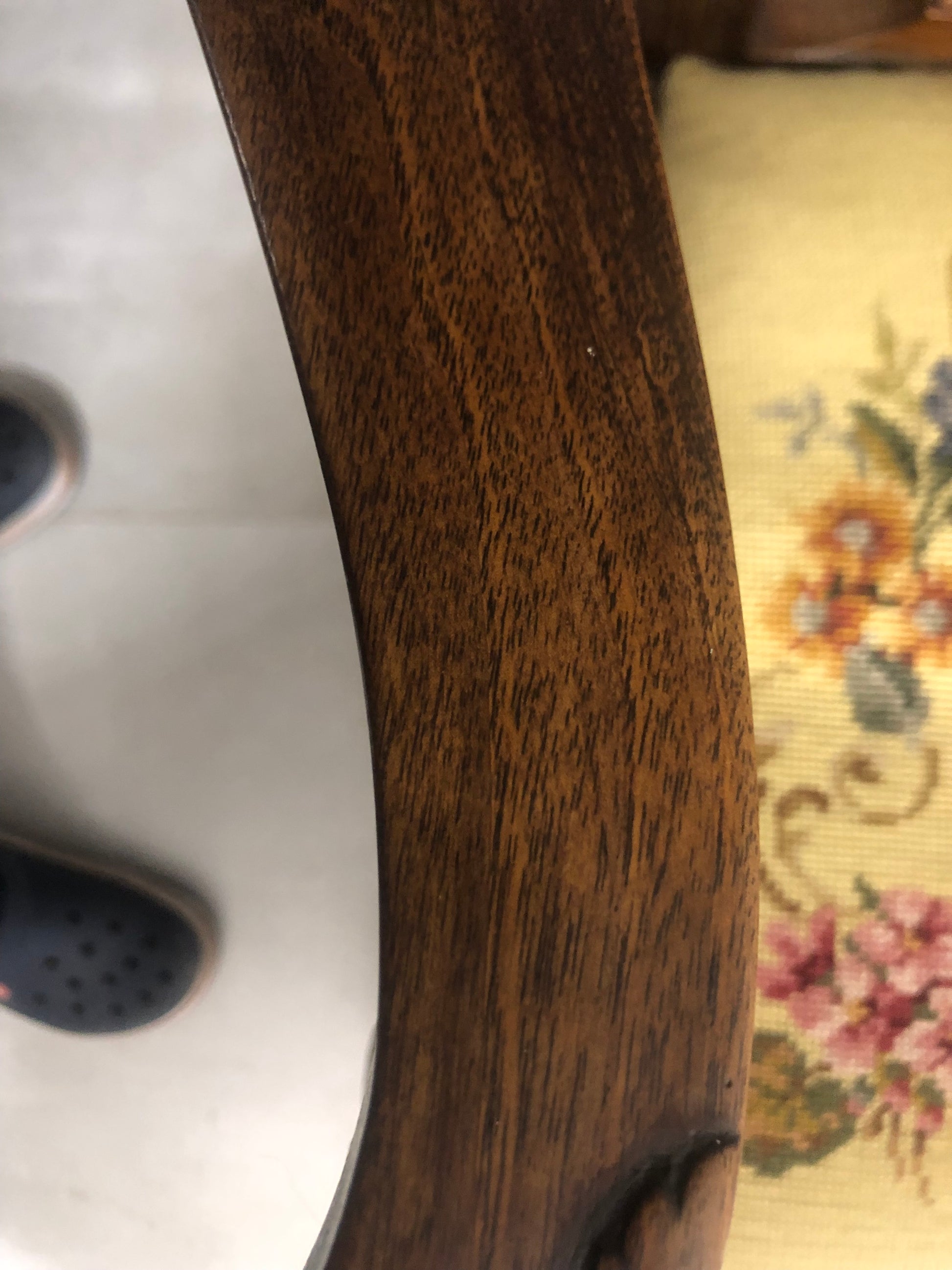 - Tapicerka nowsza, utrzymana w tradycyjnym duchu – jasne tło z kwiatowym haftem gobelinowym, w doskonałym stanie.