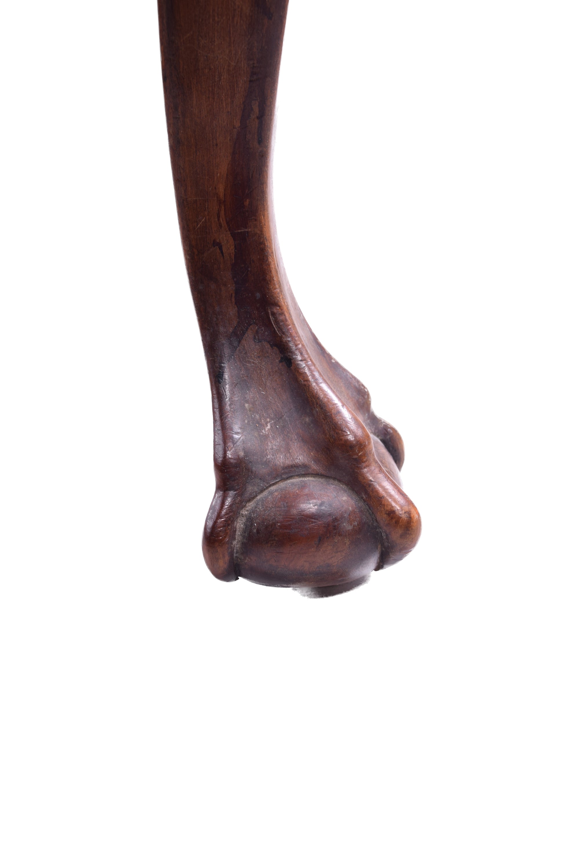 - Nogi wygięte w charakterystyczną linię cabriole, zakończone motywem „ball & claw” (łapa zwierzęcia trzymająca kulę) – symbolizującym siłę i stabilność.