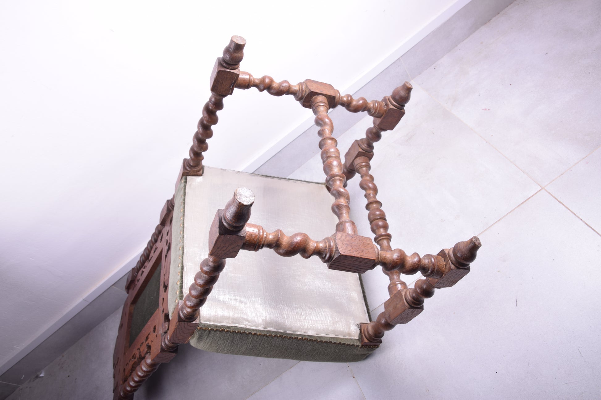 - Siedzisko i środkowa część oparcia: tapicerowane, wykończone gwoździkami dekoracyjnymi. Obicie – współczesny materiał, raczej nie oryginalny. Stabilna konstrukcja, tapicerka wtórna, w dobrym stanie użytkowym
