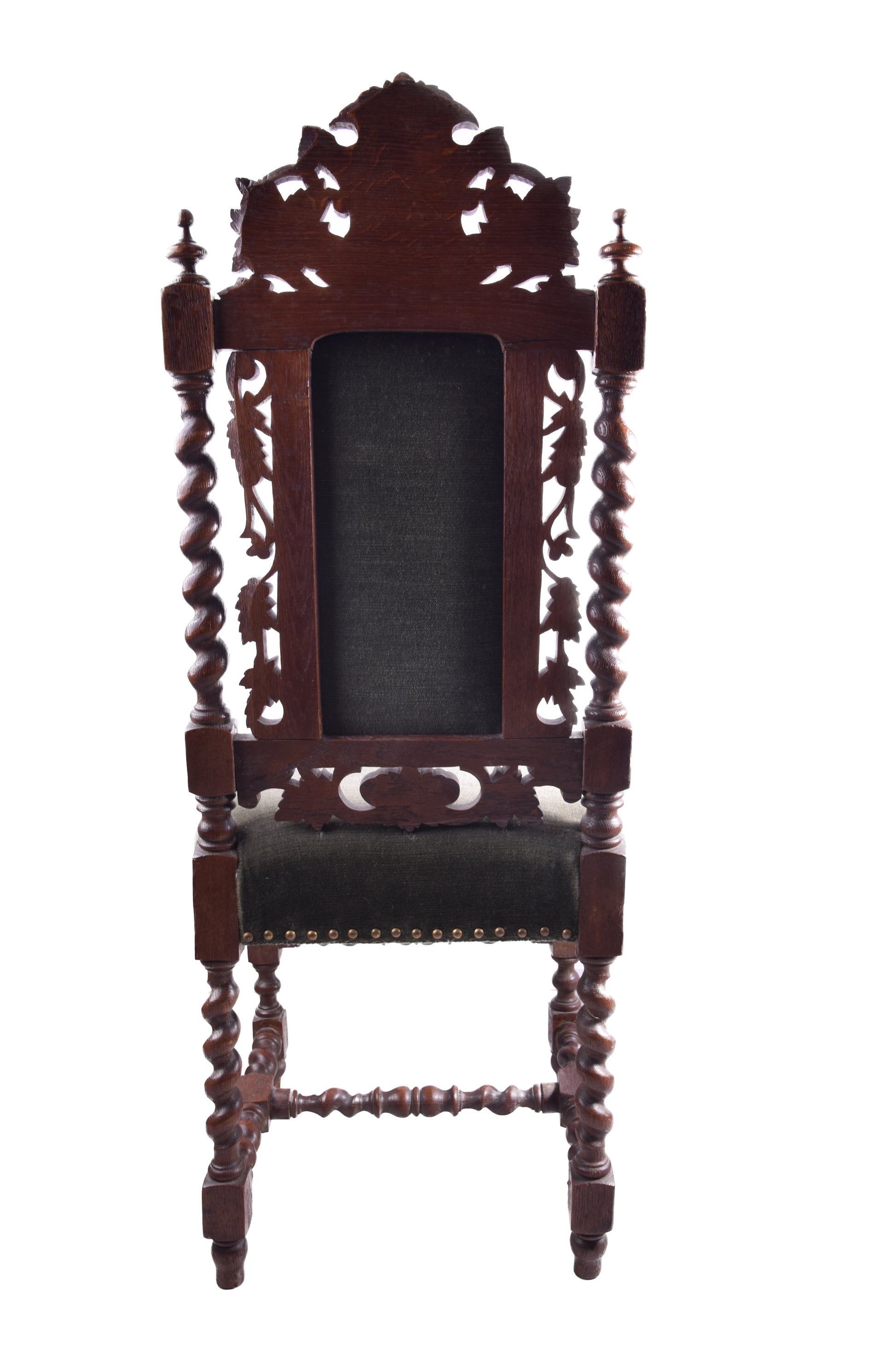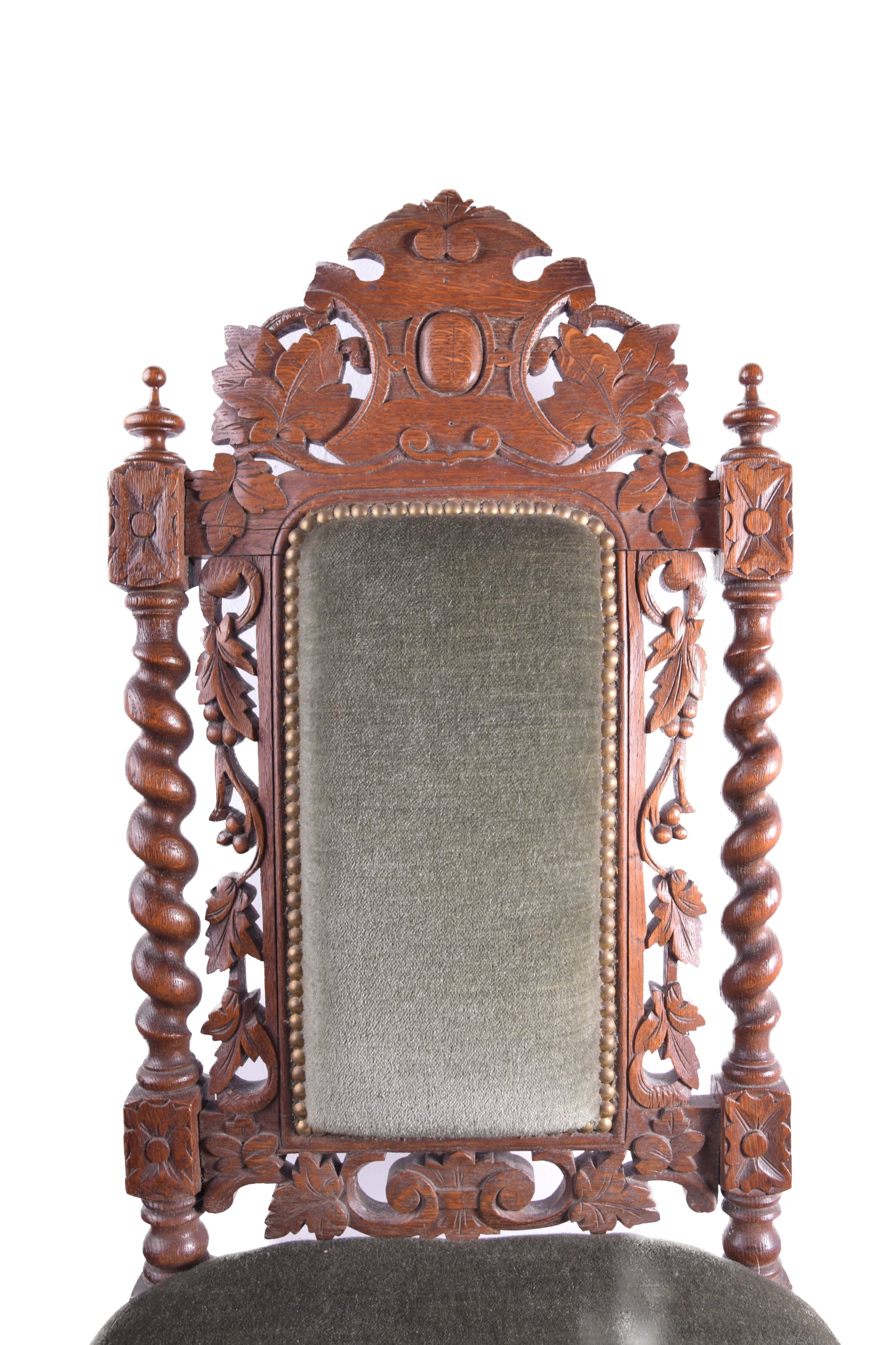 - Oparcie: wysokie, z ażurową dekoracją roślinną i centralnym medalionem (cartouche), po bokach kolumny typu „solomonowe” (skręcone).