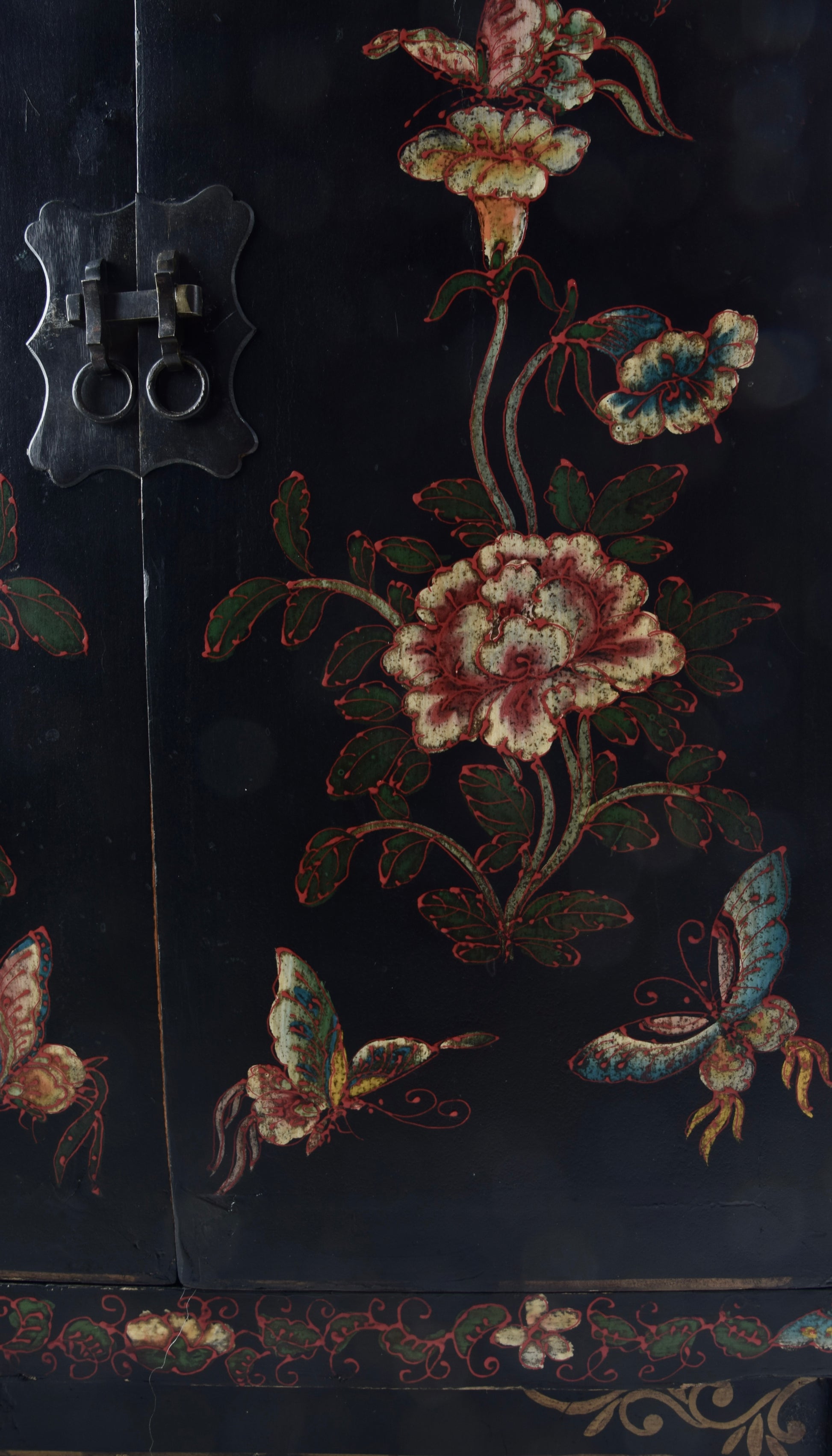 Mebel dekorowany tradycyjną techniką malarską – motywy kwiatów i motyli zostały wykonane ręcznie, z wyraźnie widocznym konturem i subtelnym cieniowaniem kolorów. Złote oraz czerwone linie podkreślają detale i nadają całości elegancki, orientalny charakter.