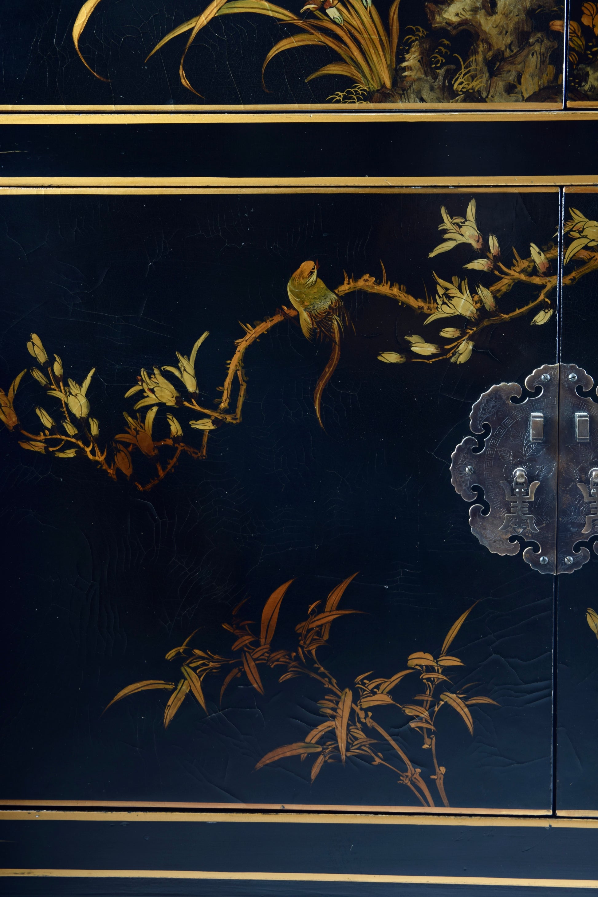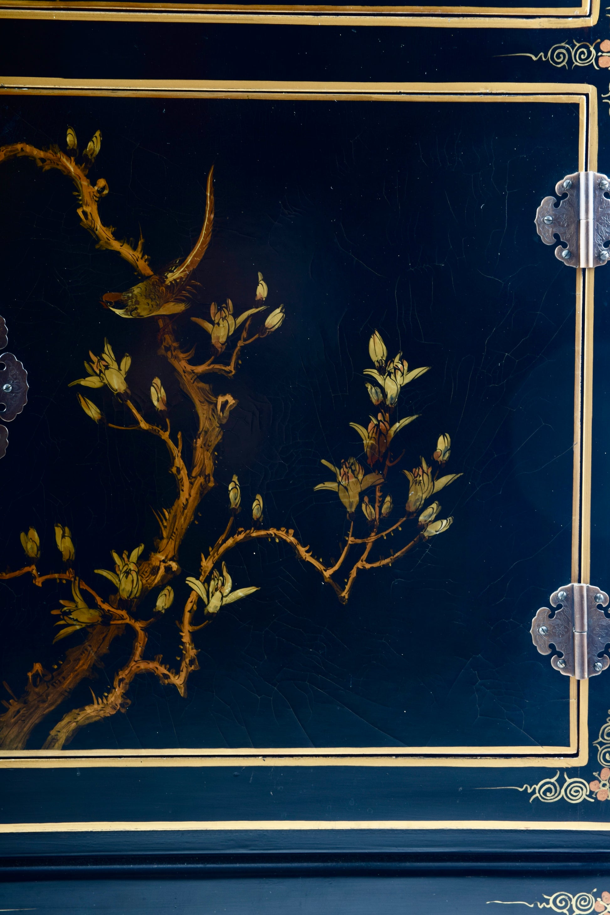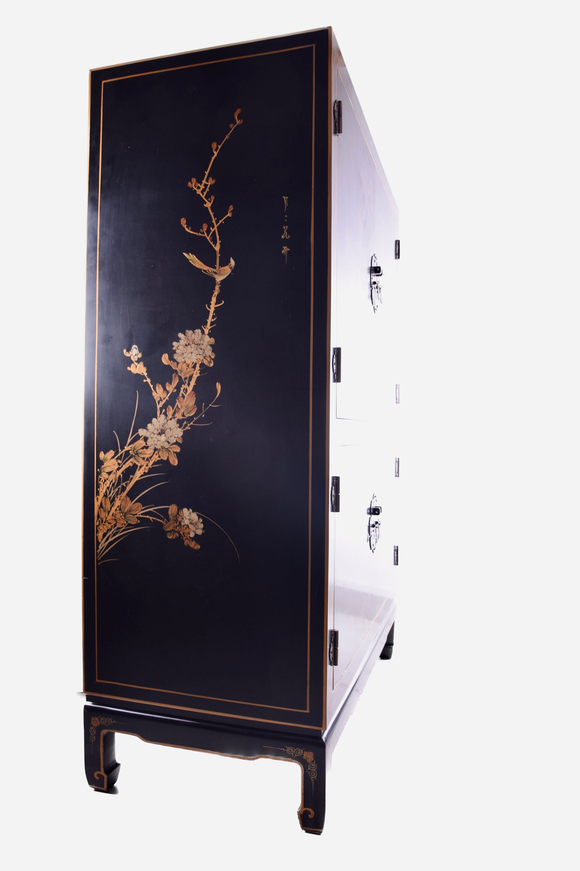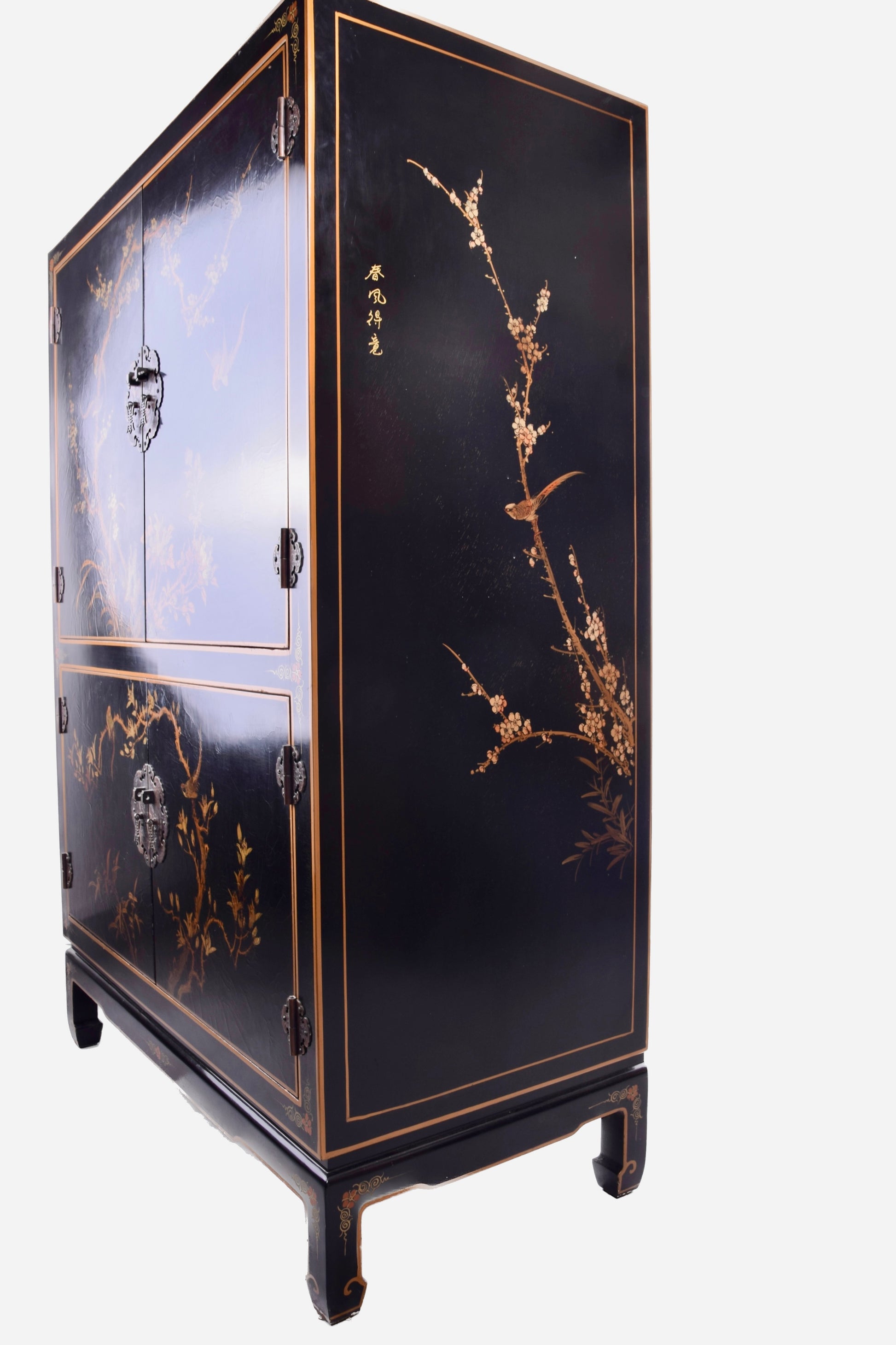 Ręcznie malowana szafa o niezwykłej harmonii formy i koloru, będąca przykładem klasycznego kunsztu dalekowschodniego rzemiosła artystycznego. Jej powierzchnię zdobi bogata, lecz wyważona dekoracja malarska – delikatne gałęzie w rozkwicie, ptaki i liście, przedstawione na głębokim, czarnym tle o subtelnym połysku.
