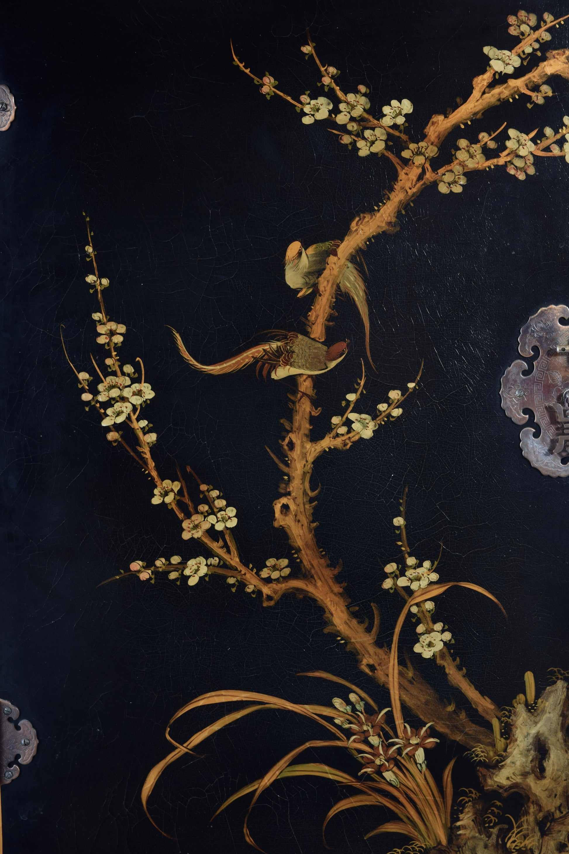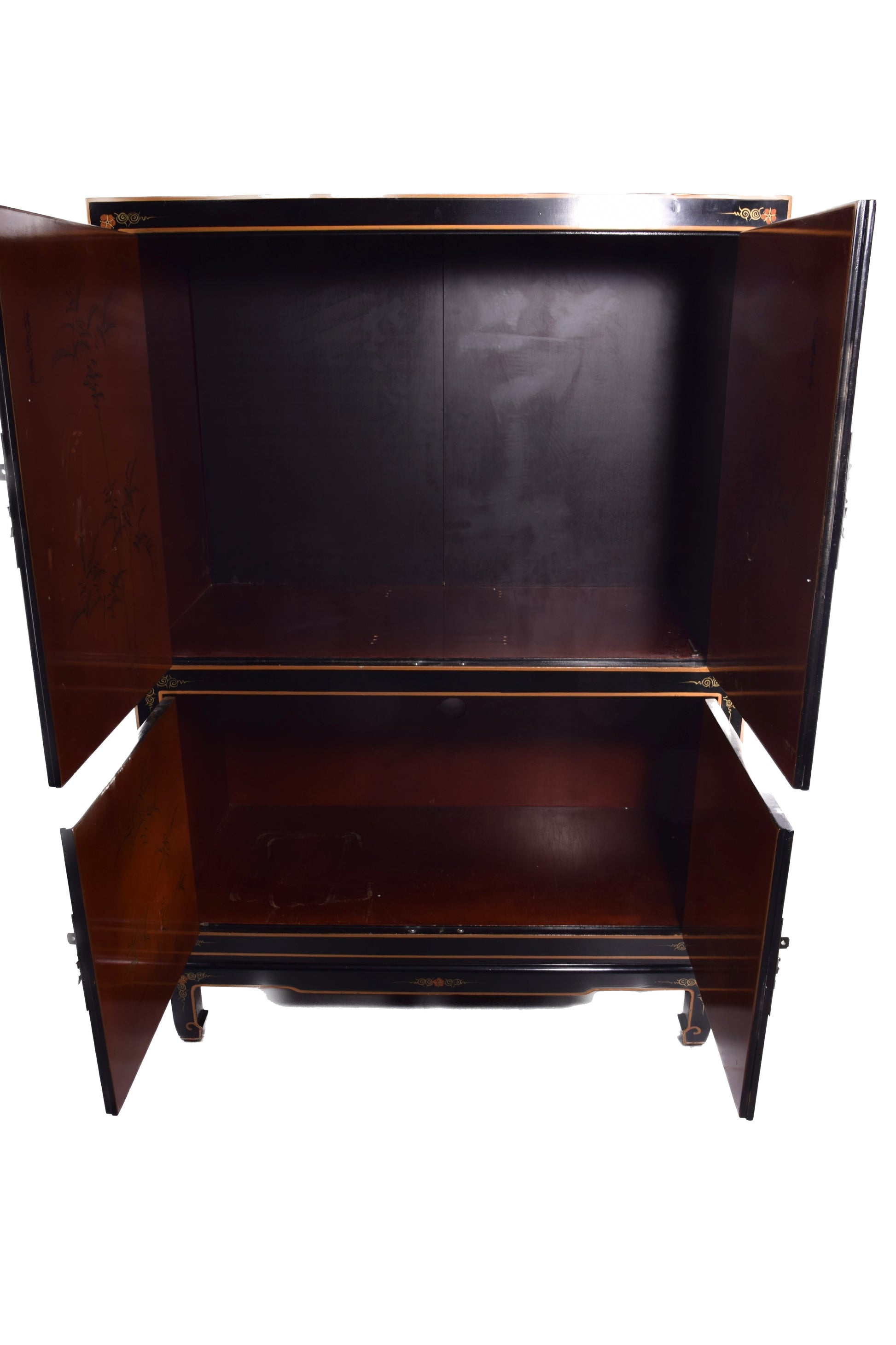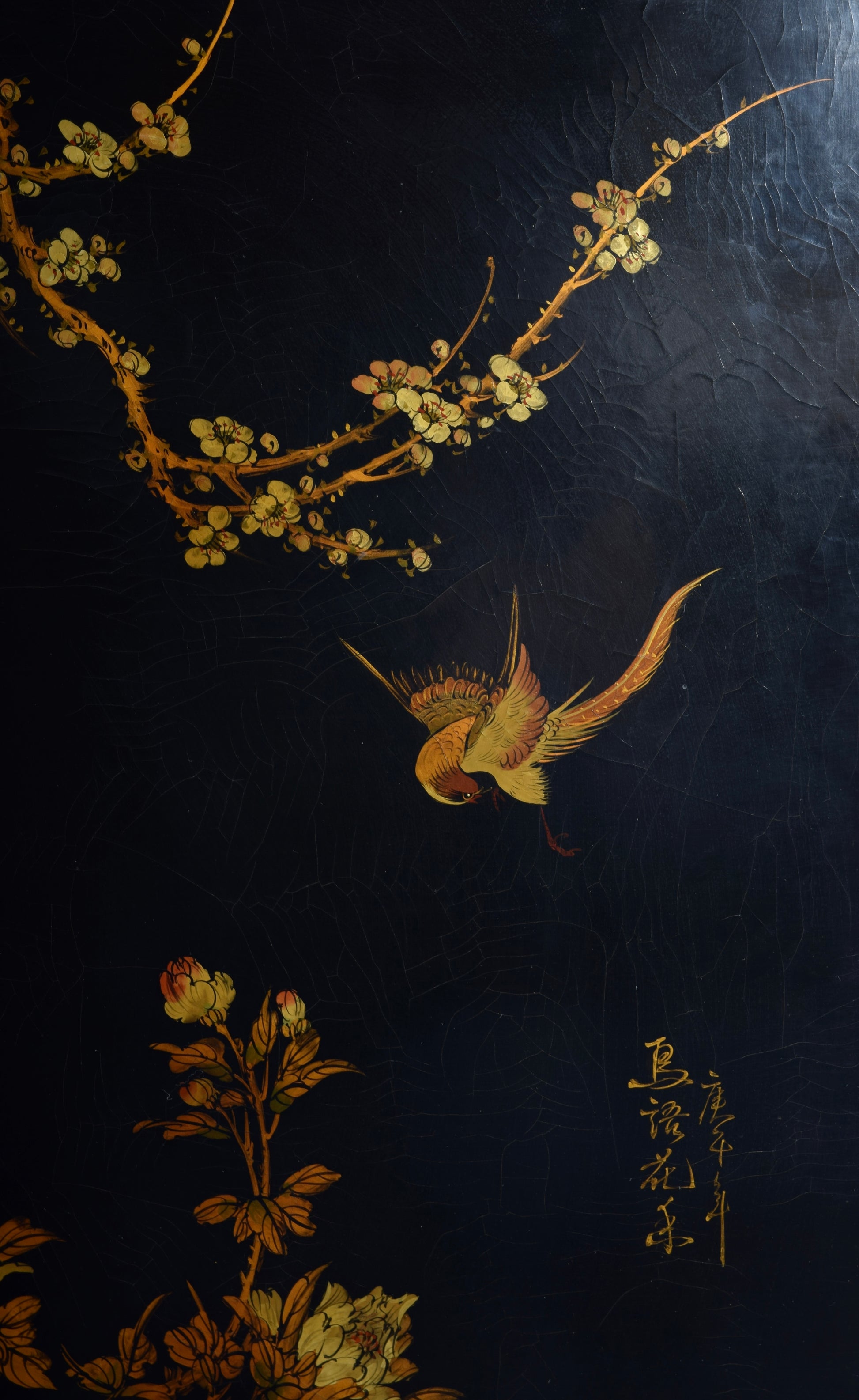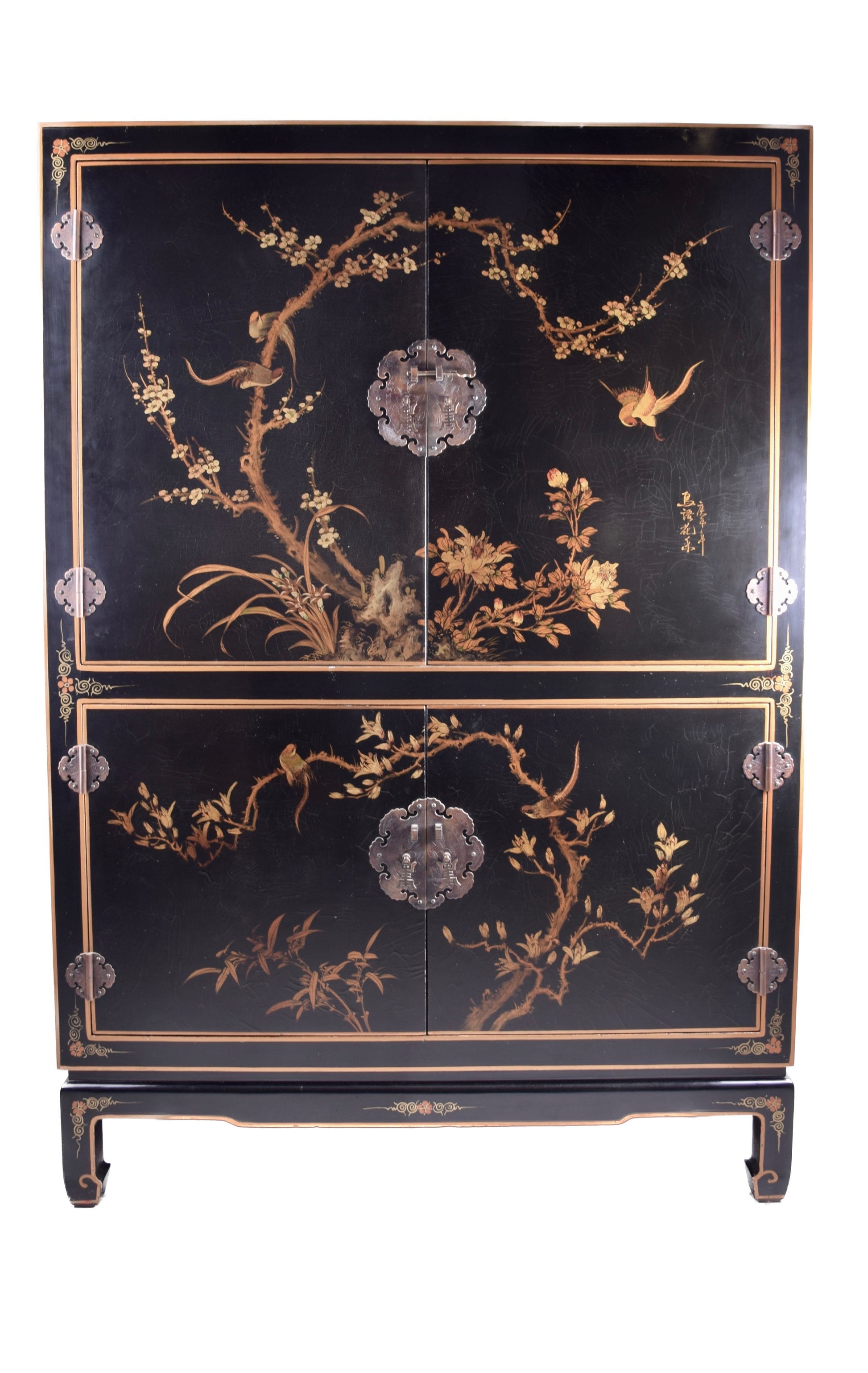 Ręcznie malowana szafa o niezwykłej harmonii formy i koloru, będąca przykładem klasycznego kunsztu dalekowschodniego rzemiosła artystycznego. Jej powierzchnię zdobi bogata, lecz wyważona dekoracja malarska – delikatne gałęzie w rozkwicie, ptaki i liście, przedstawione na głębokim, czarnym tle o subtelnym połysku.