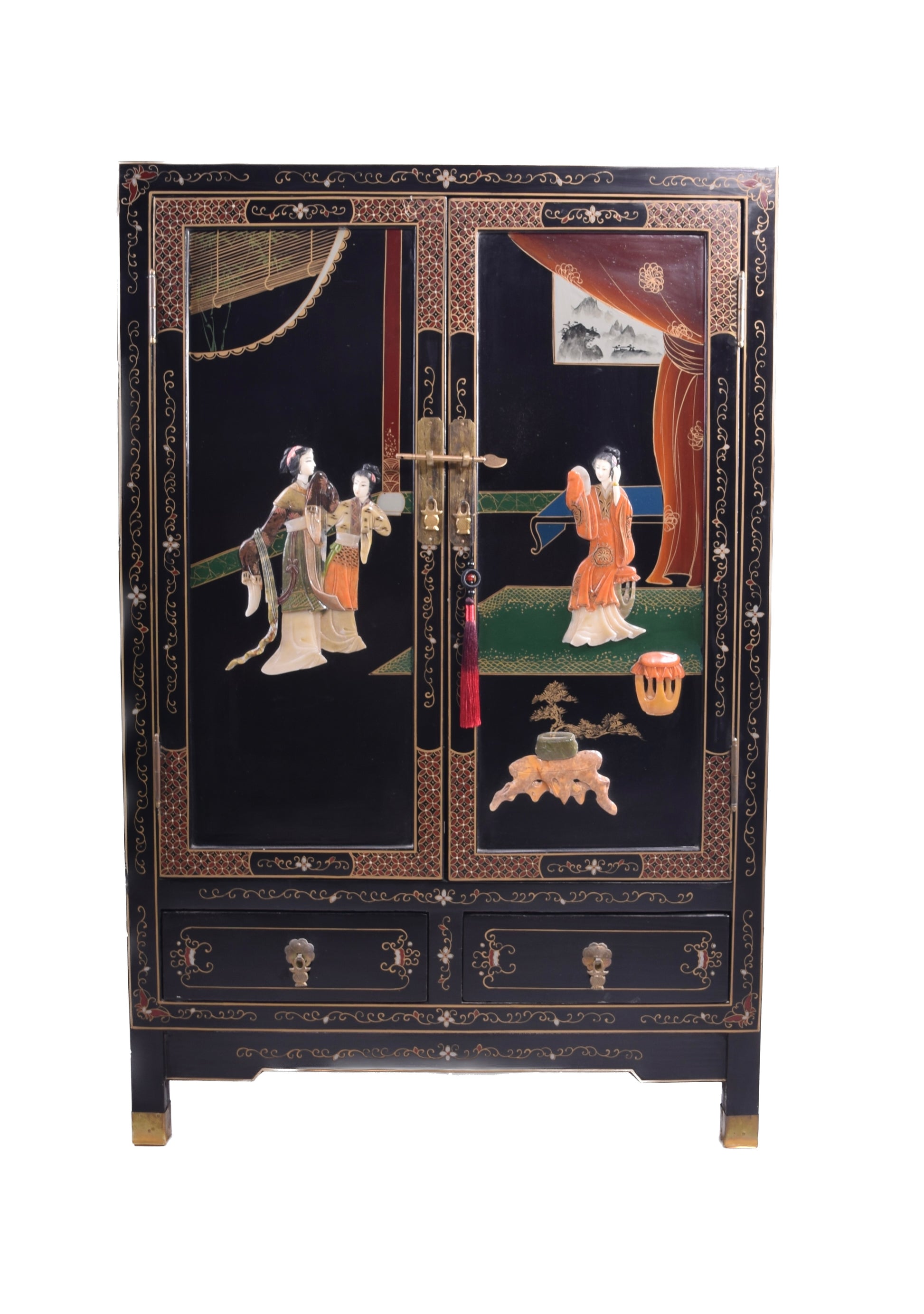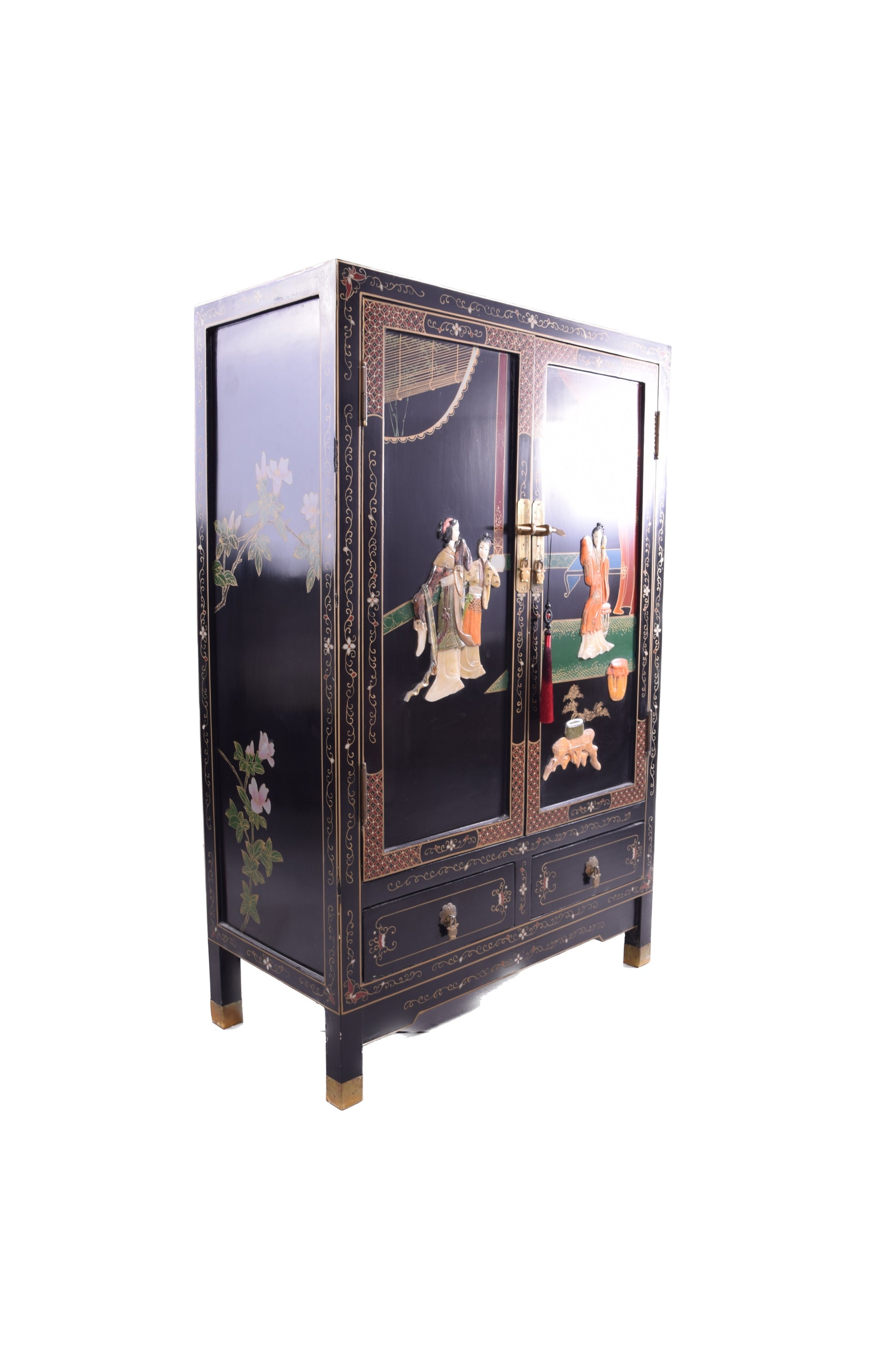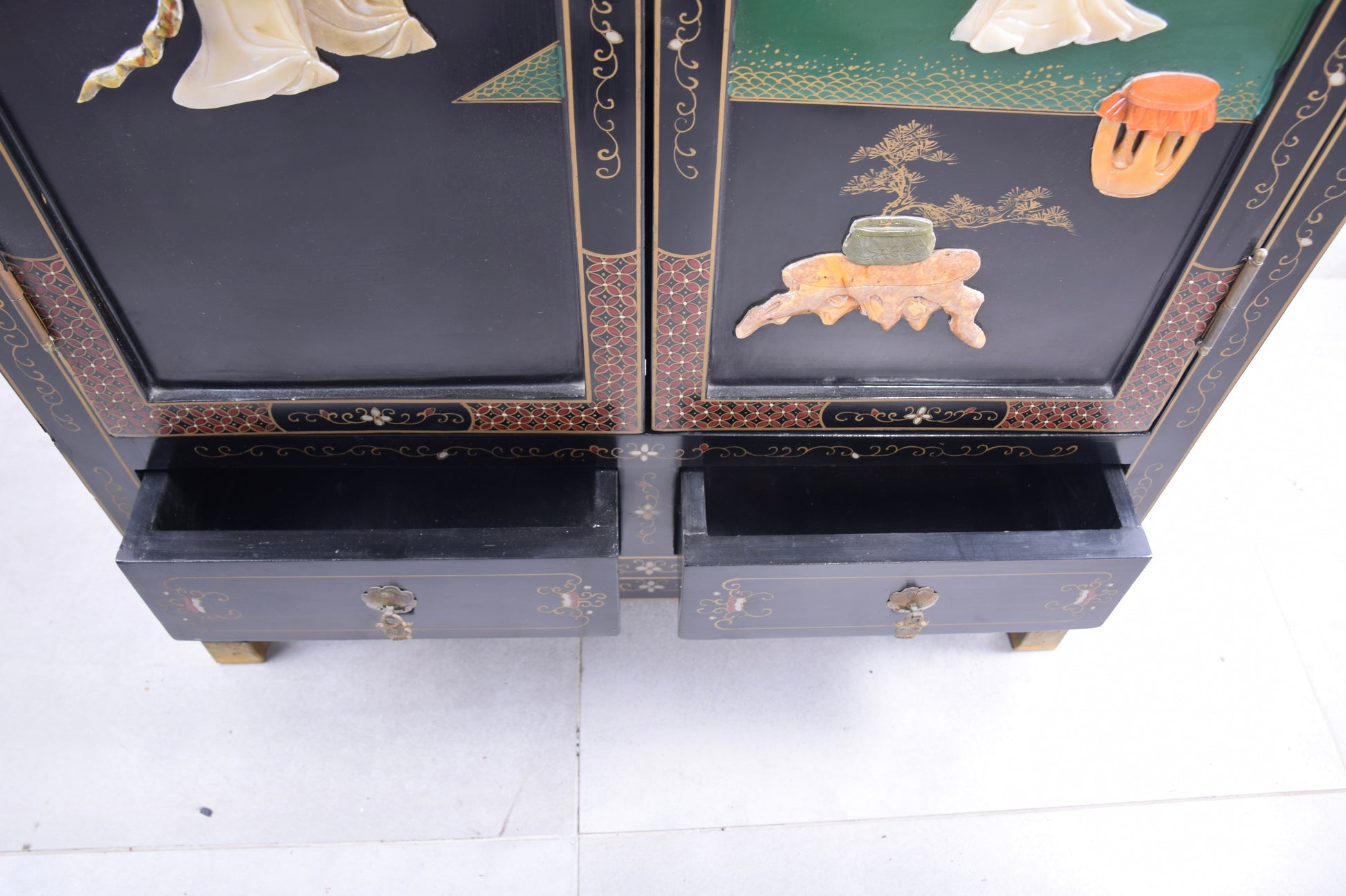 Elegancka, orientalna szafka lakierowana wykonana w Chinach, ozdobiona ręcznie malowanymi motywami i bogatymi aplikacjami z masy perłowej i kamieni półszlachetnych (jadeit, onyks, marmur).