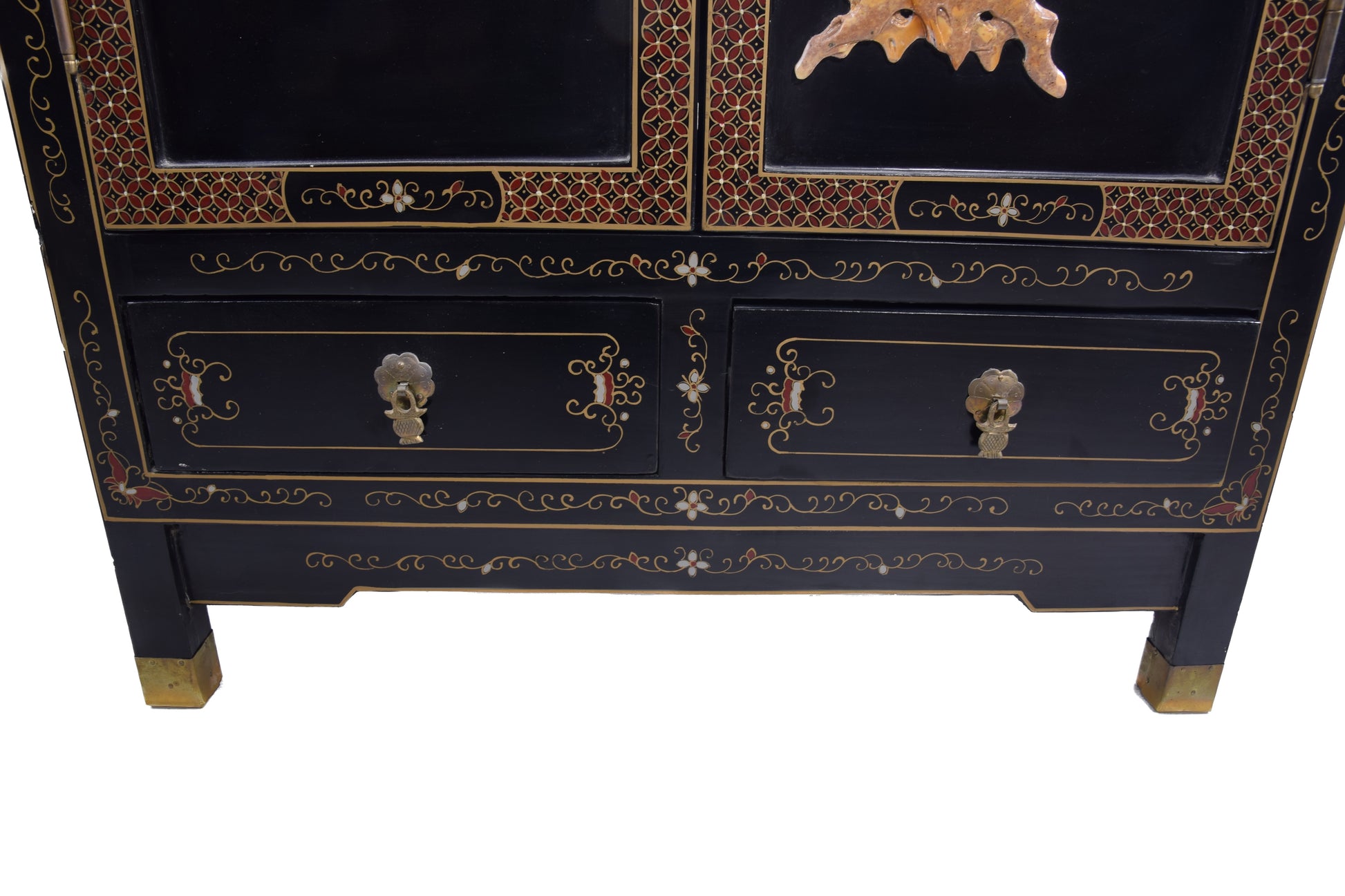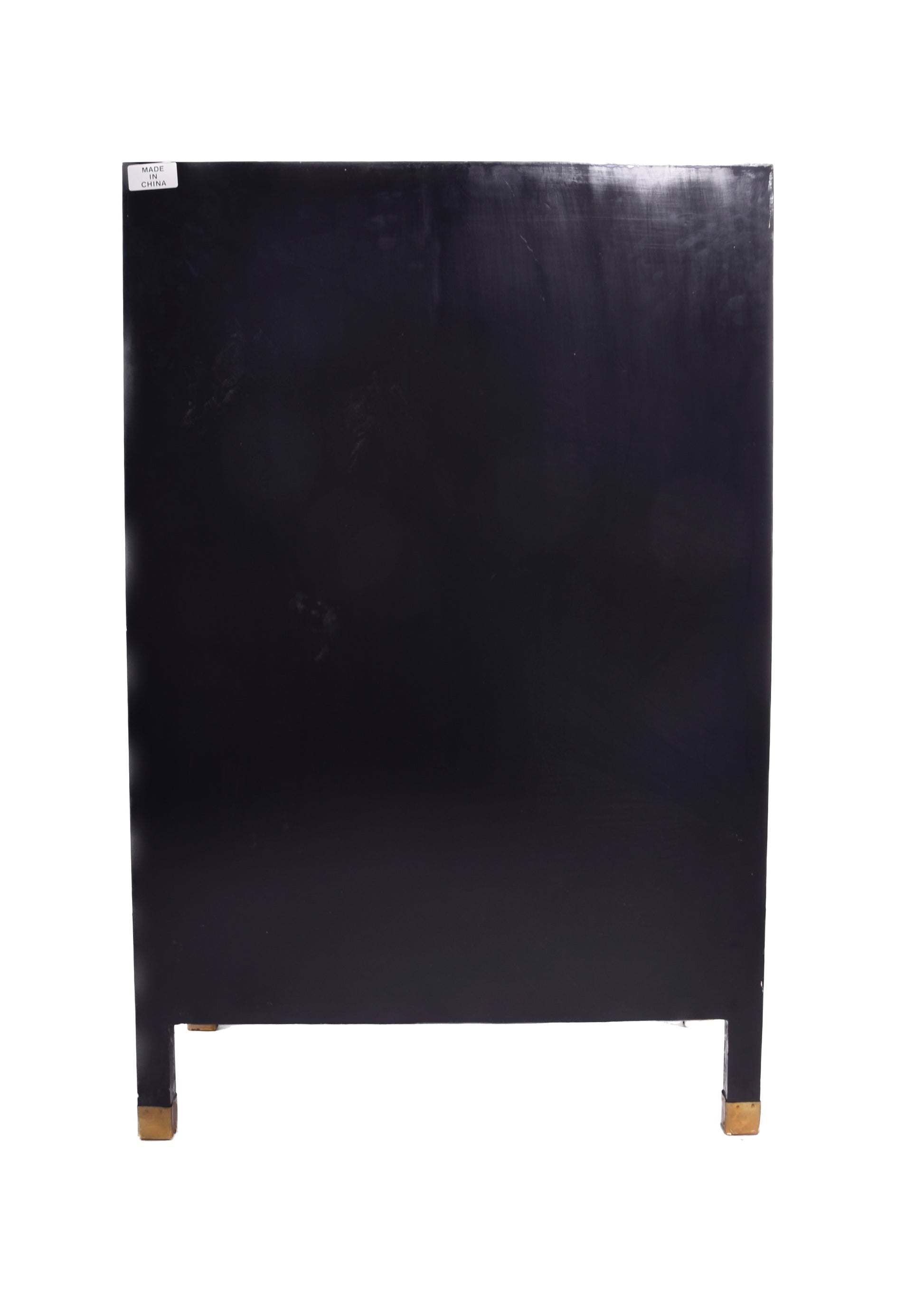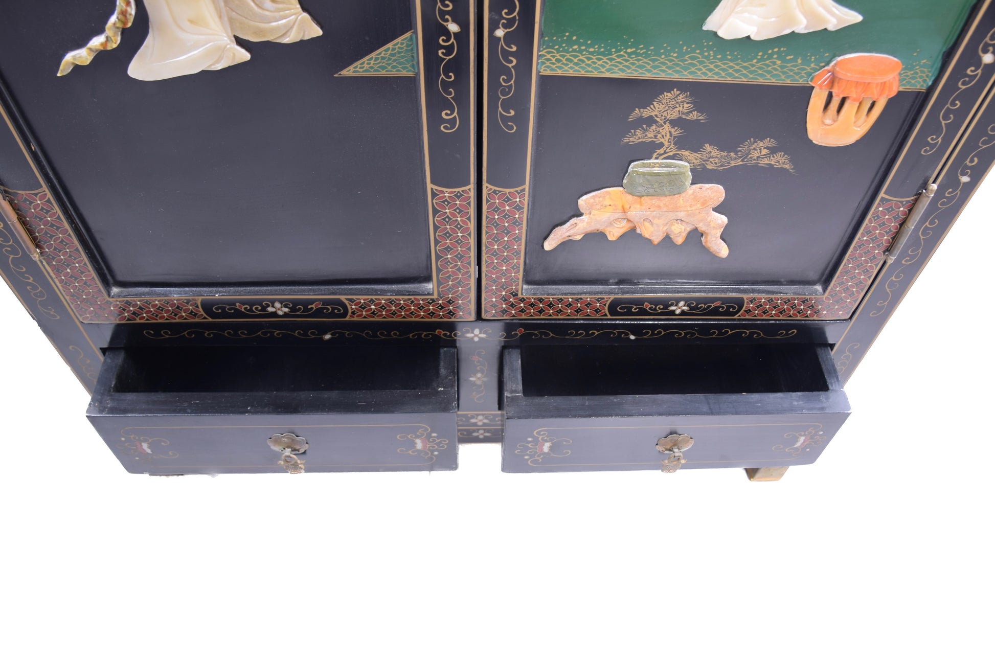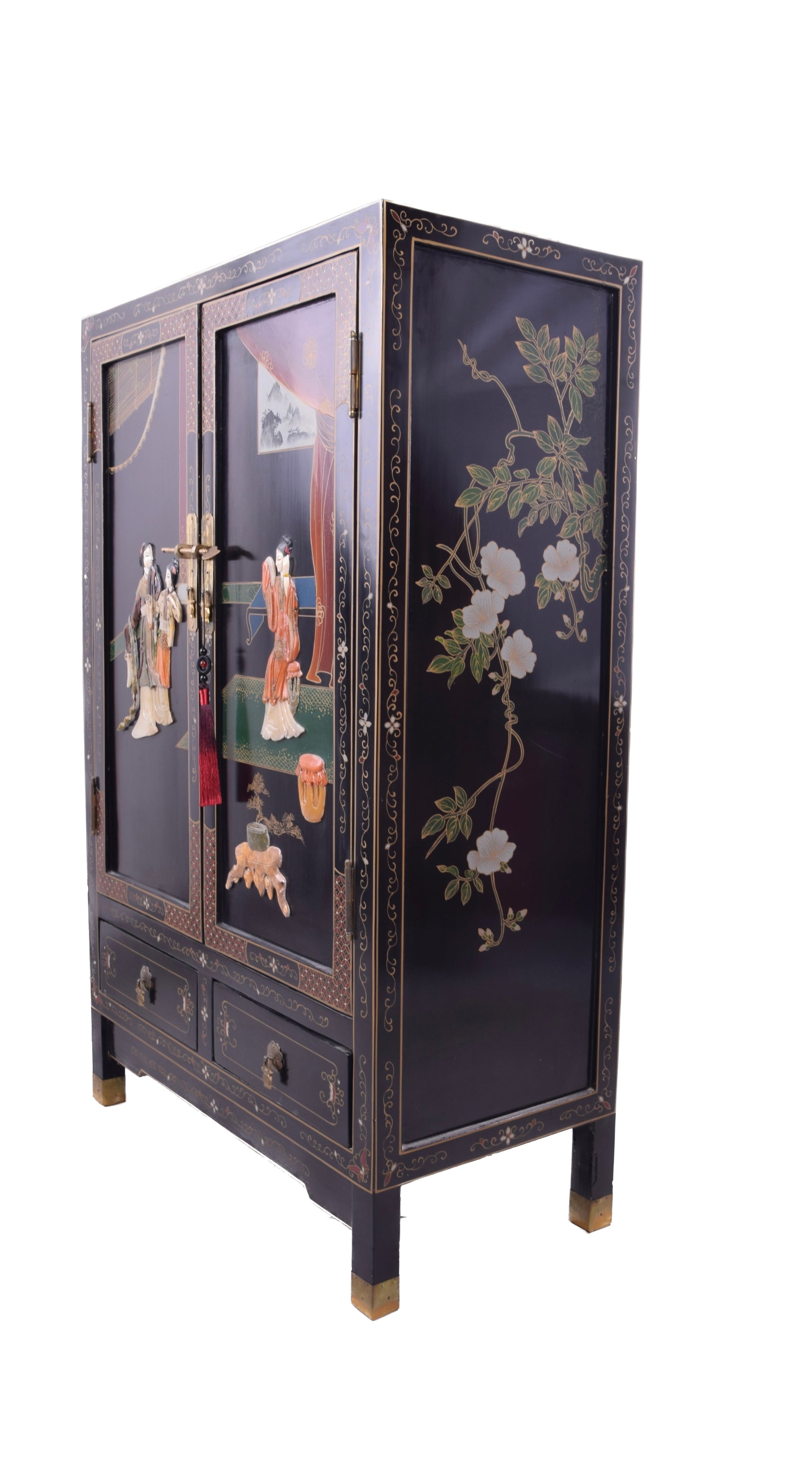 Elegancka, orientalna szafka lakierowana wykonana w Chinach, ozdobiona ręcznie malowanymi motywami i bogatymi aplikacjami z masy perłowej i kamieni półszlachetnych (jadeit, onyks, marmur).