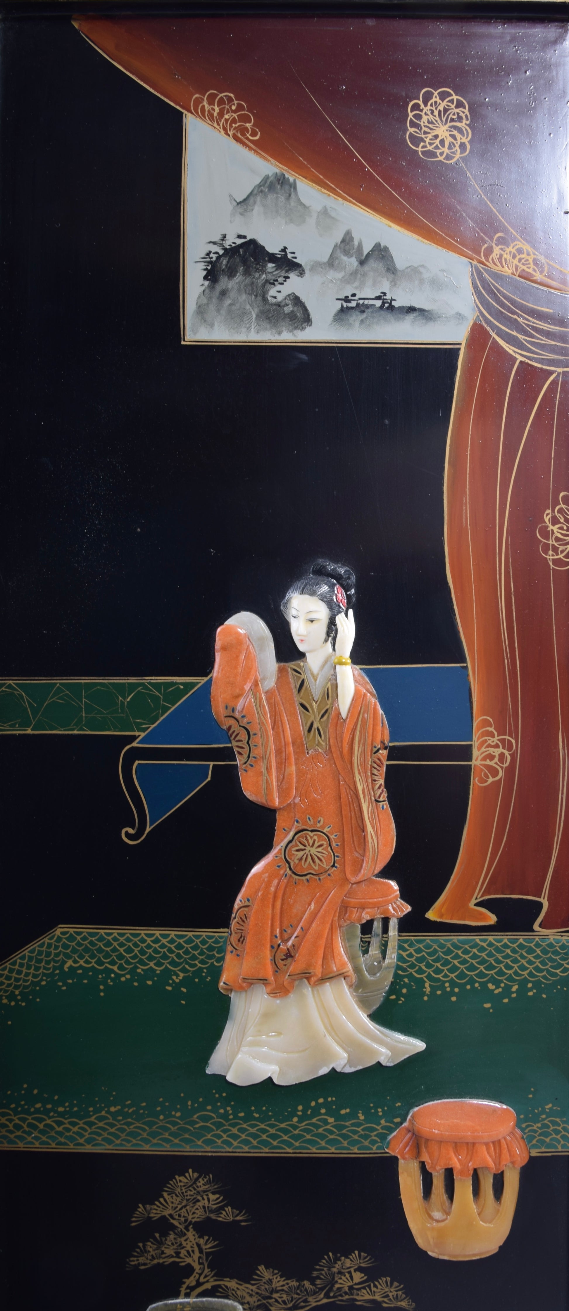 Front zdobią sceny dworskie z postaciami kobiet w tradycyjnych szatach, przedstawione w technice reliefu, z delikatnymi detalami i złotymi zdobieniami.