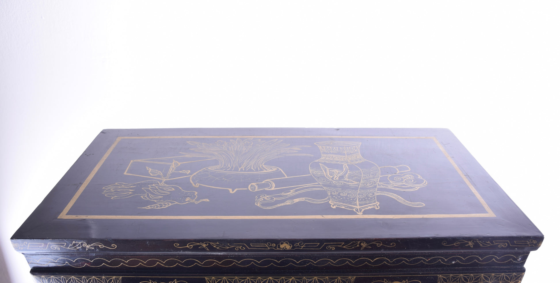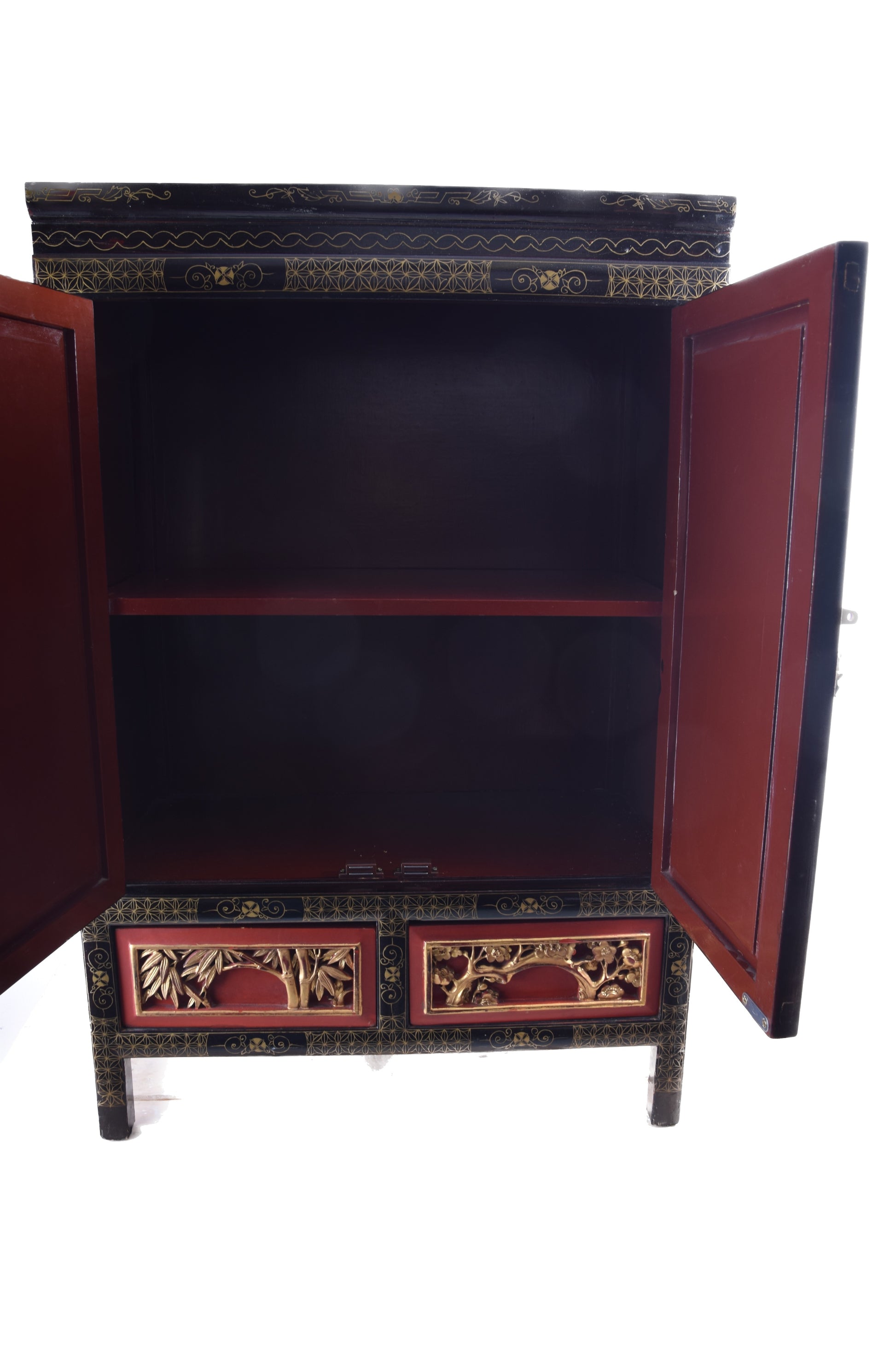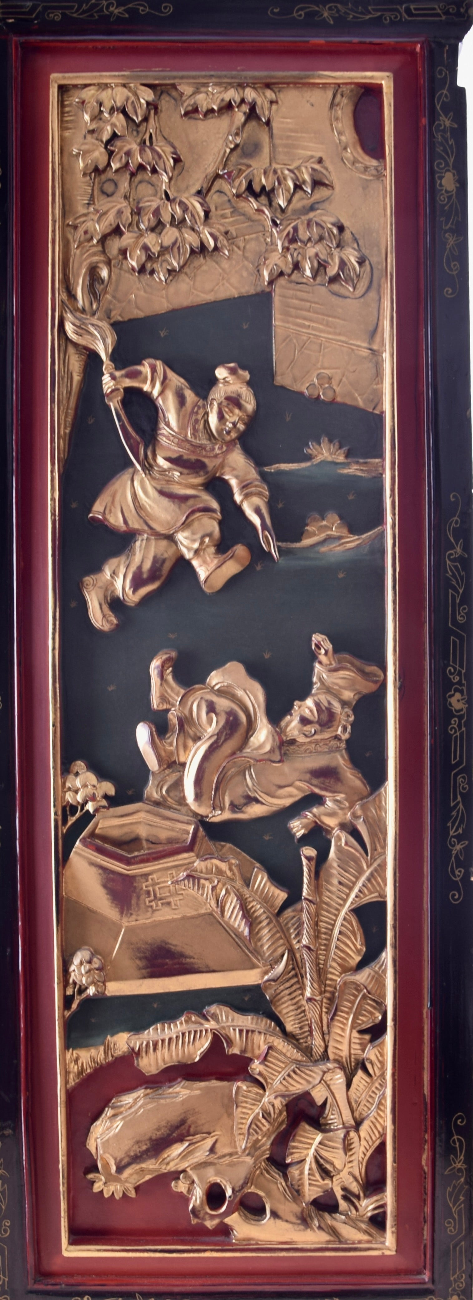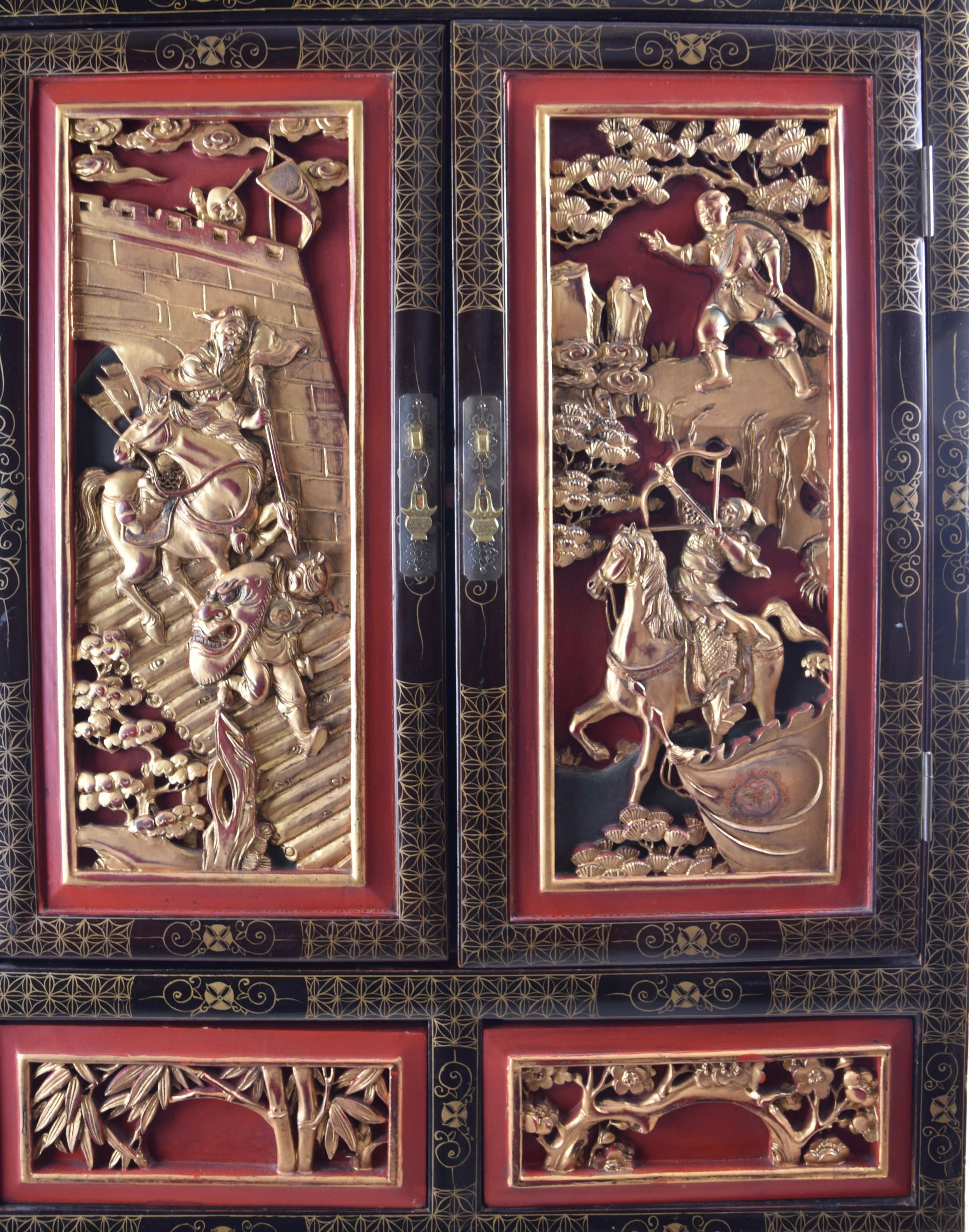Wyjątkowa dekoracyjna szafka w tradycji chińskich mebli ludowych, bogato zdobiona ręcznie rzeźbionymi i złoconymi panelami reliefowymi. Przedstawiają one dynamiczne sceny militarne z wojownikami konnymi oraz bogate tło pejzażowe: pagody, drzewa, skały i chmury stylizowane zgodnie z estetyką sztuki dynastii Qing.