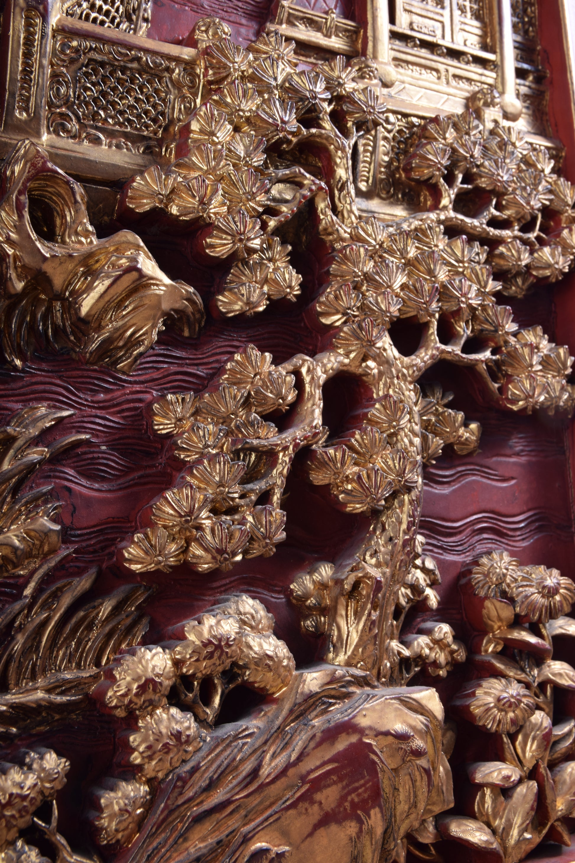 Oferowany panel jest przykładem dekoracyjnej rzeźby ściennej nawiązującej do tradycji artystycznej okresu dynastii Qing. Tego typu elementy zdobnicze występowały dawniej jako dekoracje świątyń, ołtarzy, parawanów lub mebli ceremonialnych. W drugiej połowie XX wieku zaczęto je produkować również na rynek eksportowy i wnętrzarski – stąd ich obecność w Europie i USA.