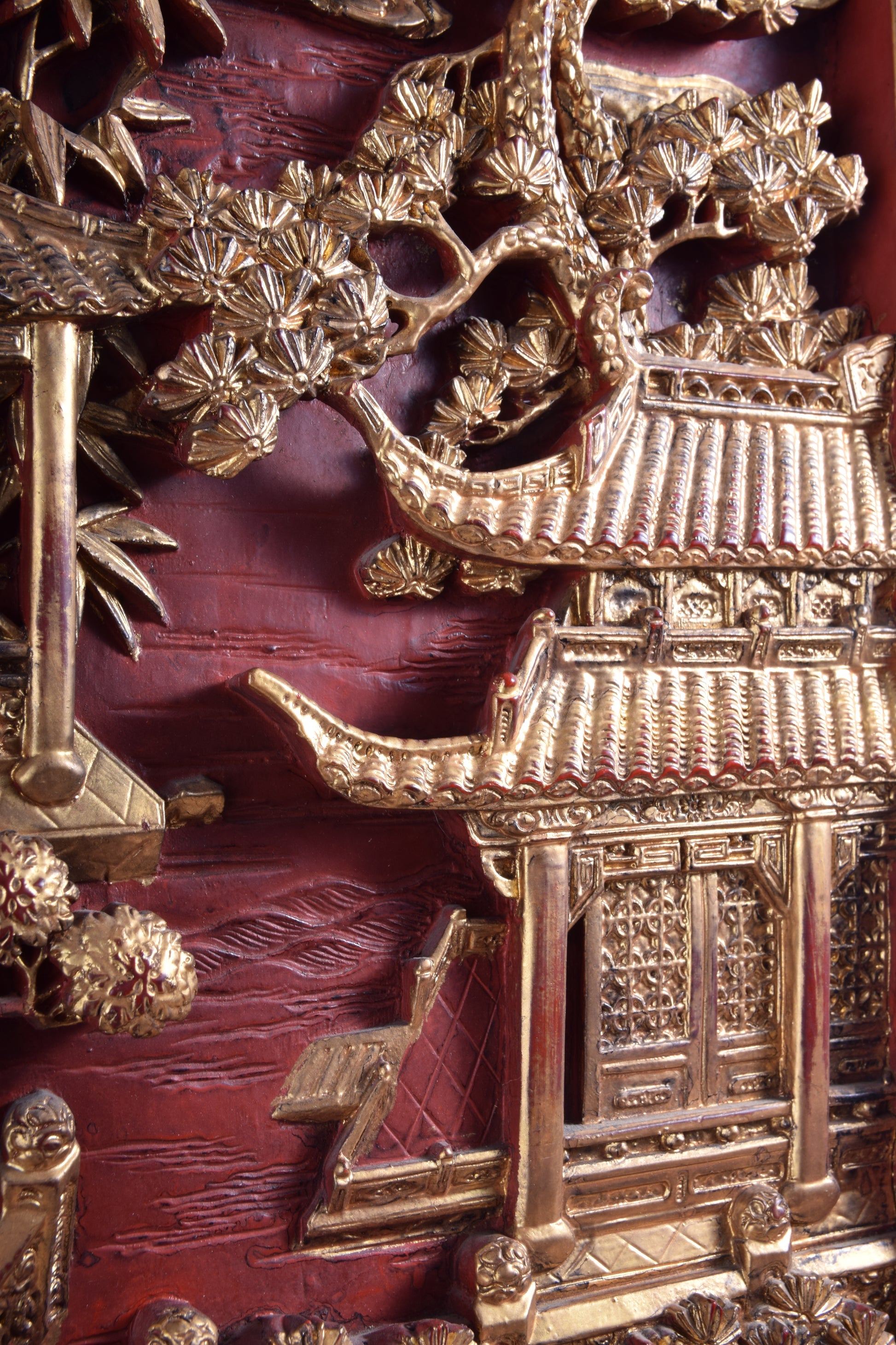 Chiński panel ścienny rzeźbiony ze złoconym pejzażem 81 x 40.5 x 3.5 cm