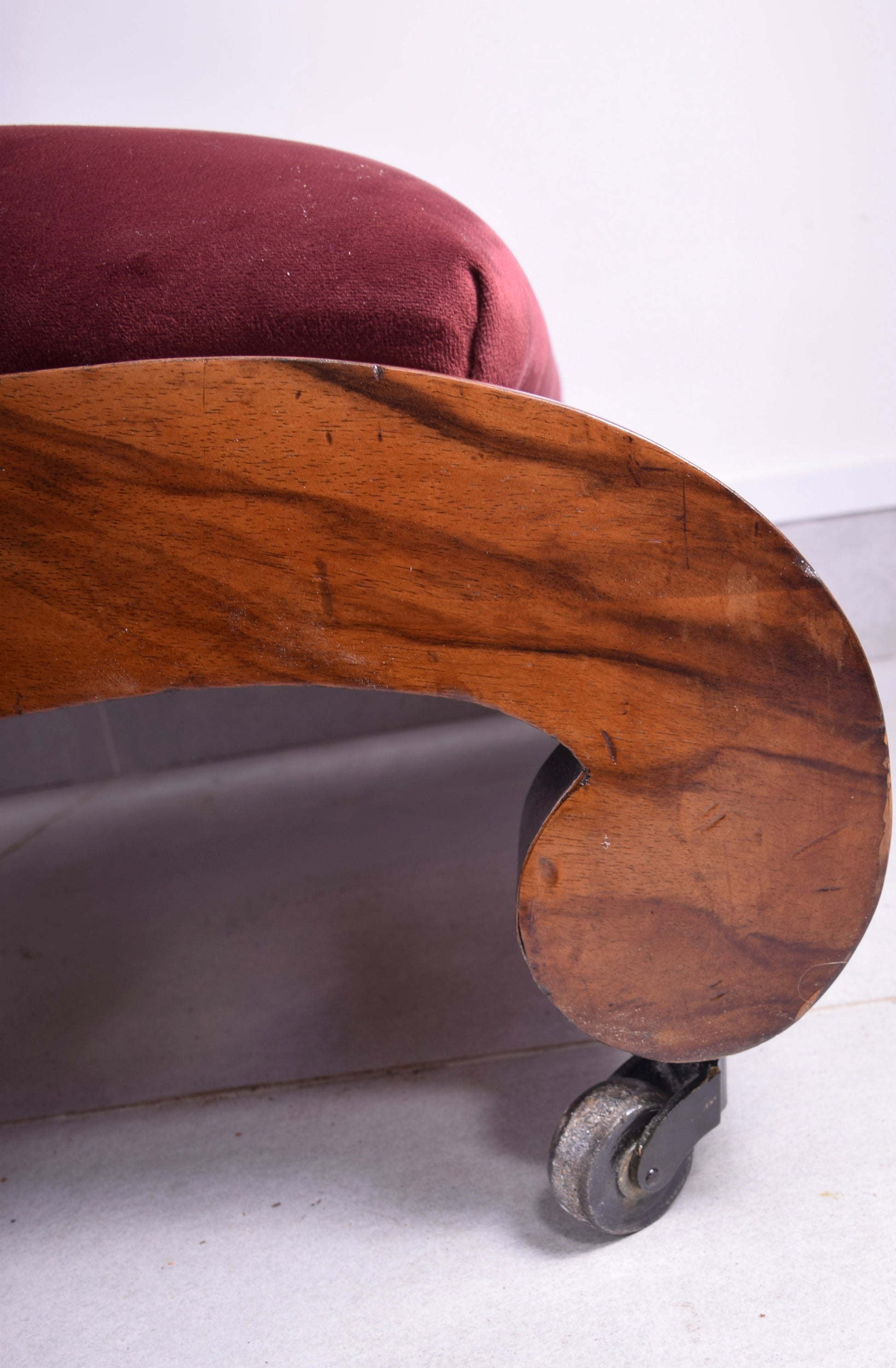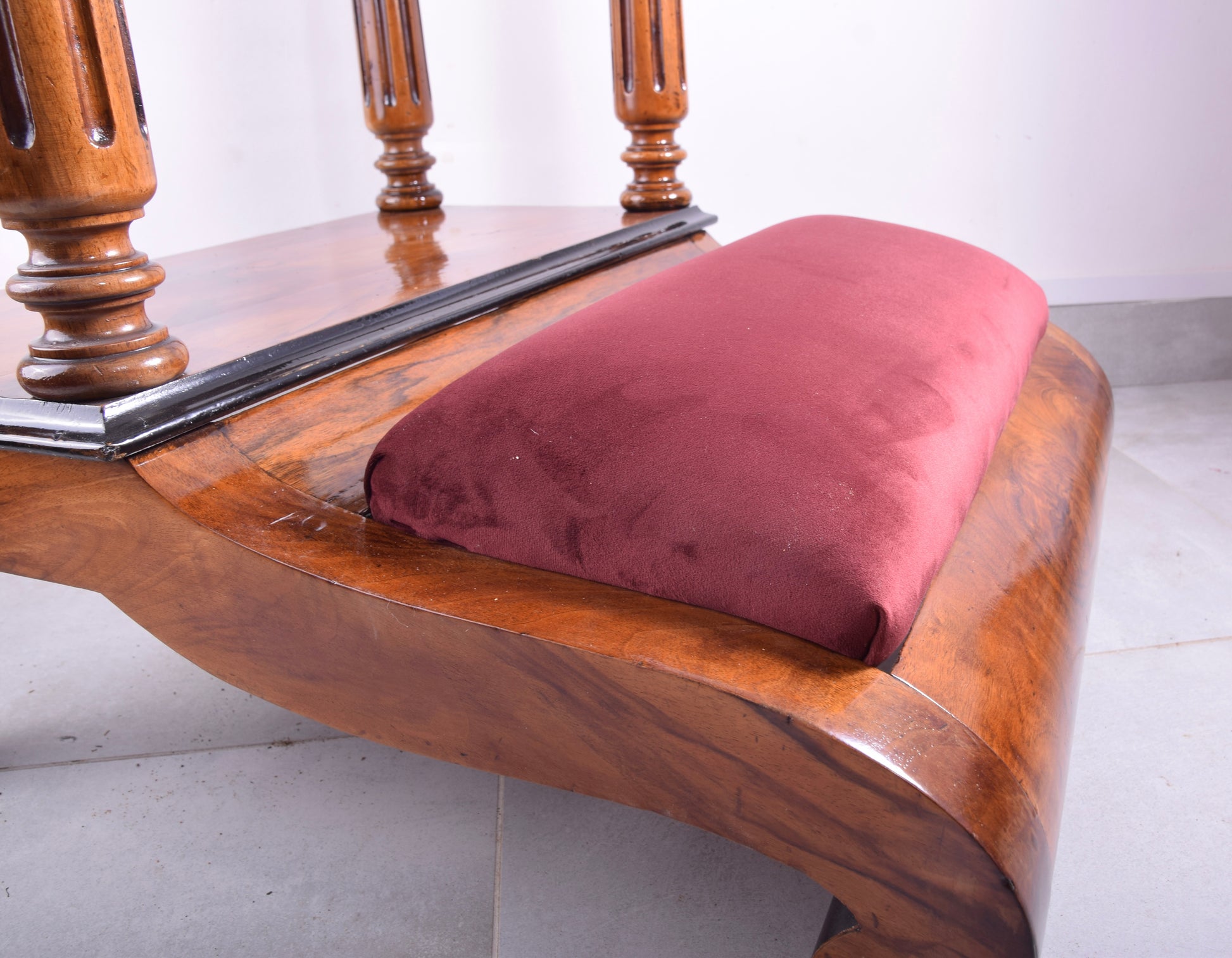 Drewno orzechowe fornirowane, elementy toczone i rzeźbione, politura szelakowa (odnowiona), welur ciemno bordowy, gwoździe tapicerskie mosiężne.