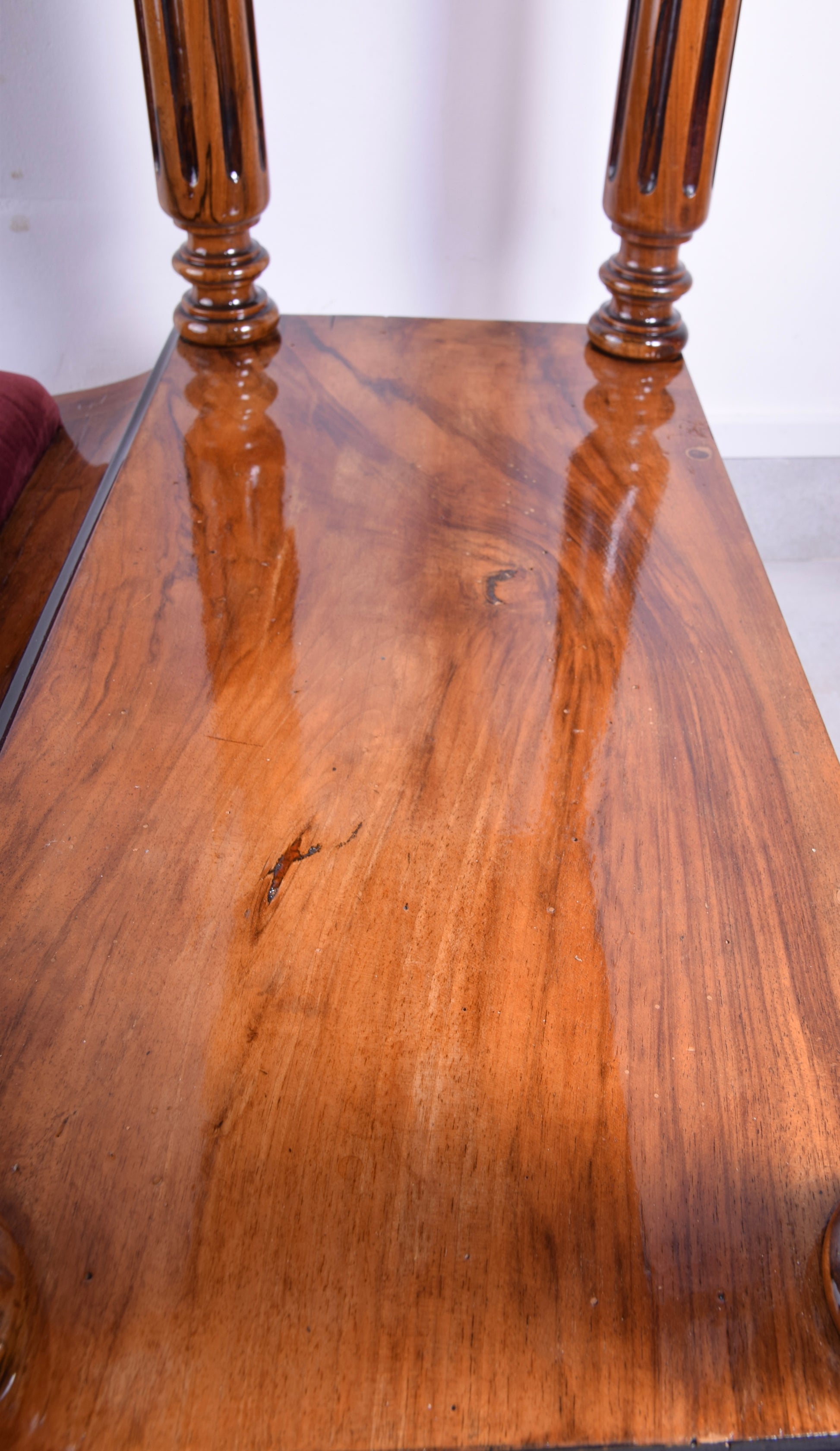 Mebel został oczyszczony i odnowiony – lakierowany, fornir orzechowy odzyskał pełną głębię barwy i połysk charakterystyczny dla drugiej połowy XIX wieku.