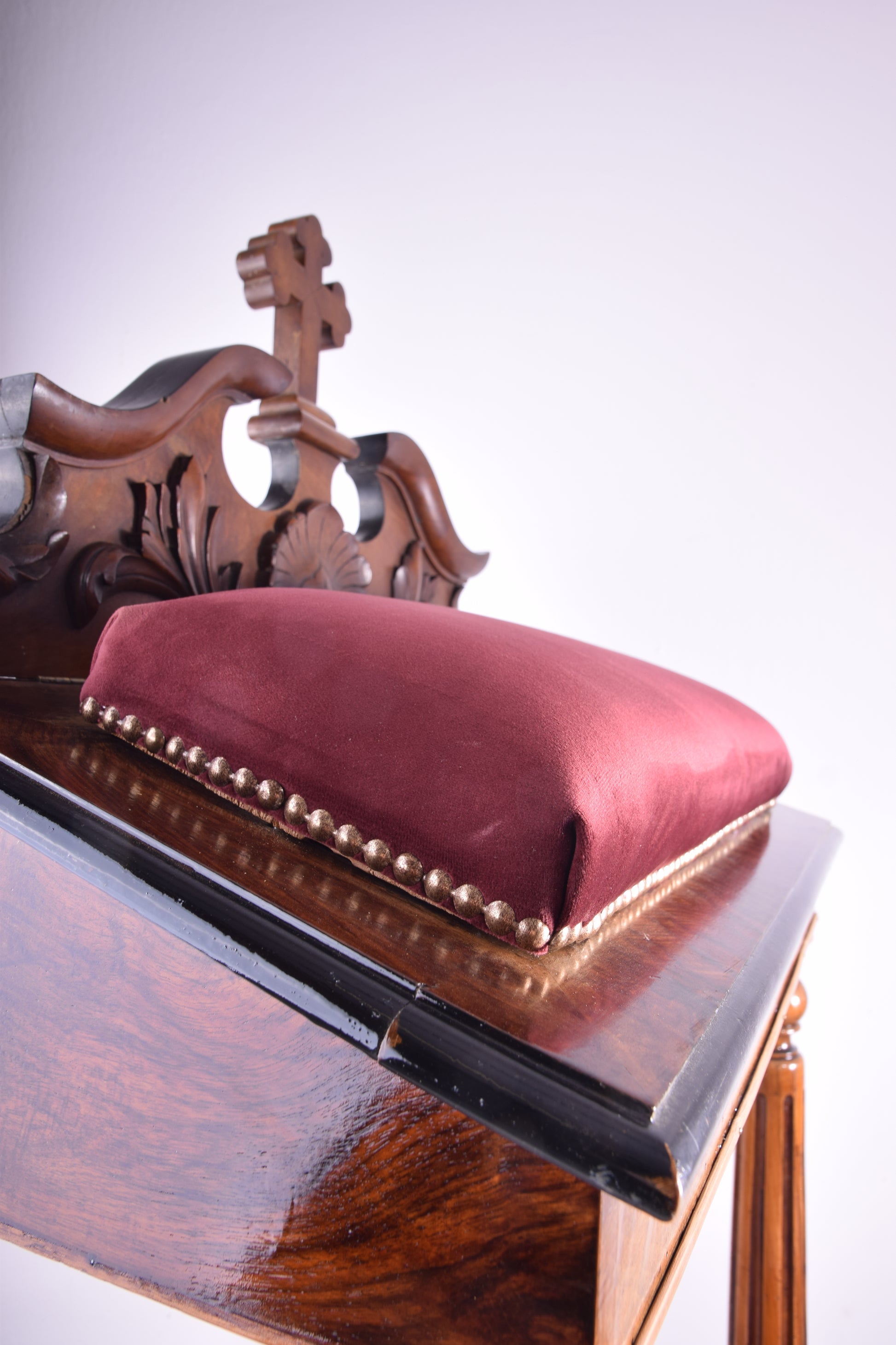Wyjątkowy przykład klęcznika domowego w stylu neobarokowym, o eleganckiej formie i doskonałych proporcjach. Konstrukcja wsparta na czterech toczonych kolumnach, dolna część stanowiąca podparcie na kolana o charakterystycznej, wygiętej formie. Oparcie zwieńczone rzeźbionym ornamentem muszli i liści akantu oraz centralnie osadzonym krzyżem łacińskim.