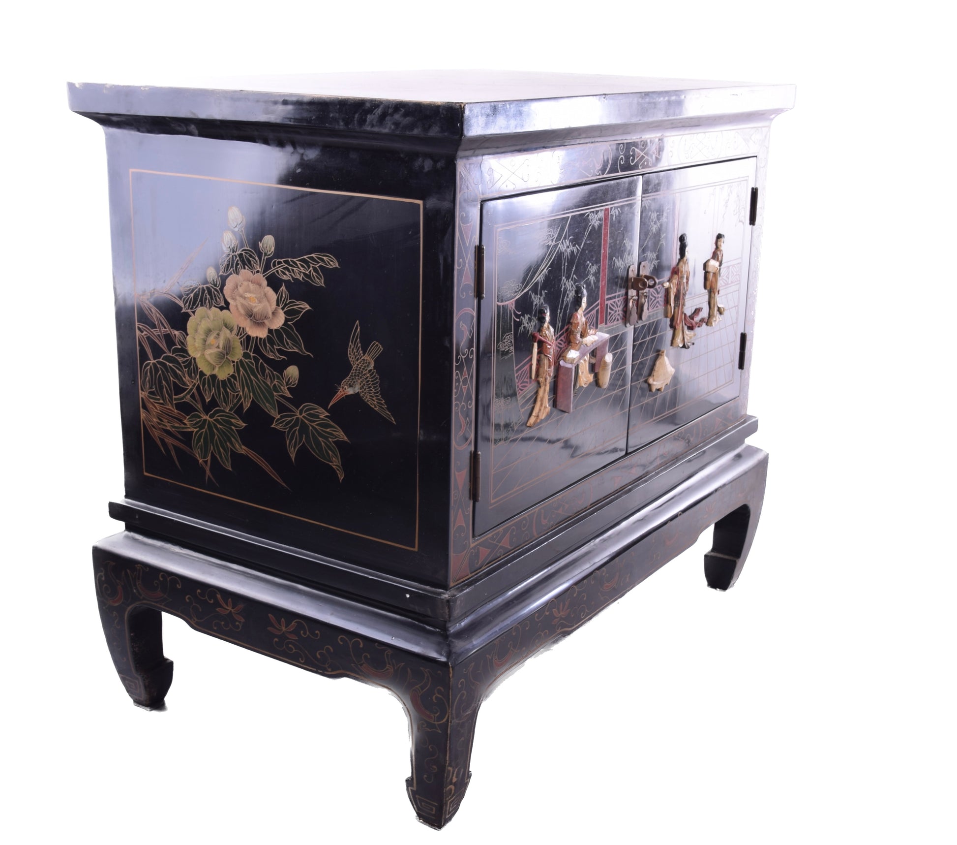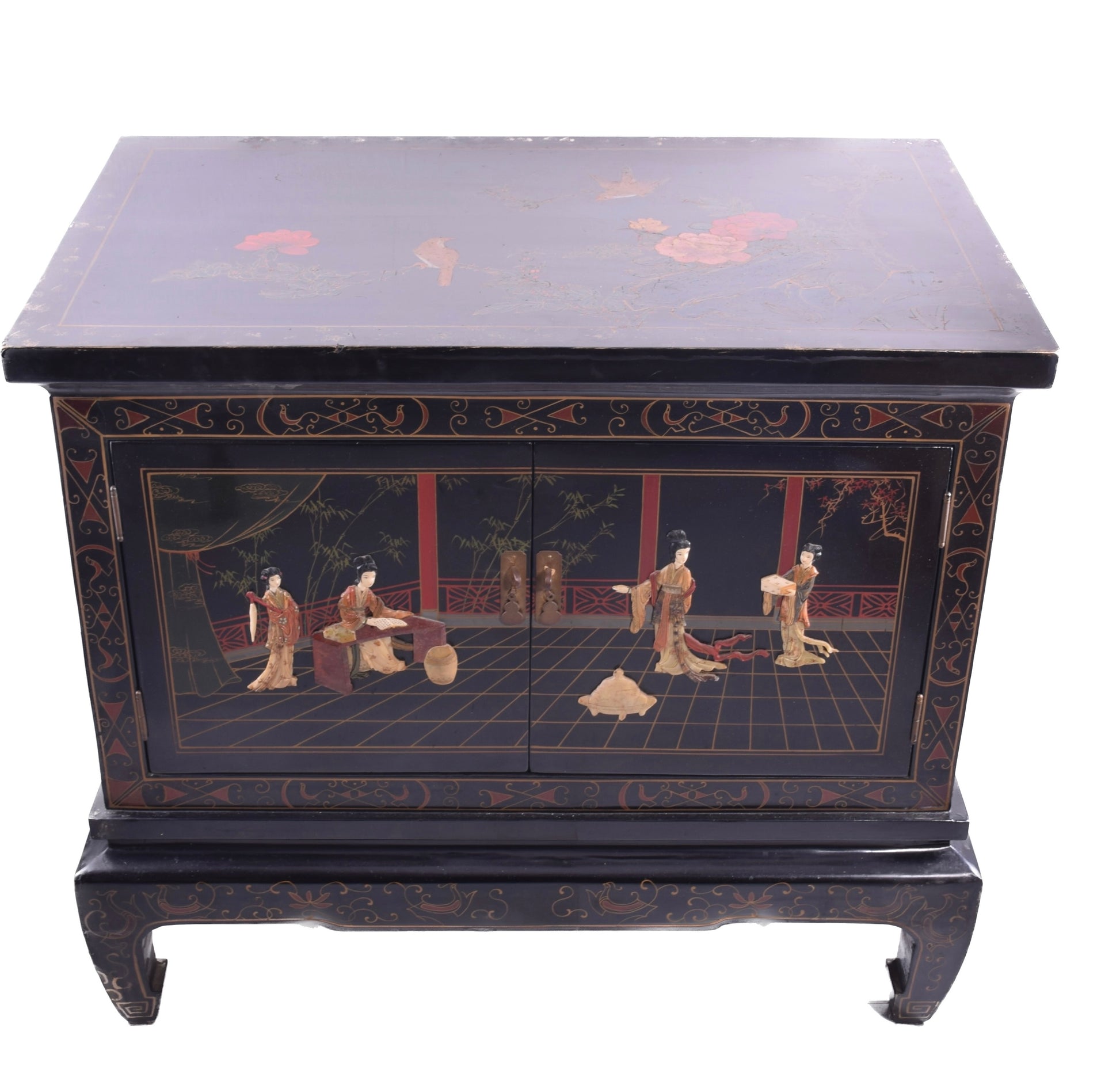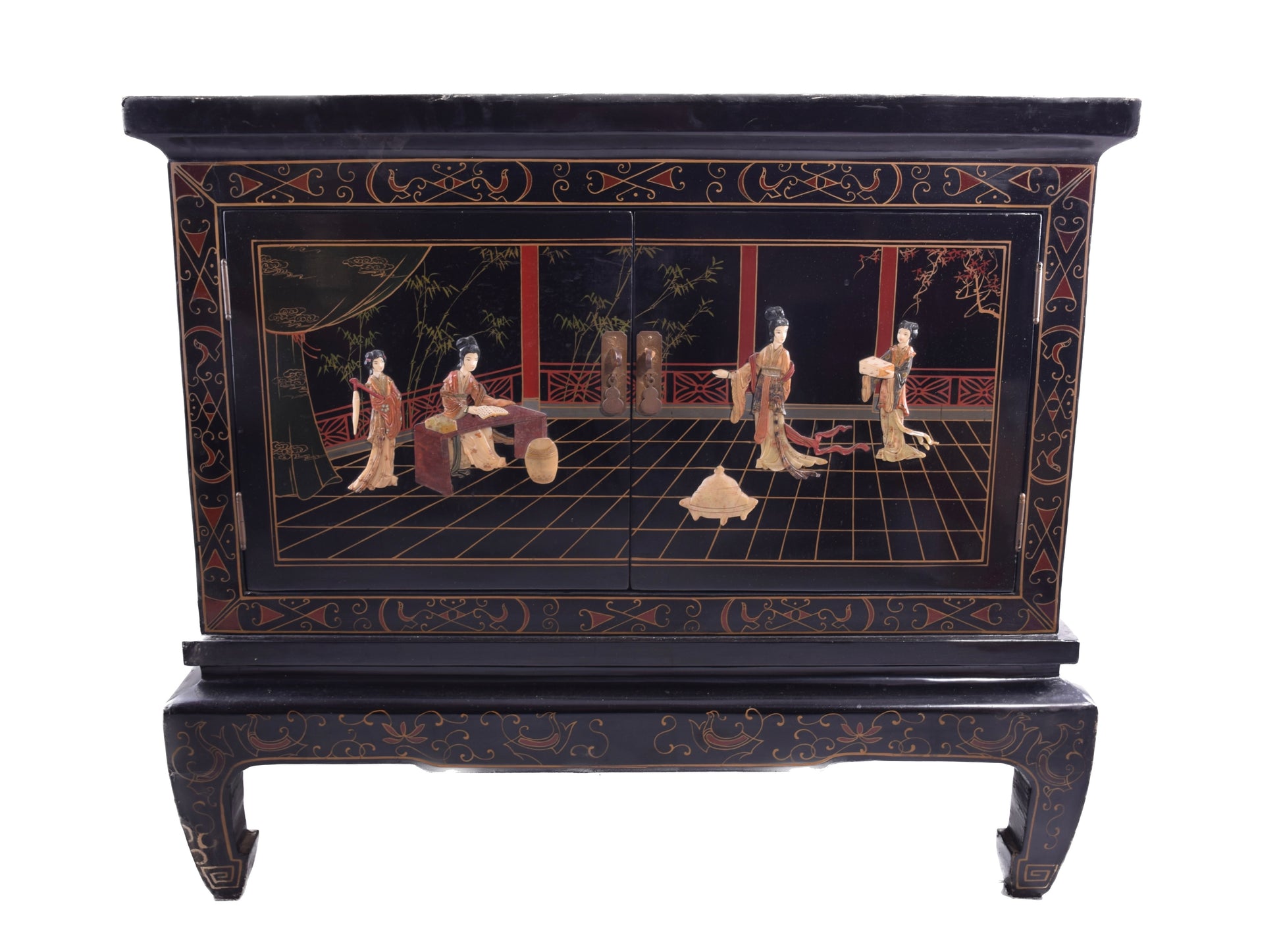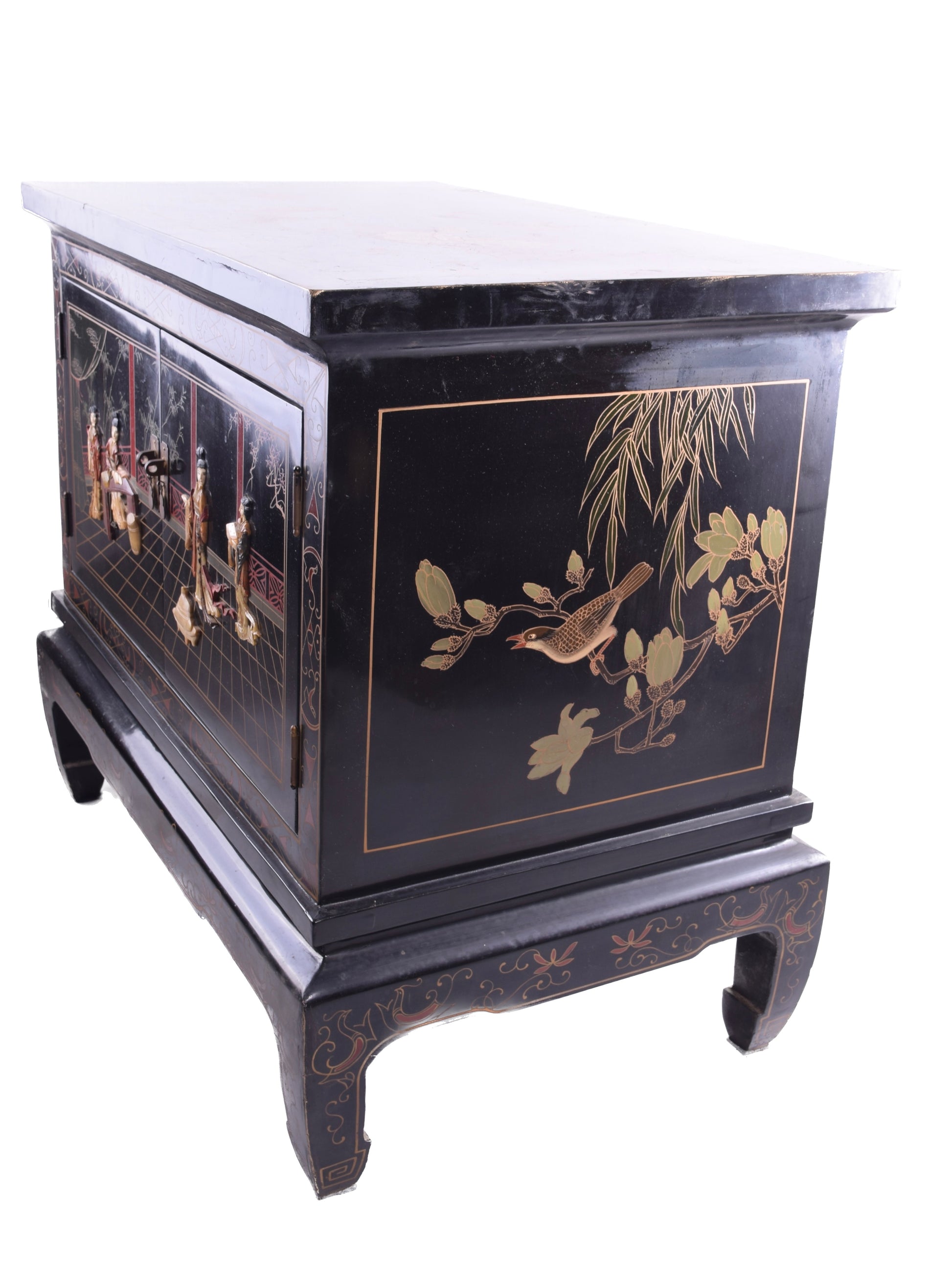 Komoda orientalna, lakierowana z dekoracją figuralną i kwiatową
