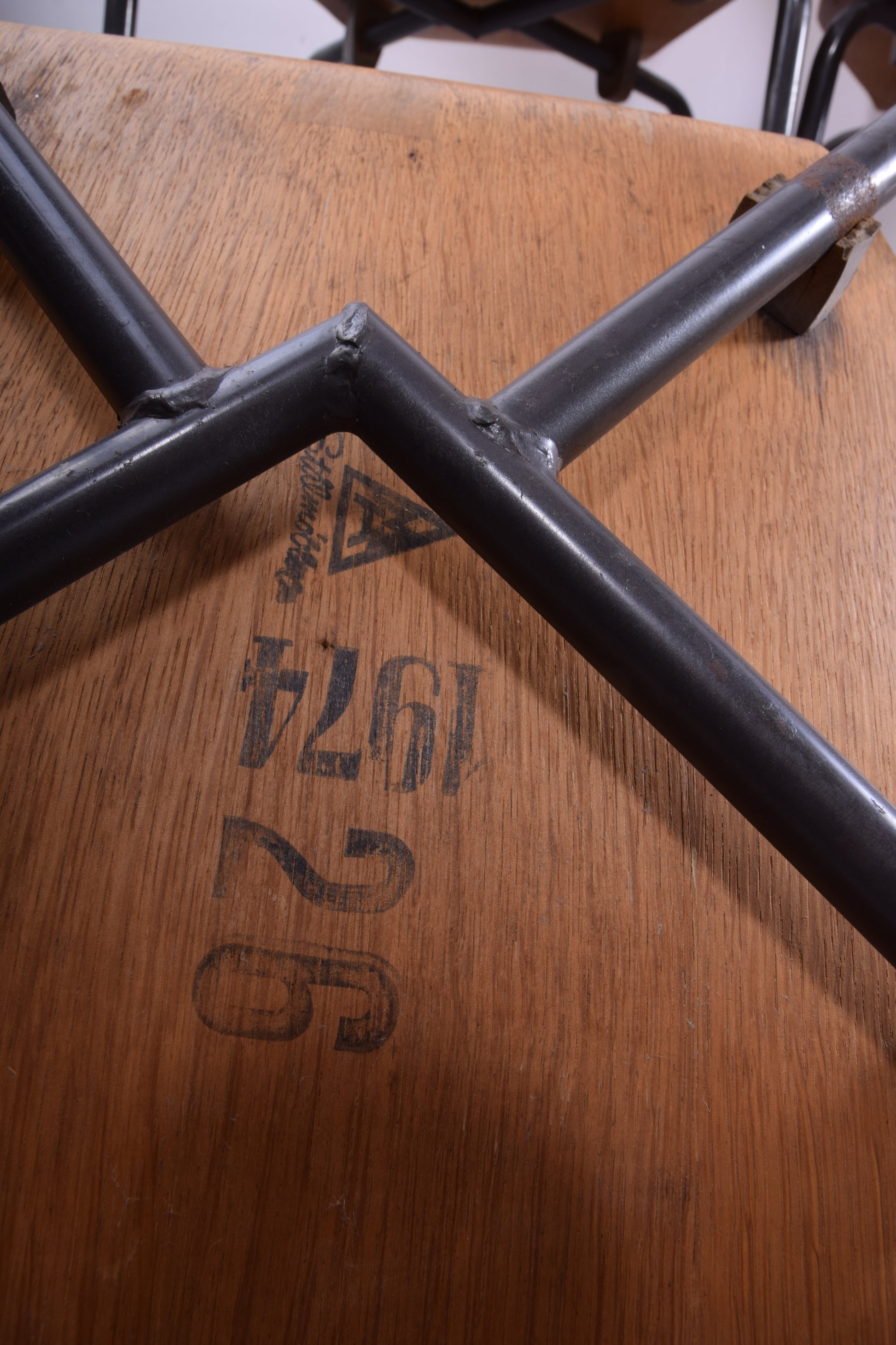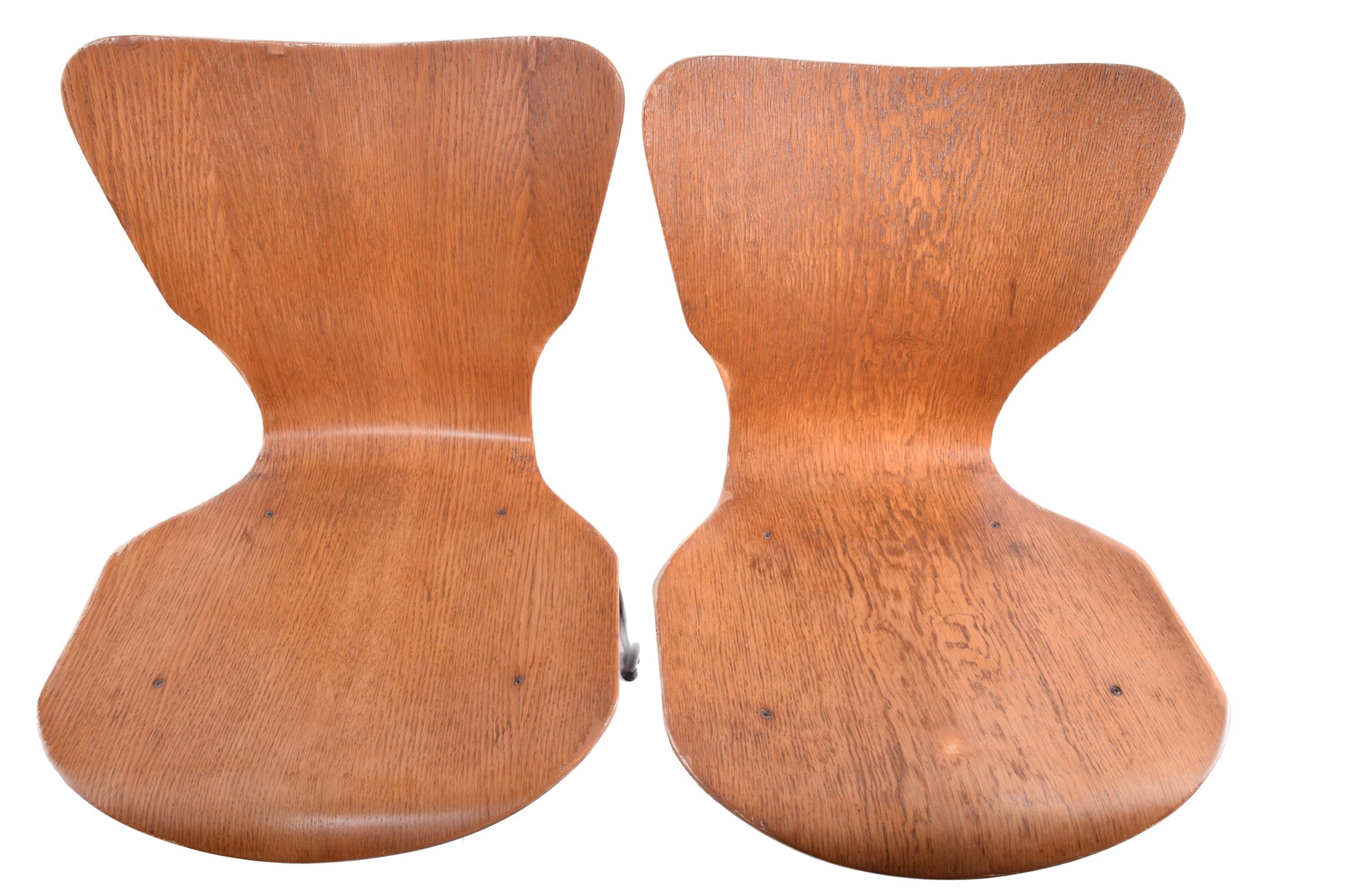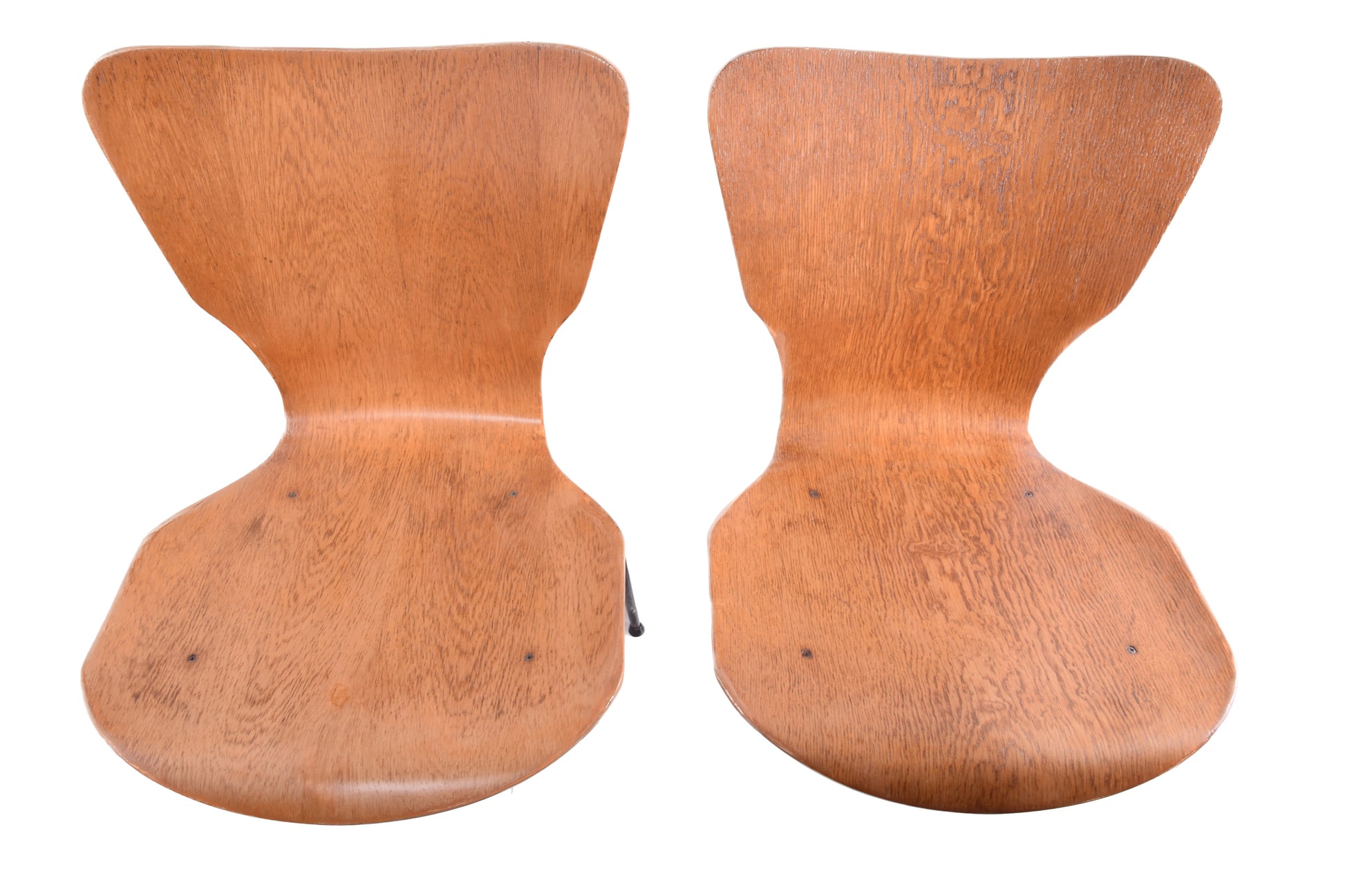 Krzesła wykonane są z profilowanej sklejki fornirowanej dębem, osadzonej na smukłej, stalowej konstrukcji w oryginalnym kolorze szarego metalu. Wszystkie śruby i łączniki są oryginalne, co potwierdza autentyczność zestawu. Pod siedziskiem widoczne są fabryczne oznaczenia Fritz Hansen z numeracją serii i datą produkcji.
