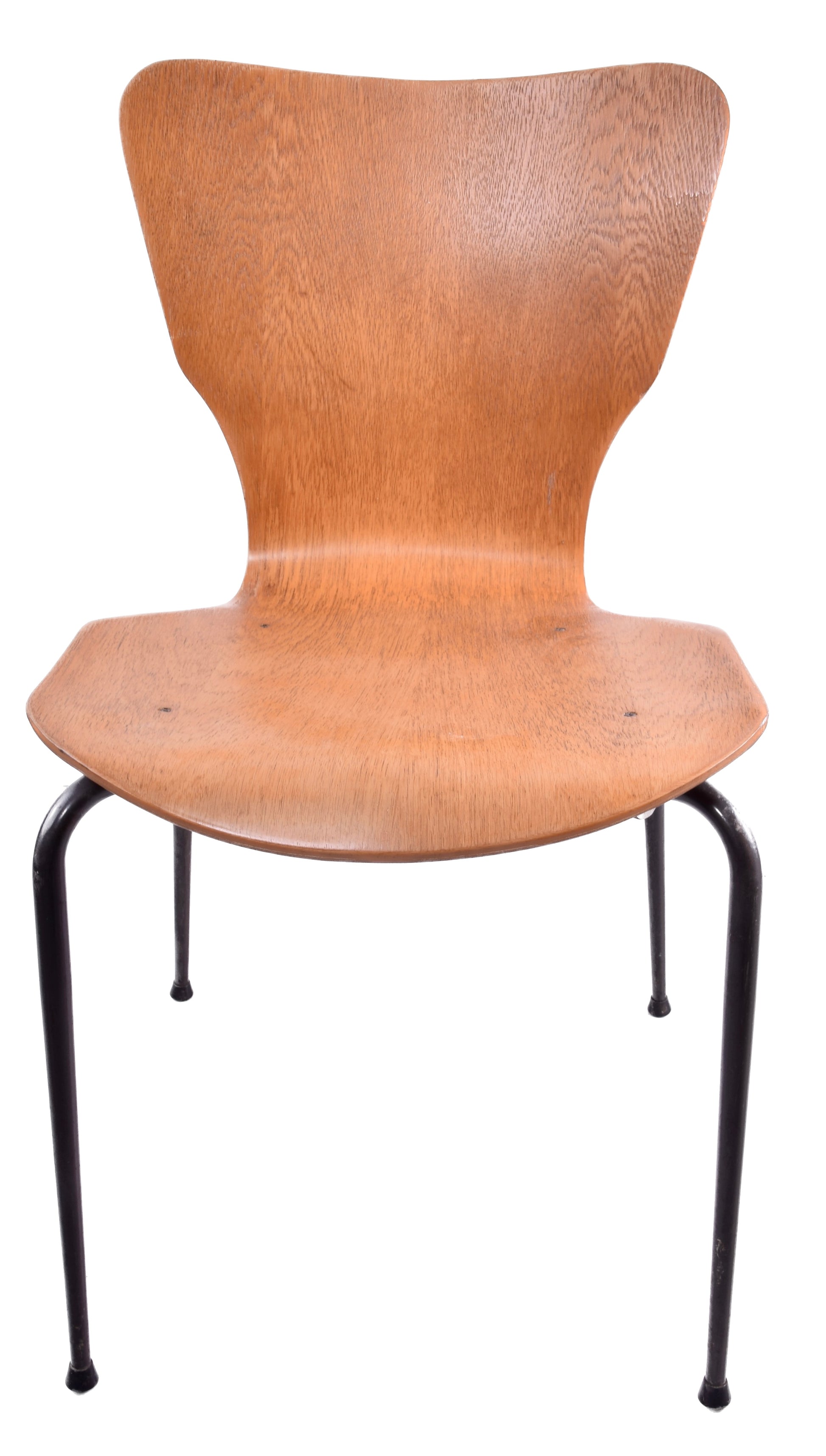 Ikoniczny zestaw sześciu krzeseł projektu Arne Jacobsena dla Fritz Hansen, model 3107, datowany stemplem producenta na rok 1974. To oryginalne egzemplarze jednego z najważniejszych projektów XX wieku – klasyki duńskiego modernizmu, łączącej funkcjonalność, lekkość i ponadczasową formę.