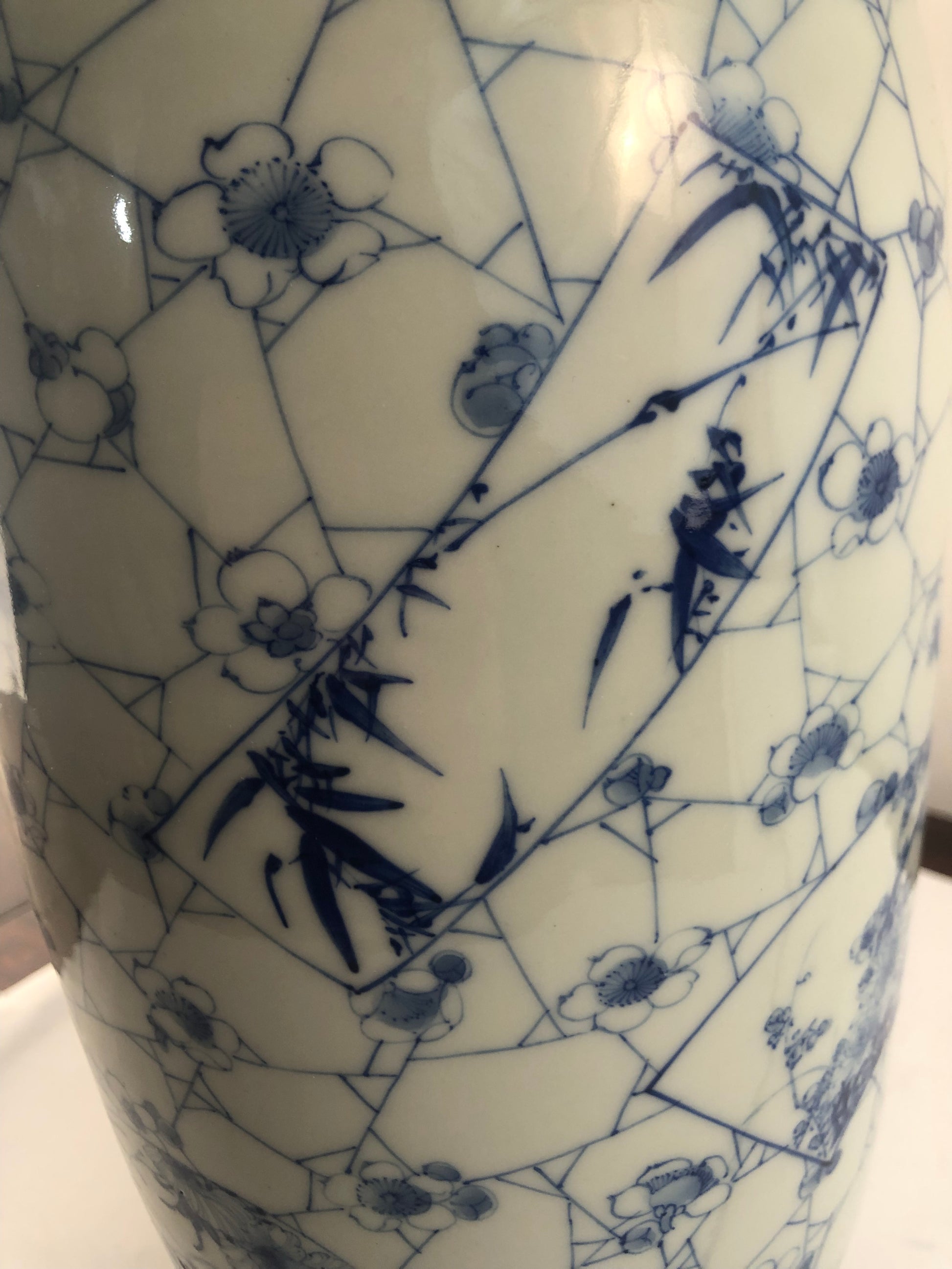 Wniosek: to oryginalny porcelanowy korpus w stylu Meiji, dekorowany ręcznie w kobalcie podszkliwnym, z motywami bambusa, śliwy i chryzantemy – bardzo klasyczne symbole Japonii.