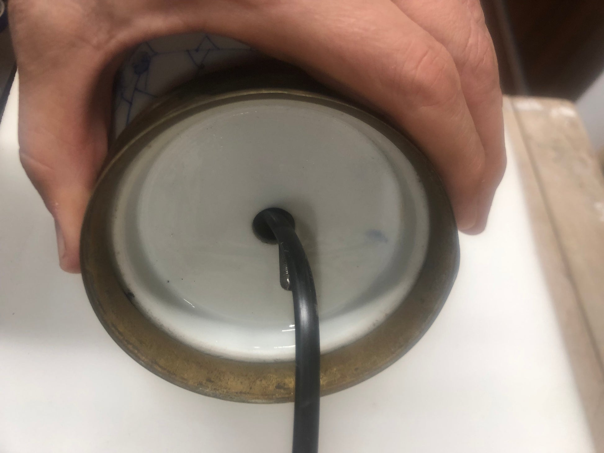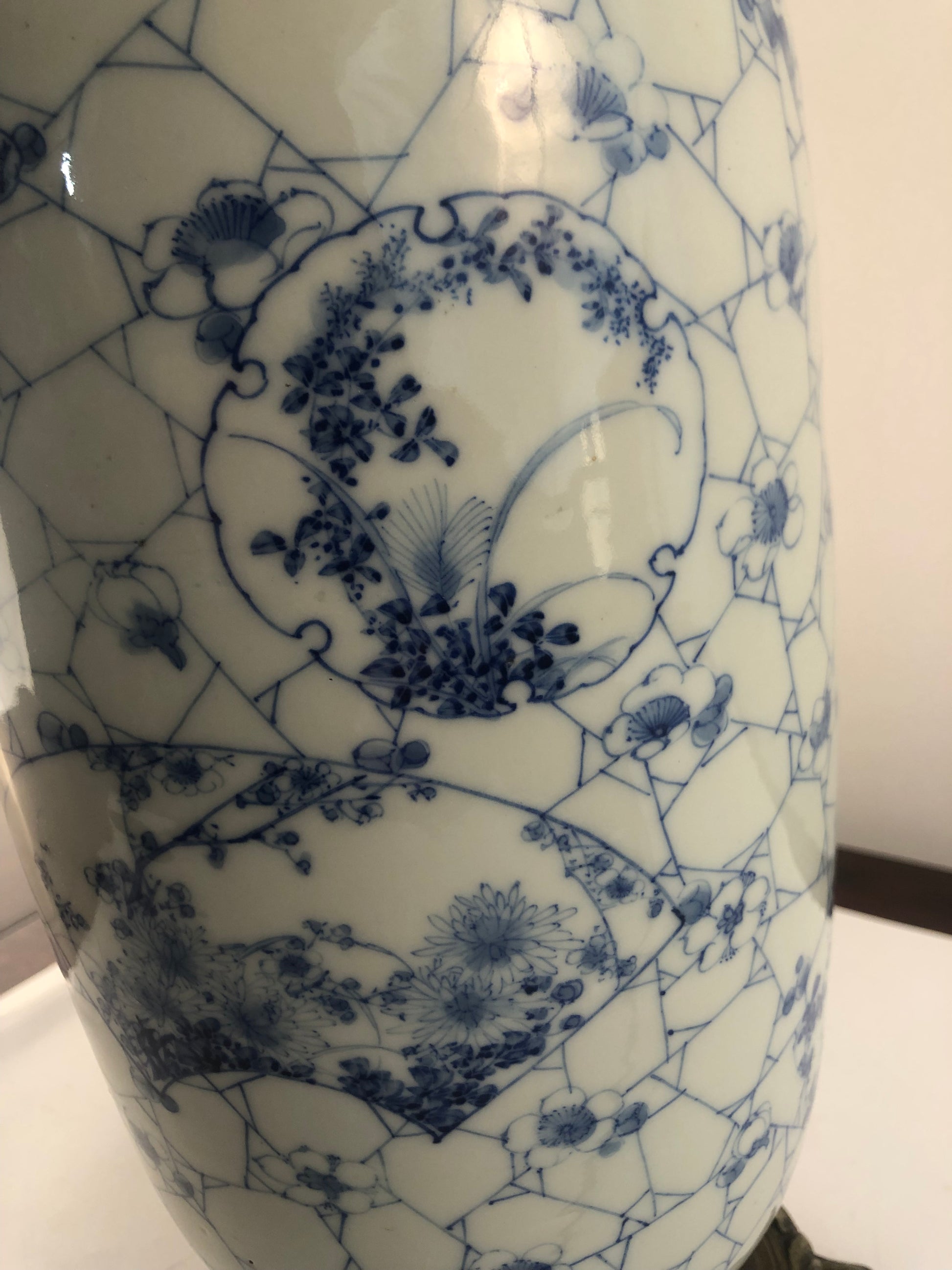 Porcelana biała, dekorowana kobaltem podszkliwnie w medalionach o motywach roślinnych (bambus, chryzantema, śliwa), symbolizujących długowieczność, odnowę i harmonię. Oprawa w brązie/mosiądzu, bogato profilowana, z dekoracją roślinną, pierwotnie przeznaczona do lampy naftowej, wtórnie zelektryfikowana w XX w. Zwieńczona współczesnym abażurem.