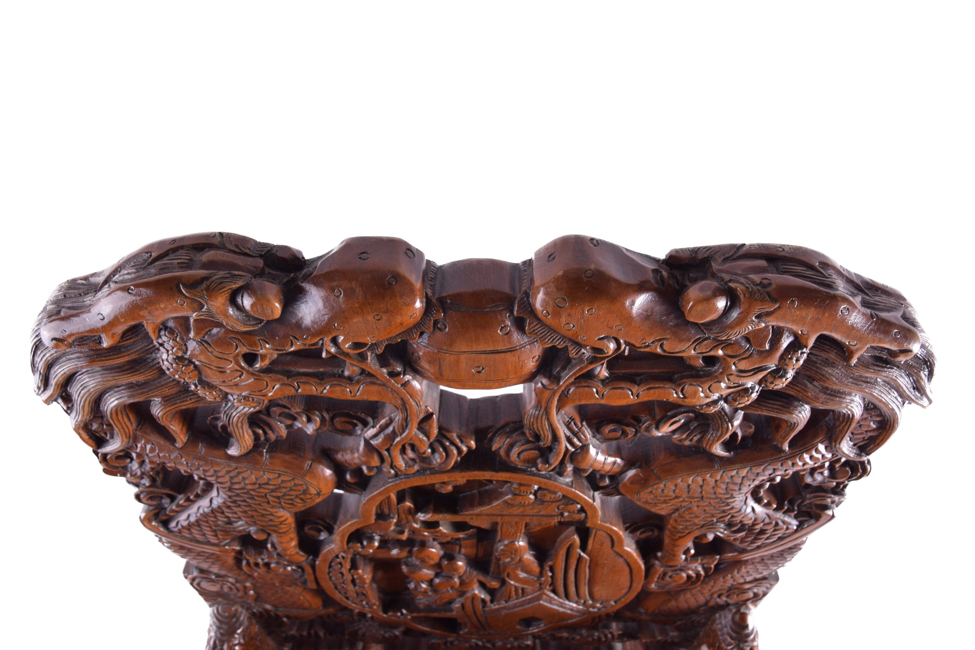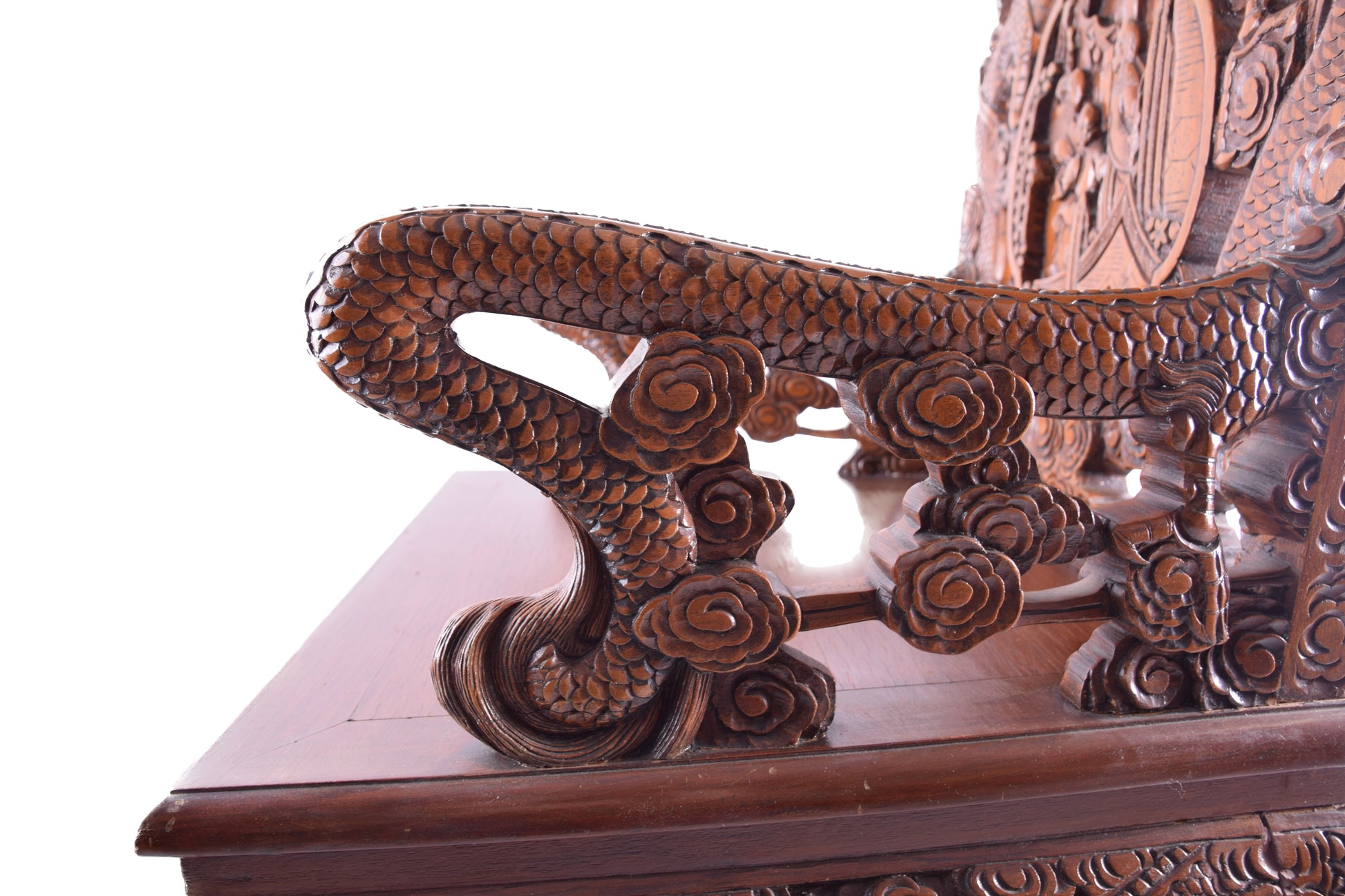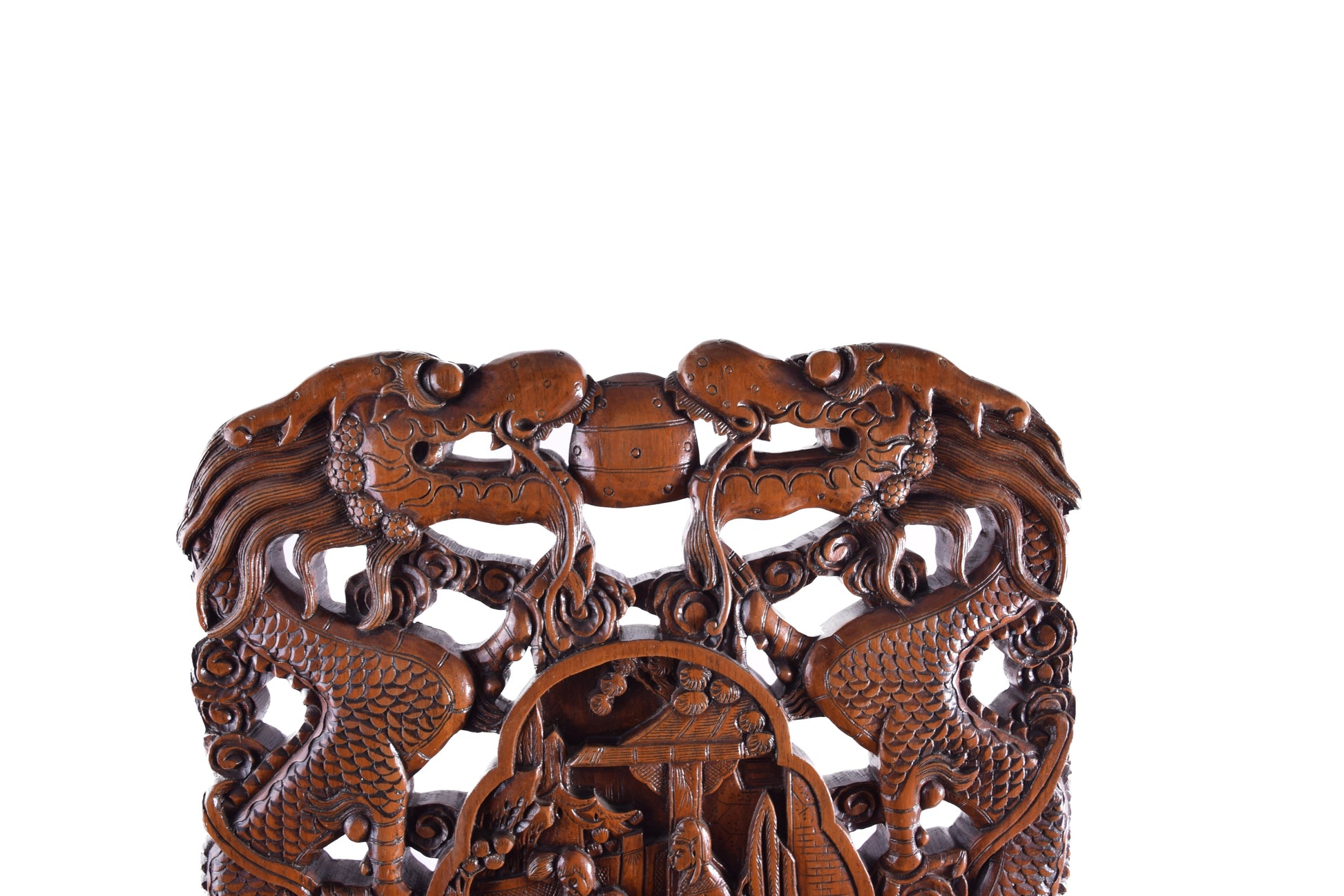 Oparcia zdobią dwa przeciwstawne smoki (long) – w kulturze chińskiej symbol najwyższej władzy, siły, ochrony oraz pomyślności. Smok nie jest tu istotą groźną, lecz opiekunem – przynosi szczęście, dobrobyt i harmonię.