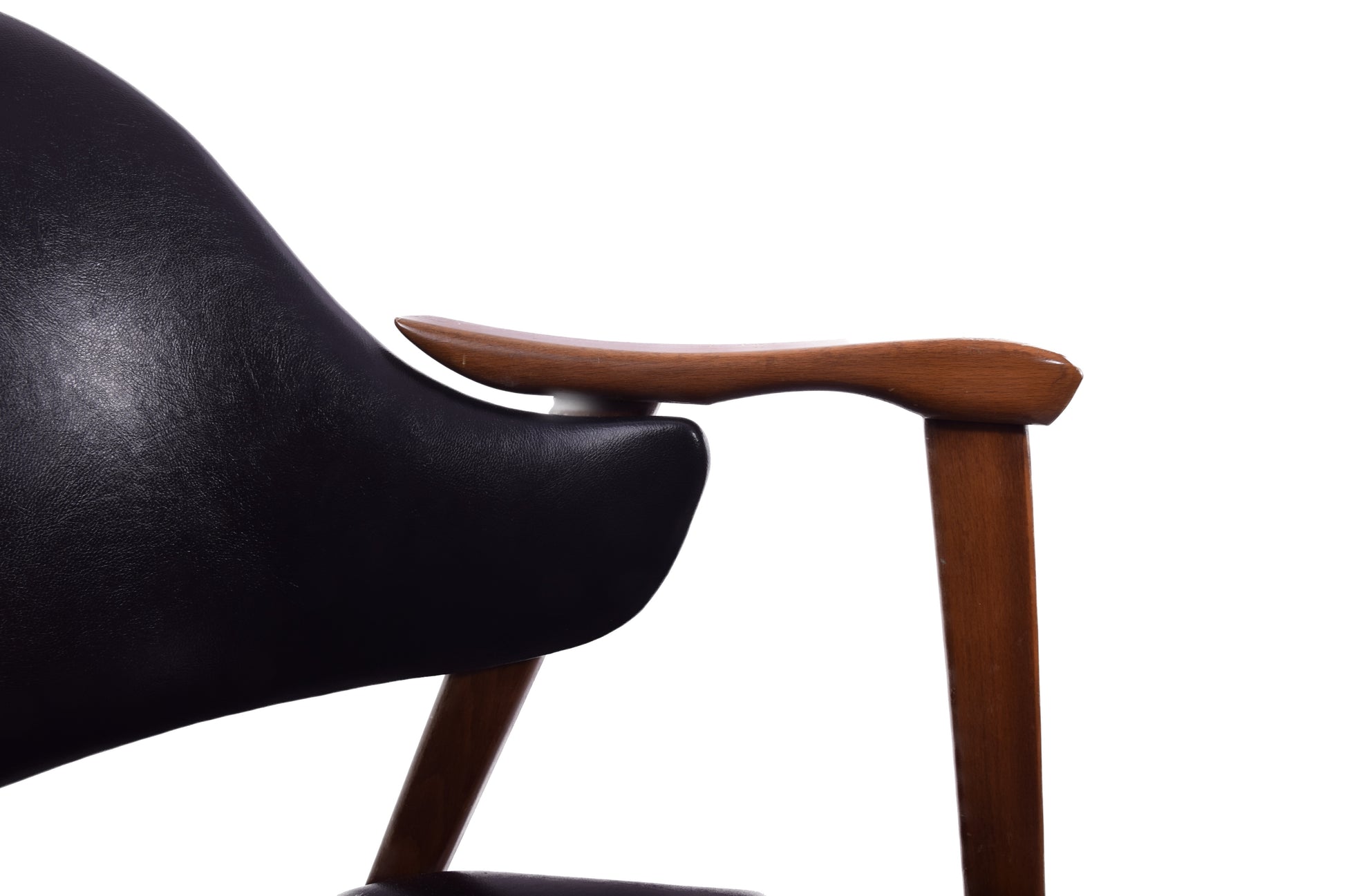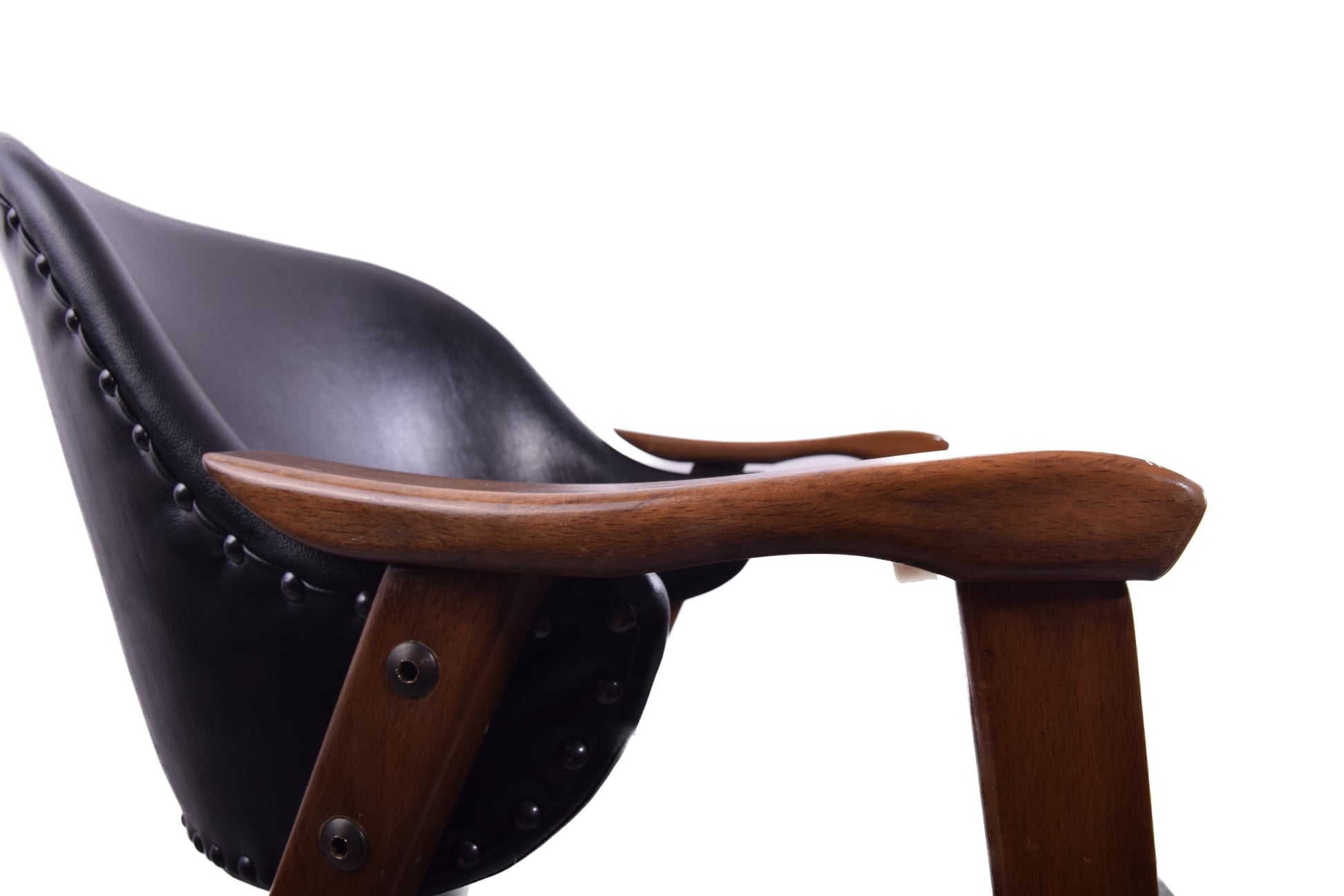 Czarna tapicerka z wysokiej jakości skaju o delikatnej fakturze pięknie kontrastuje z ciepłym odcieniem drewna, tworząc elegancki i harmonijny duet.