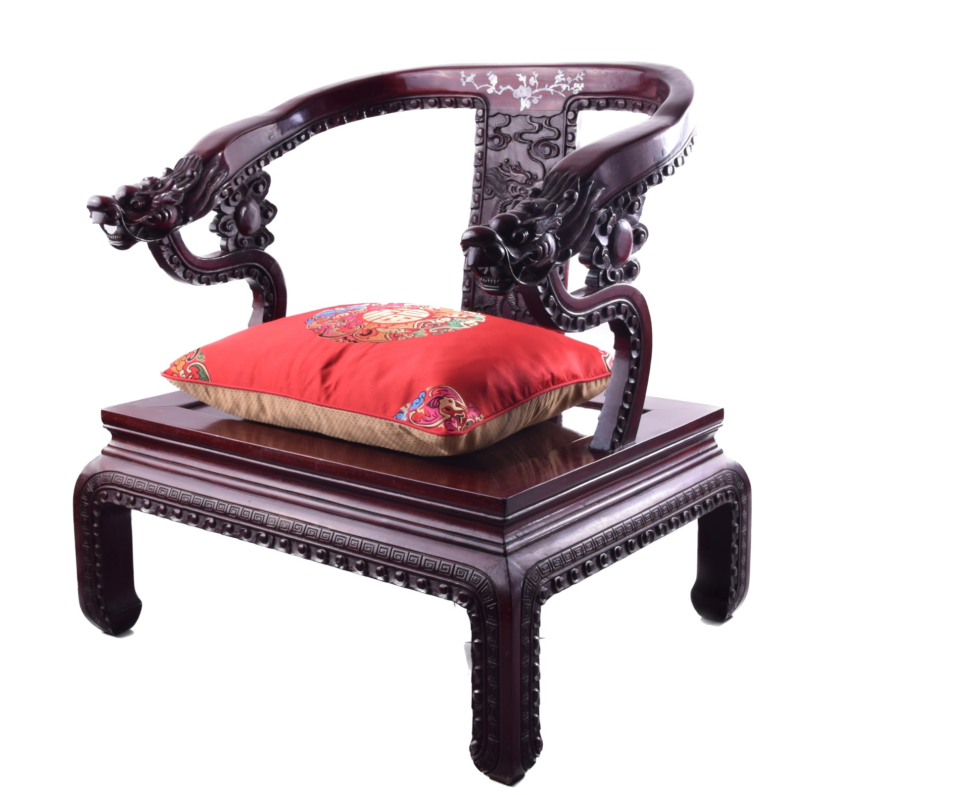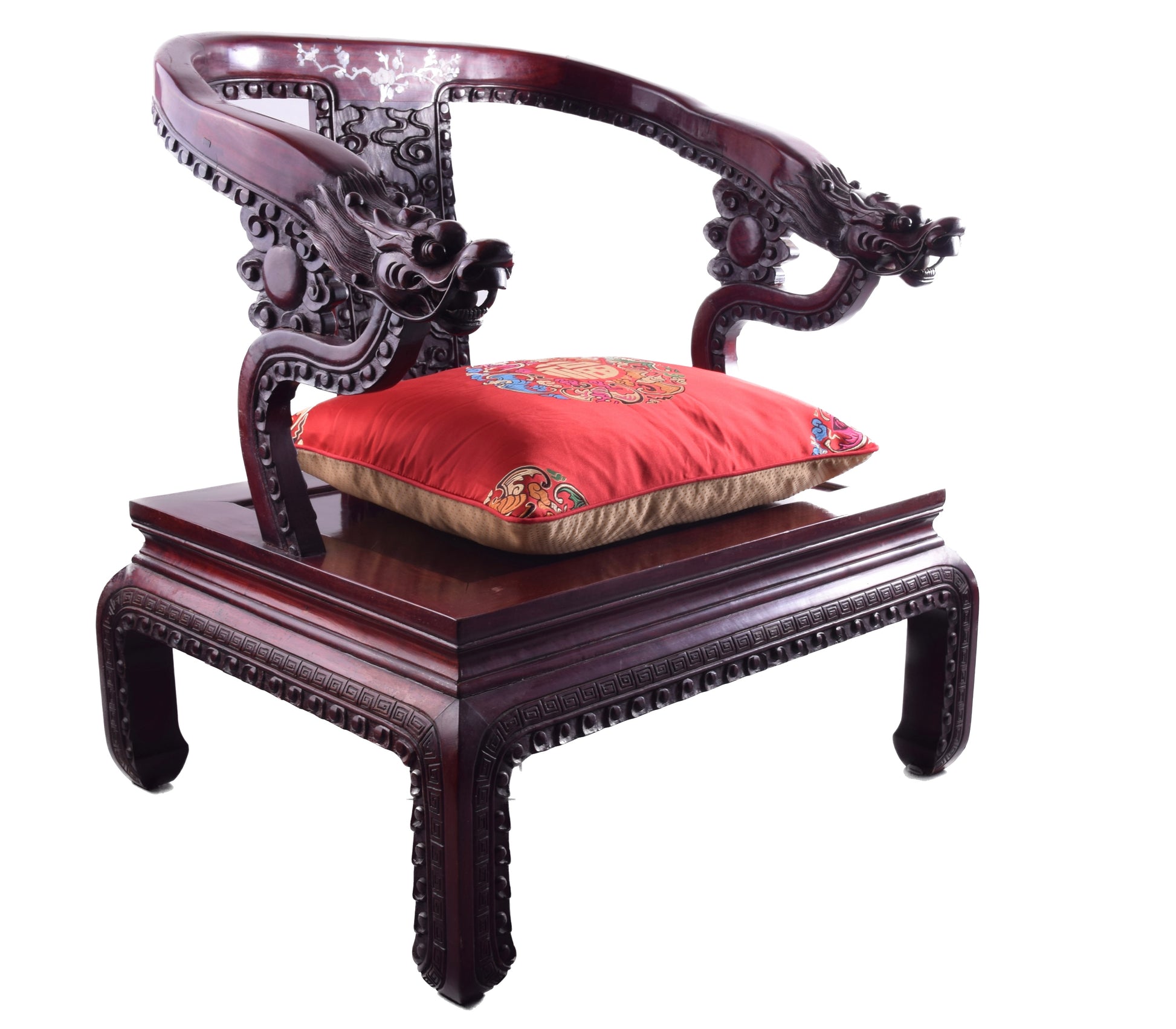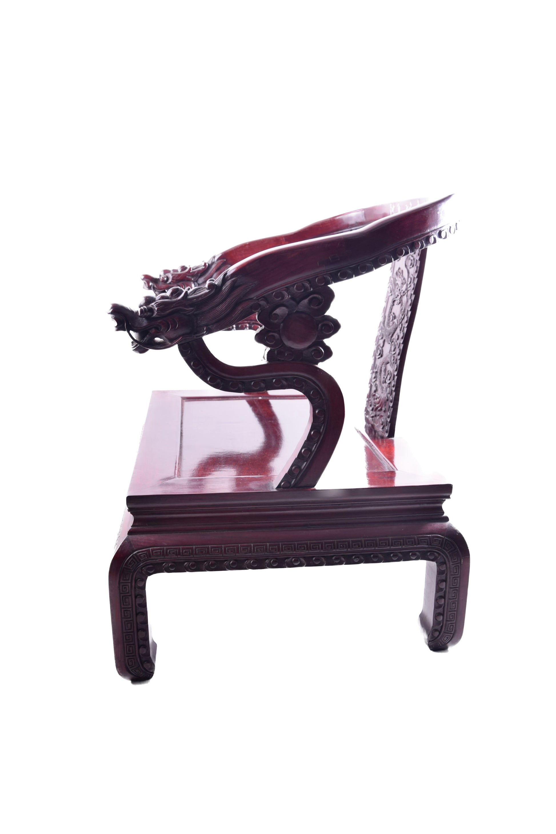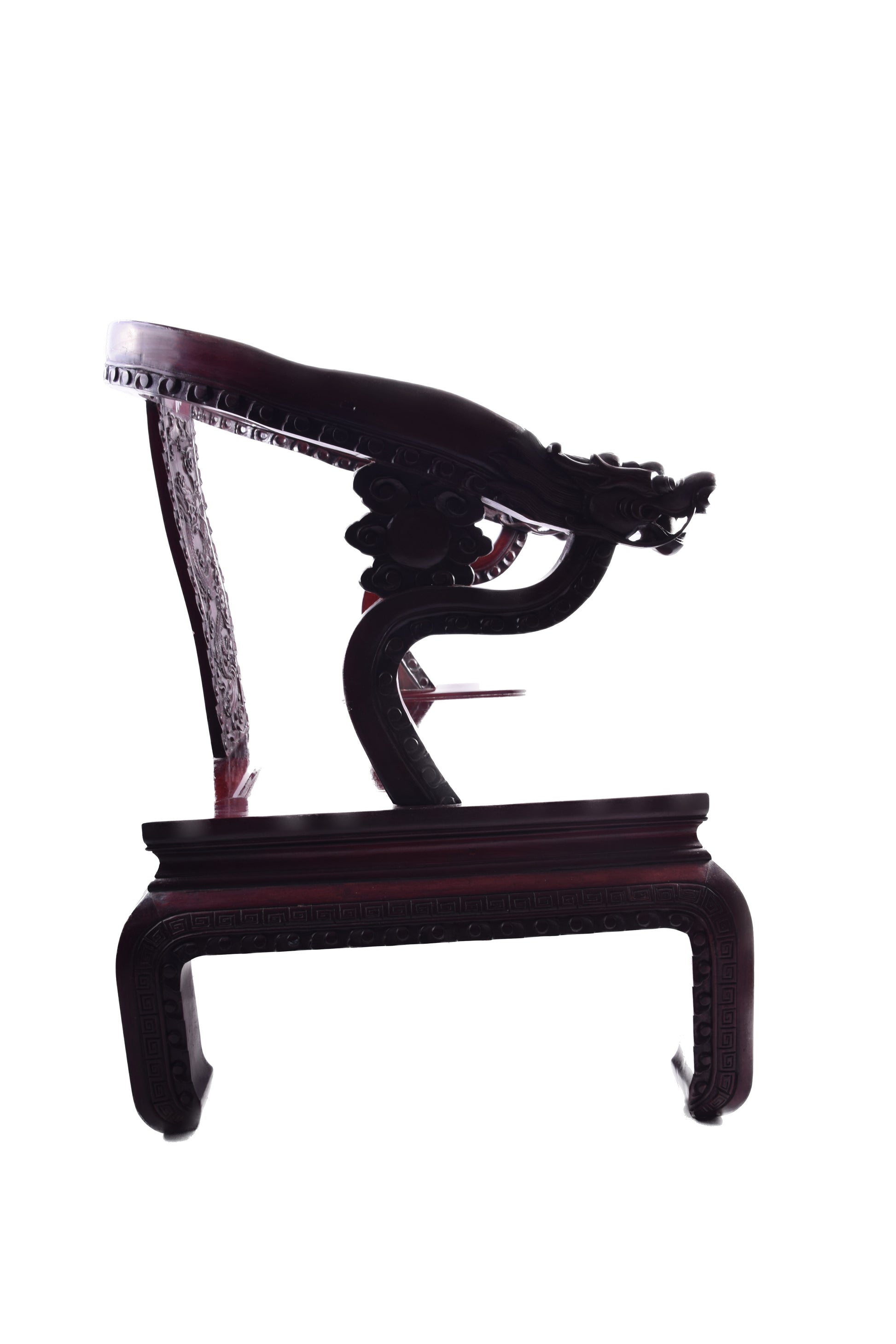 Oparcie fotela zdobi bogata, ręczna rzeźba przedstawiająca smoka – najpotężniejszy symbol w kulturze chińskiej. Smok nie jest tu postacią groźną, lecz opiekunem i strażnikiem, uosabiającym władzę, mądrość oraz szczęście. Widoczna w paszczy smoka kula, tzw. Perła Mądrości, symbolizuje dążenie do doskonałości i dobrobytu. Otaczające go motywy fal i obłoków podkreślają władzę nad żywiołami, a tym samym przynoszą harmonię i pomyślność domowi. Tego rodzaju zdobienia nie tylko nadają fotelowi niezwykłej dekoracyjności, ale również sprawiają, że staje się on talizmanem sprzyjającym równowadze i dobrobytowi.