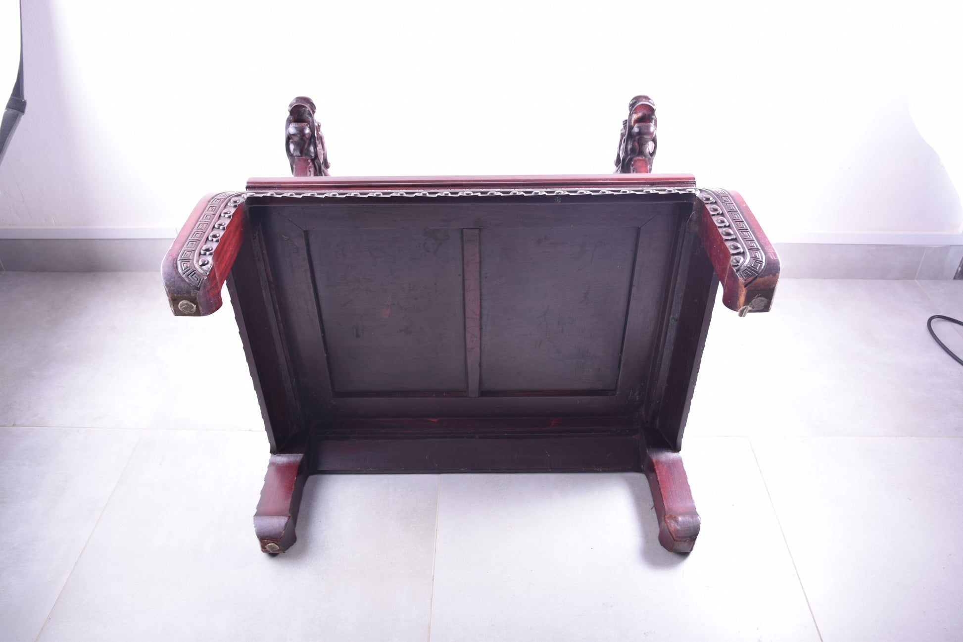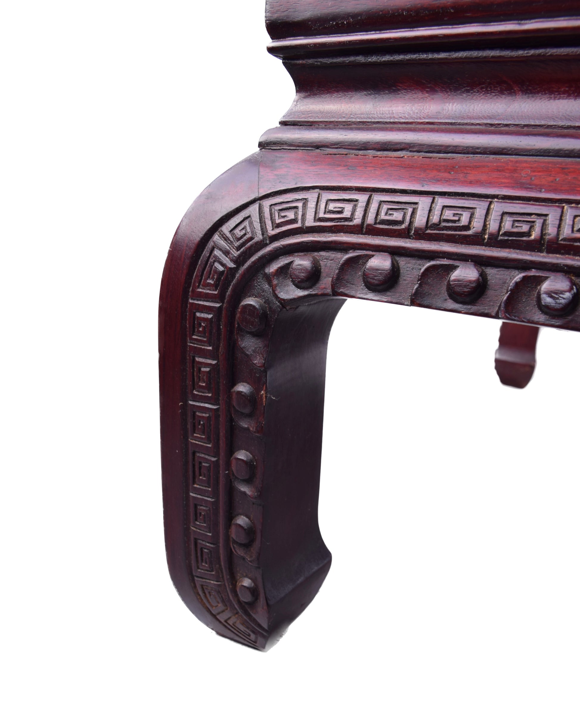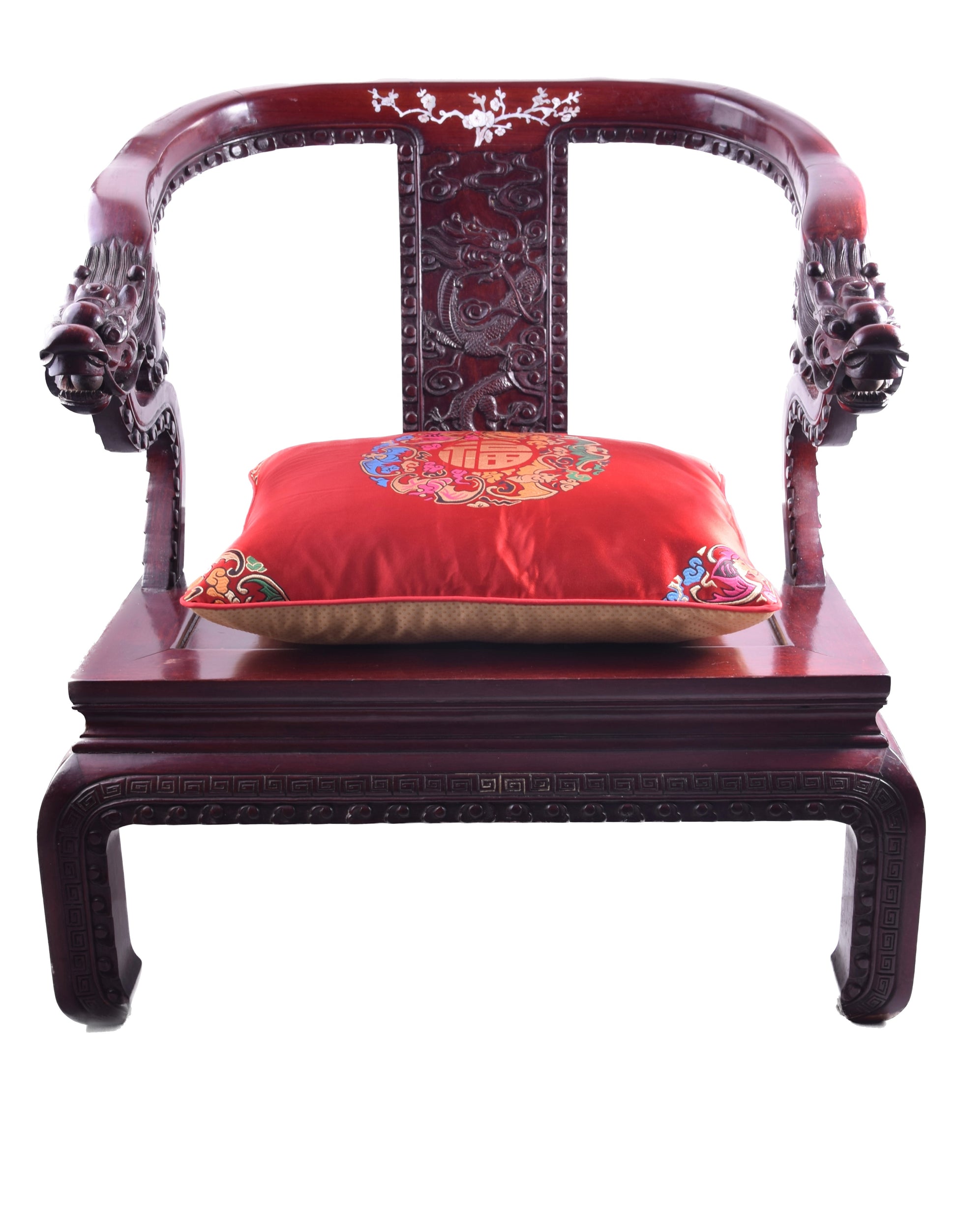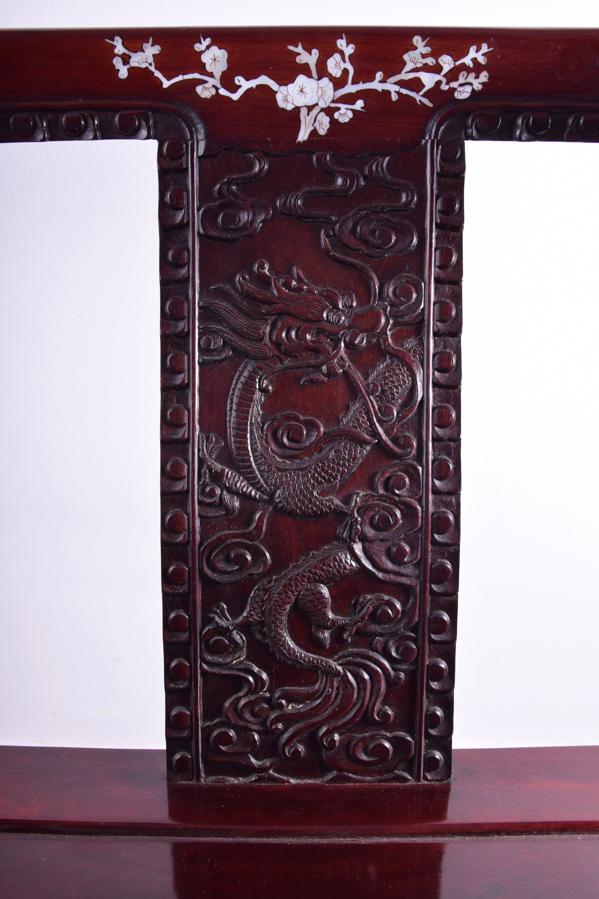Oparcie fotela zdobi bogata, ręczna rzeźba przedstawiająca smoka – najpotężniejszy symbol w kulturze chińskiej. Smok nie jest tu postacią groźną, lecz opiekunem i strażnikiem, uosabiającym władzę, mądrość oraz szczęście. Widoczna w paszczy smoka kula, tzw. Perła Mądrości, symbolizuje dążenie do doskonałości i dobrobytu. Otaczające go motywy fal i obłoków podkreślają władzę nad żywiołami, a tym samym przynoszą harmonię i pomyślność domowi. Tego rodzaju zdobienia nie tylko nadają fotelowi niezwykłej dekoracyjności, ale również sprawiają, że staje się on talizmanem sprzyjającym równowadze i dobrobytowi.