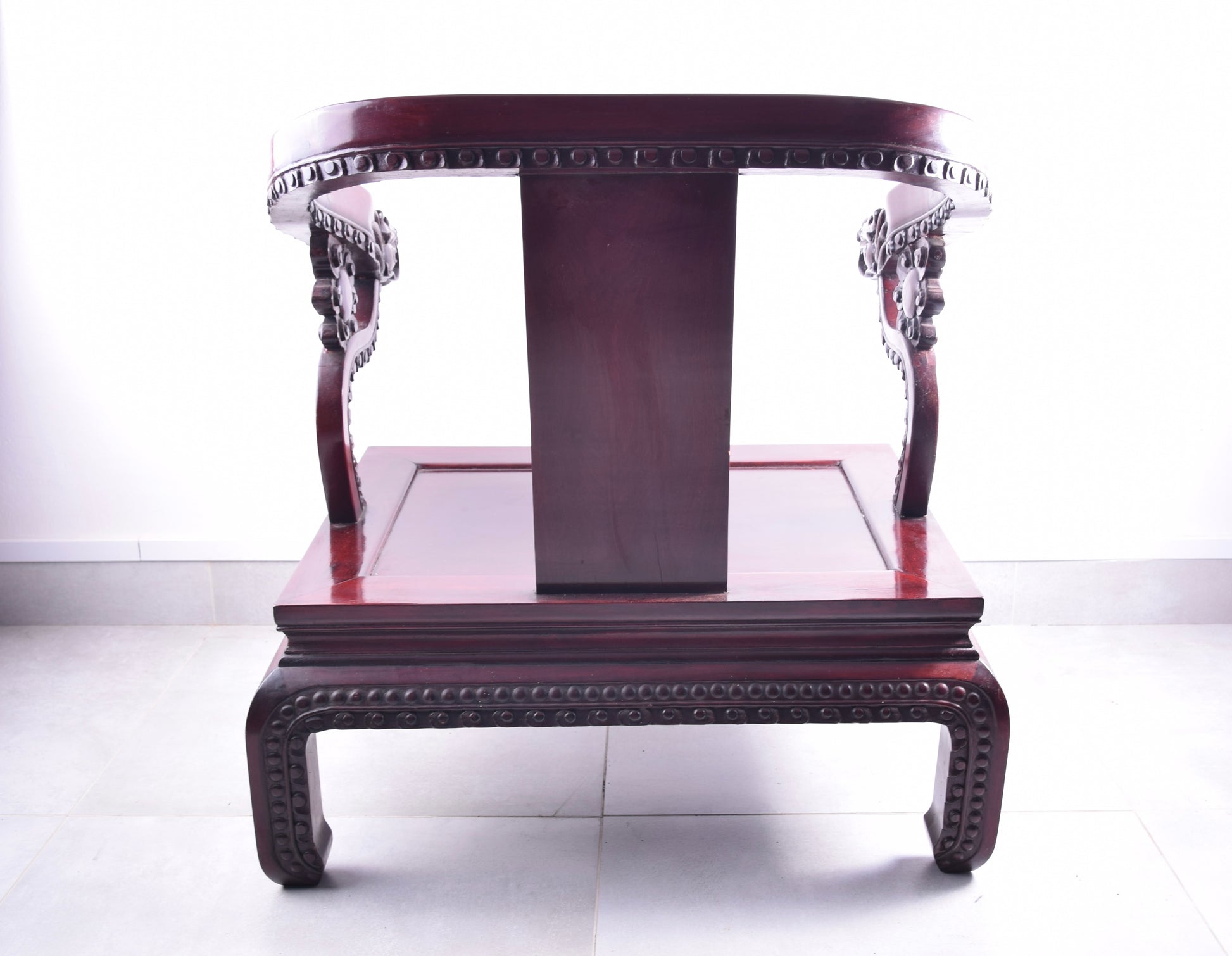 Na sprzedaż wyjątkowy fotel w stylu chińskim, wykonany w latach 50. XX wieku. Mebel powstał z litego, ciężkiego drewna egzotycznego o ciemnej, mahoniowej tonacji. Jego solidna konstrukcja, precyzja wykonania oraz bogata ornamentyka czynią go niezwykle dekoracyjnym i kolekcjonerskim obiektem.