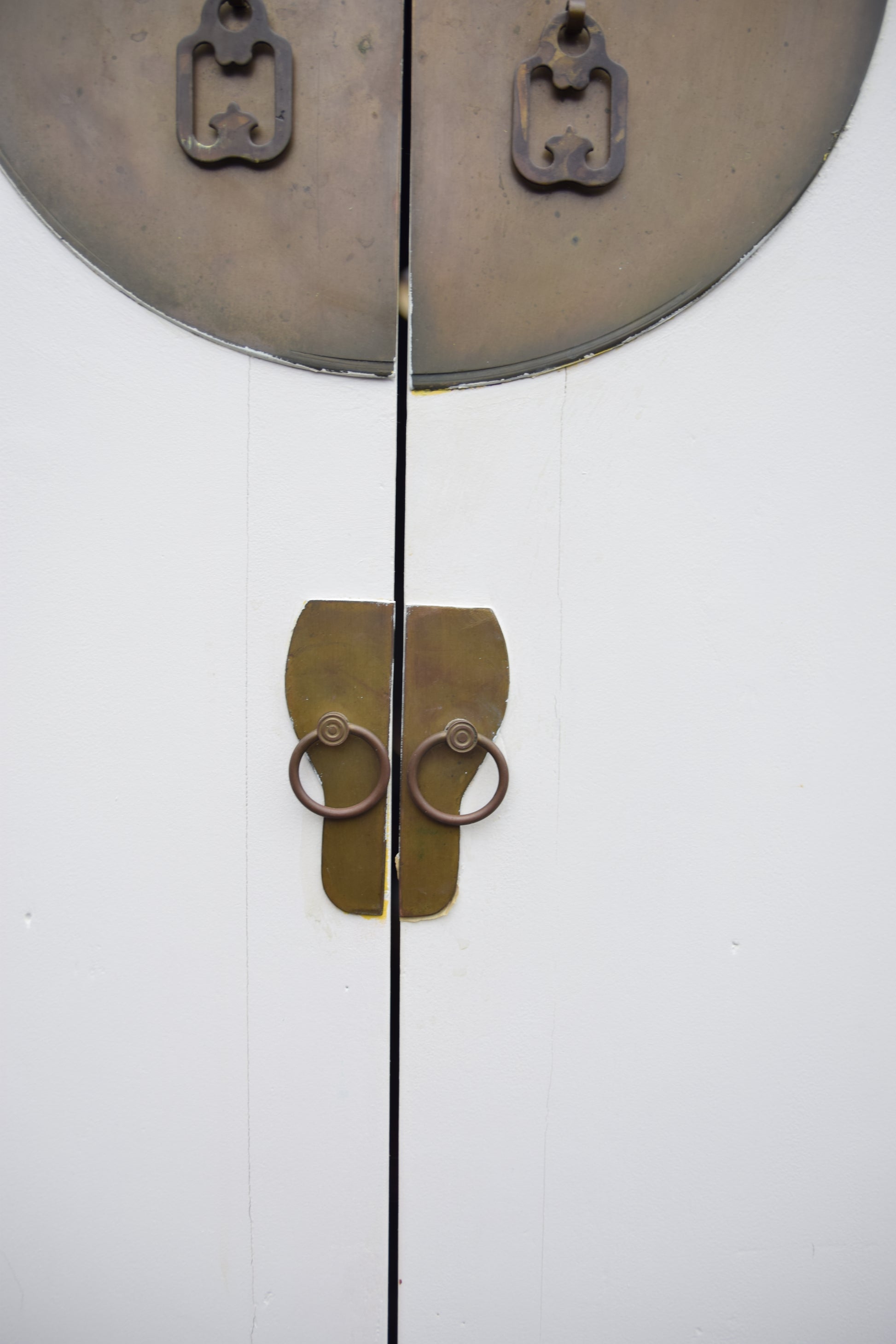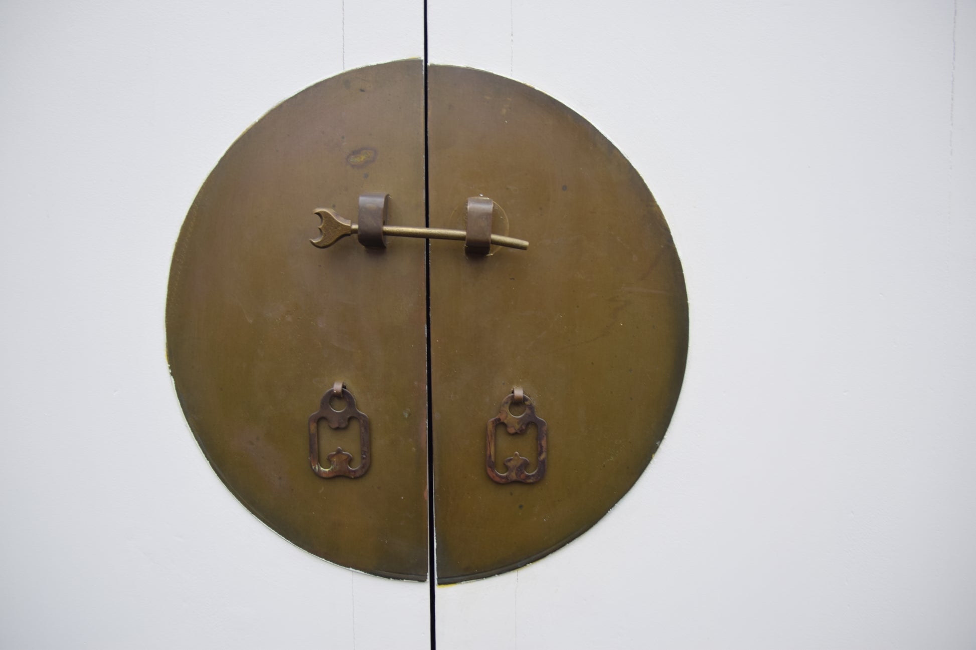 Front zdobiony dużym, okrągłym mosiężnym zamkiem typu moon lock z pierścieniowymi uchwytami i ryglem w formie stylizowanej strzały — klasyczny motyw chińskich mebli ślubnych (xigui, 喜柜).