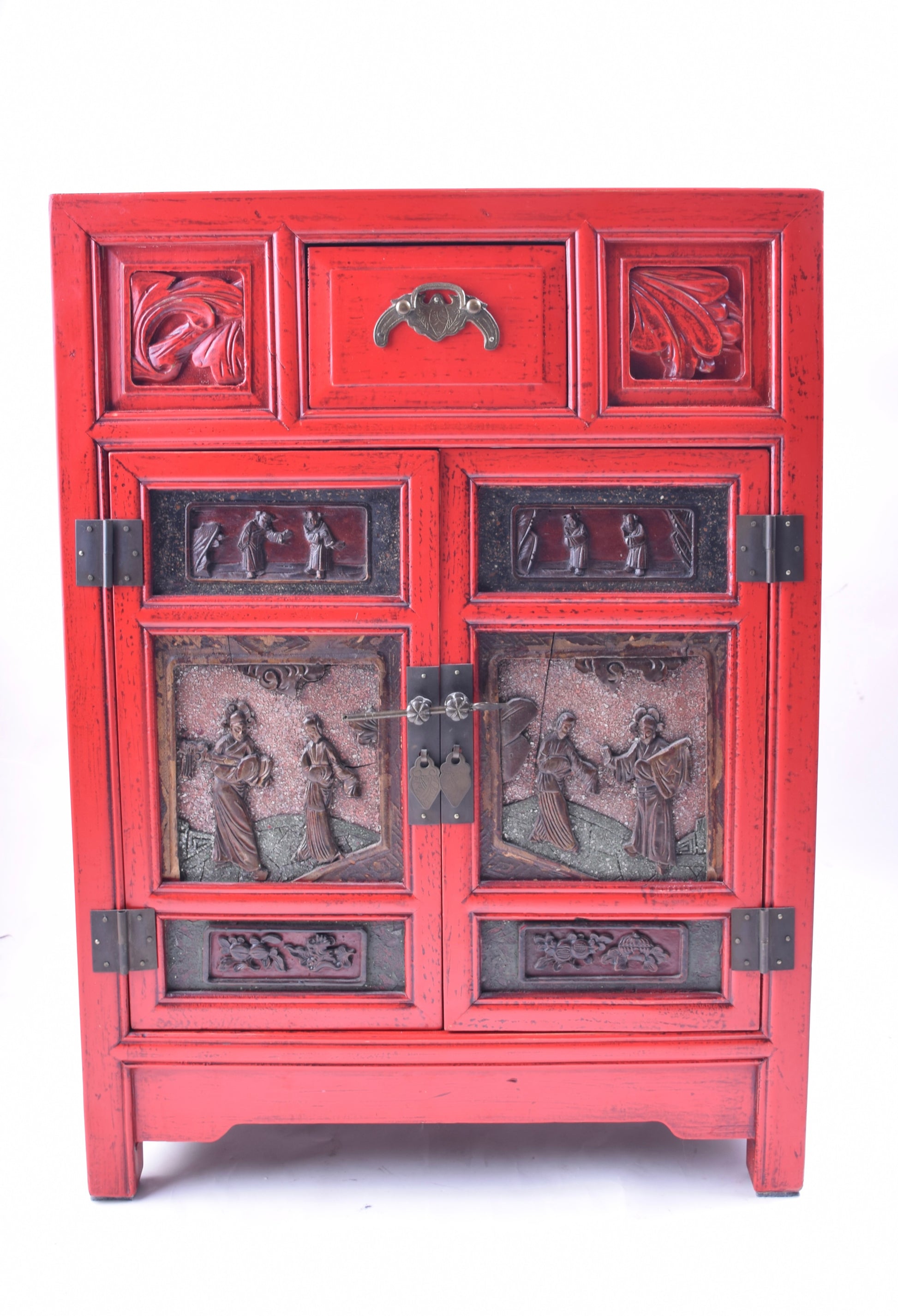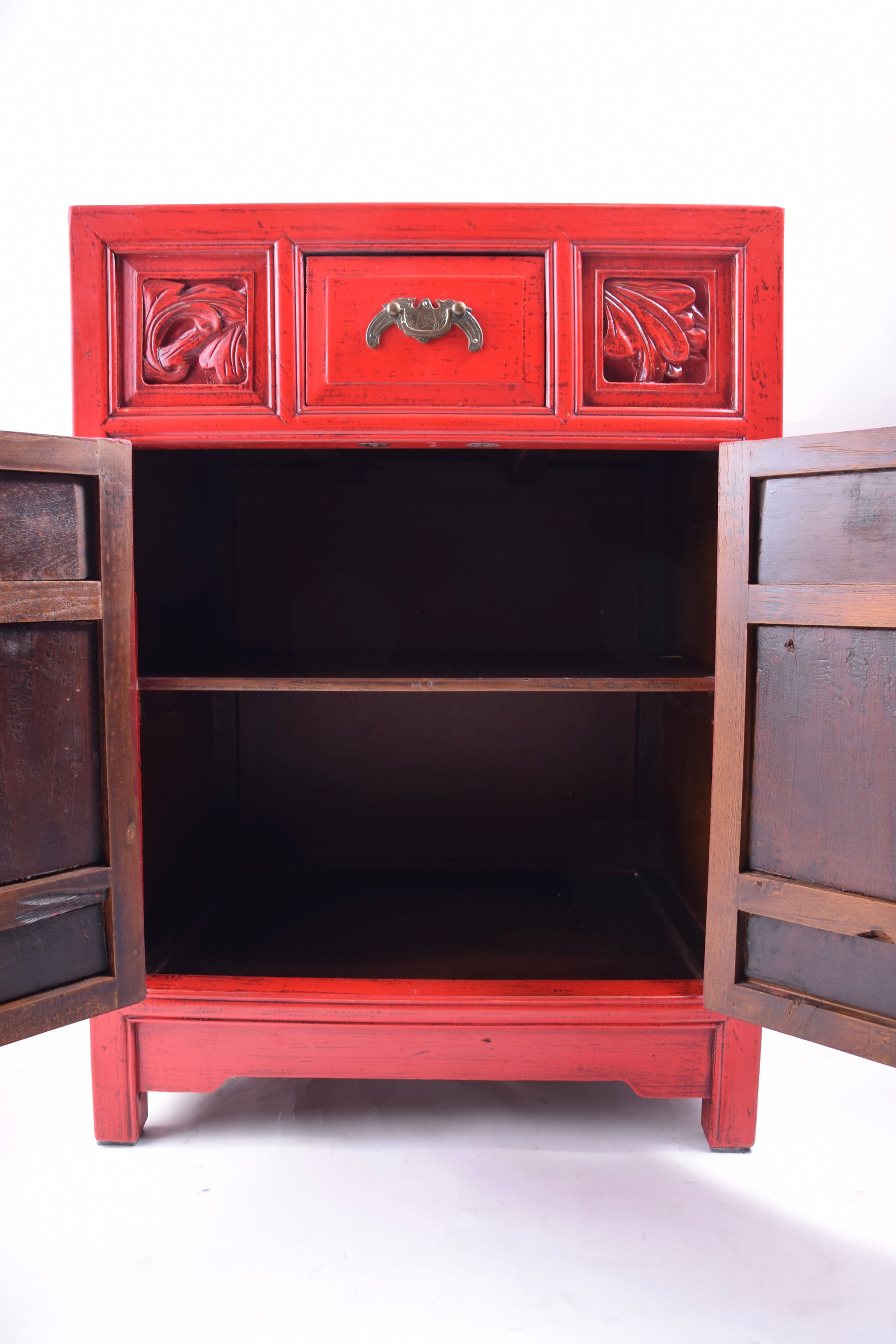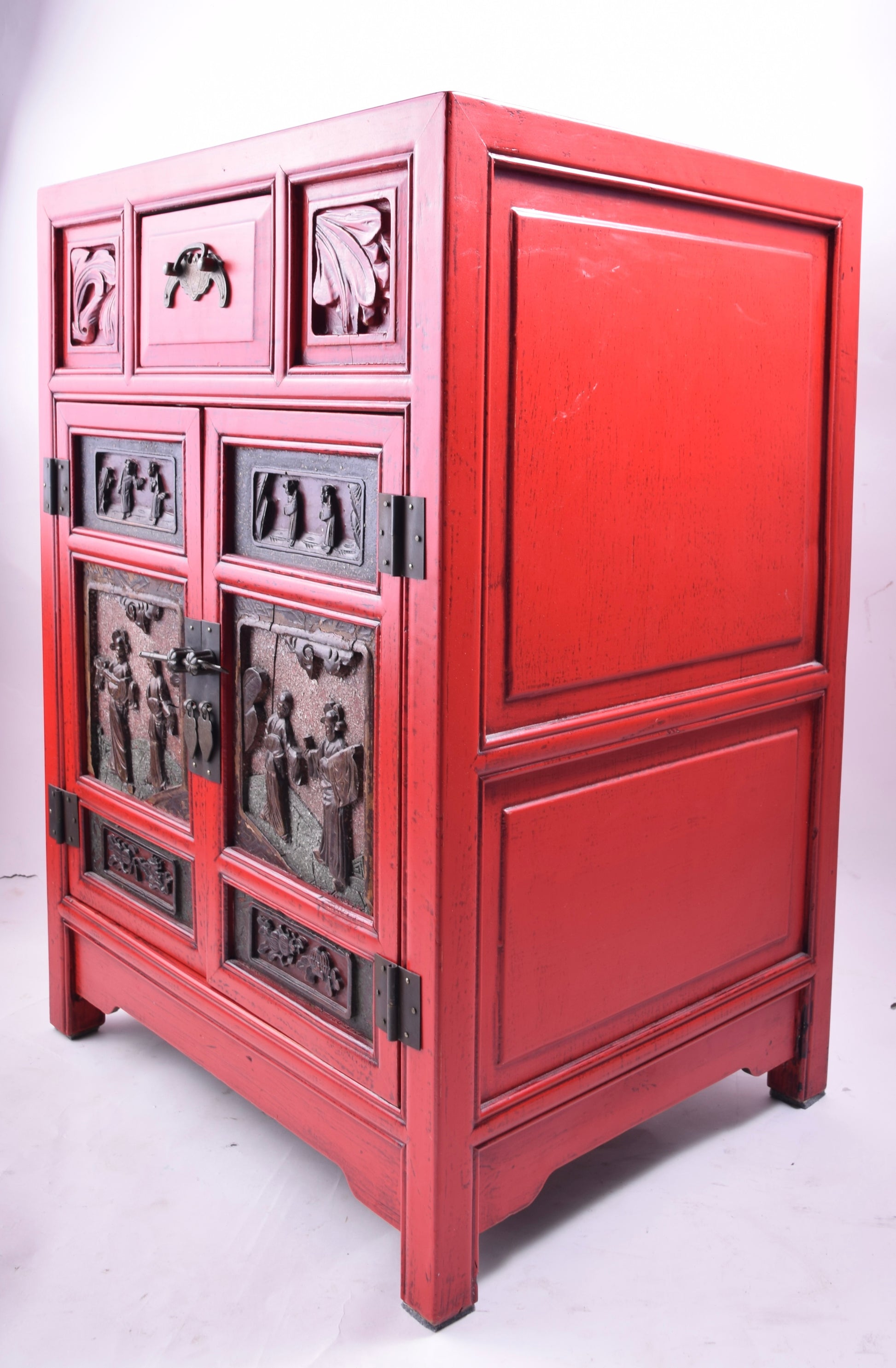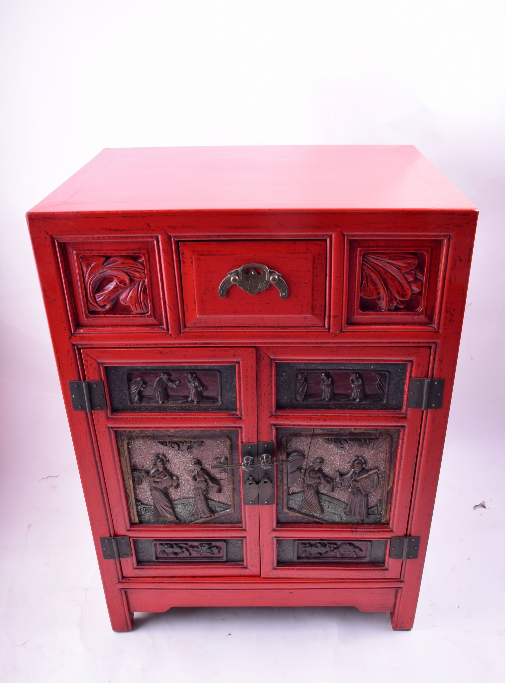 Sztuka Chin czerwona komódka z rzeźbionymi drzwiczkami 71x52x41 cm