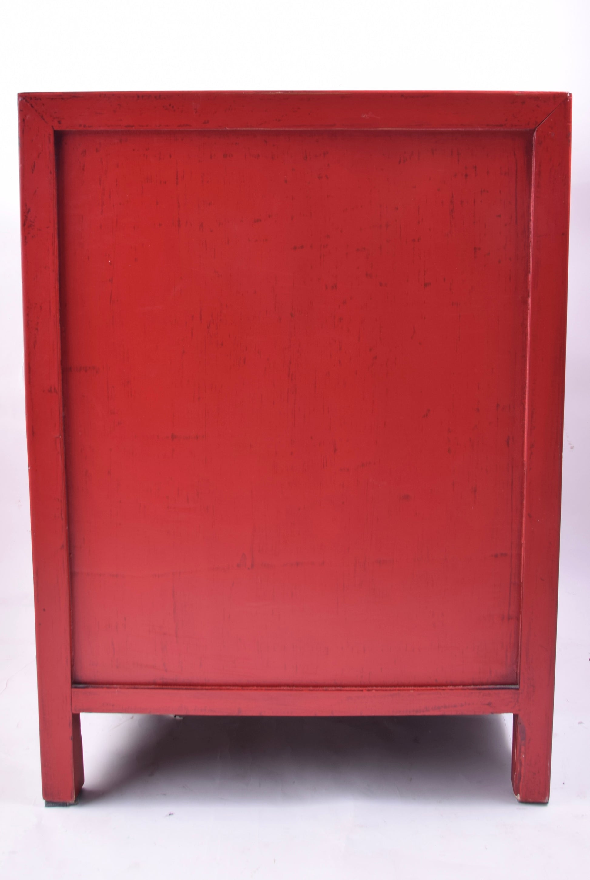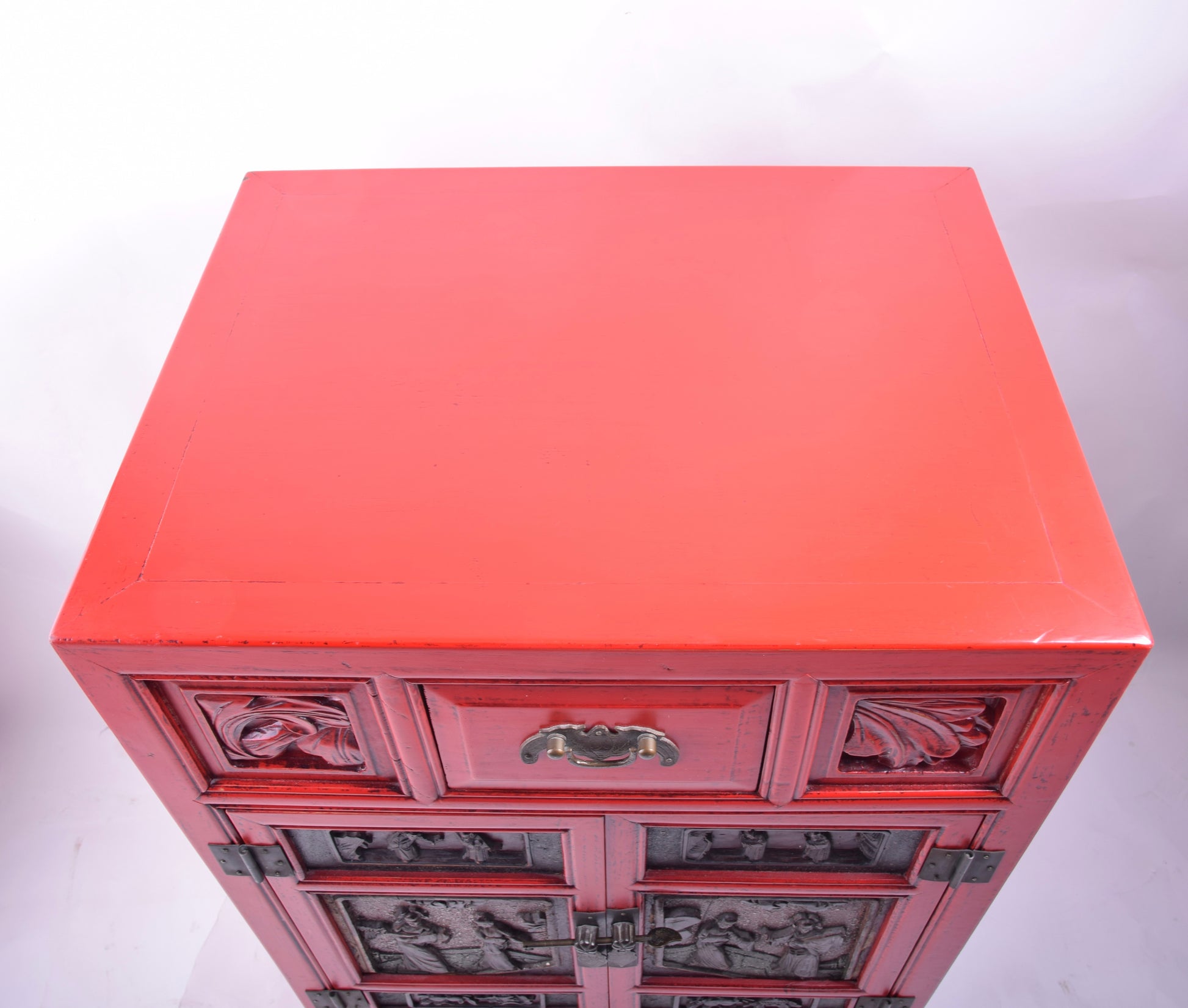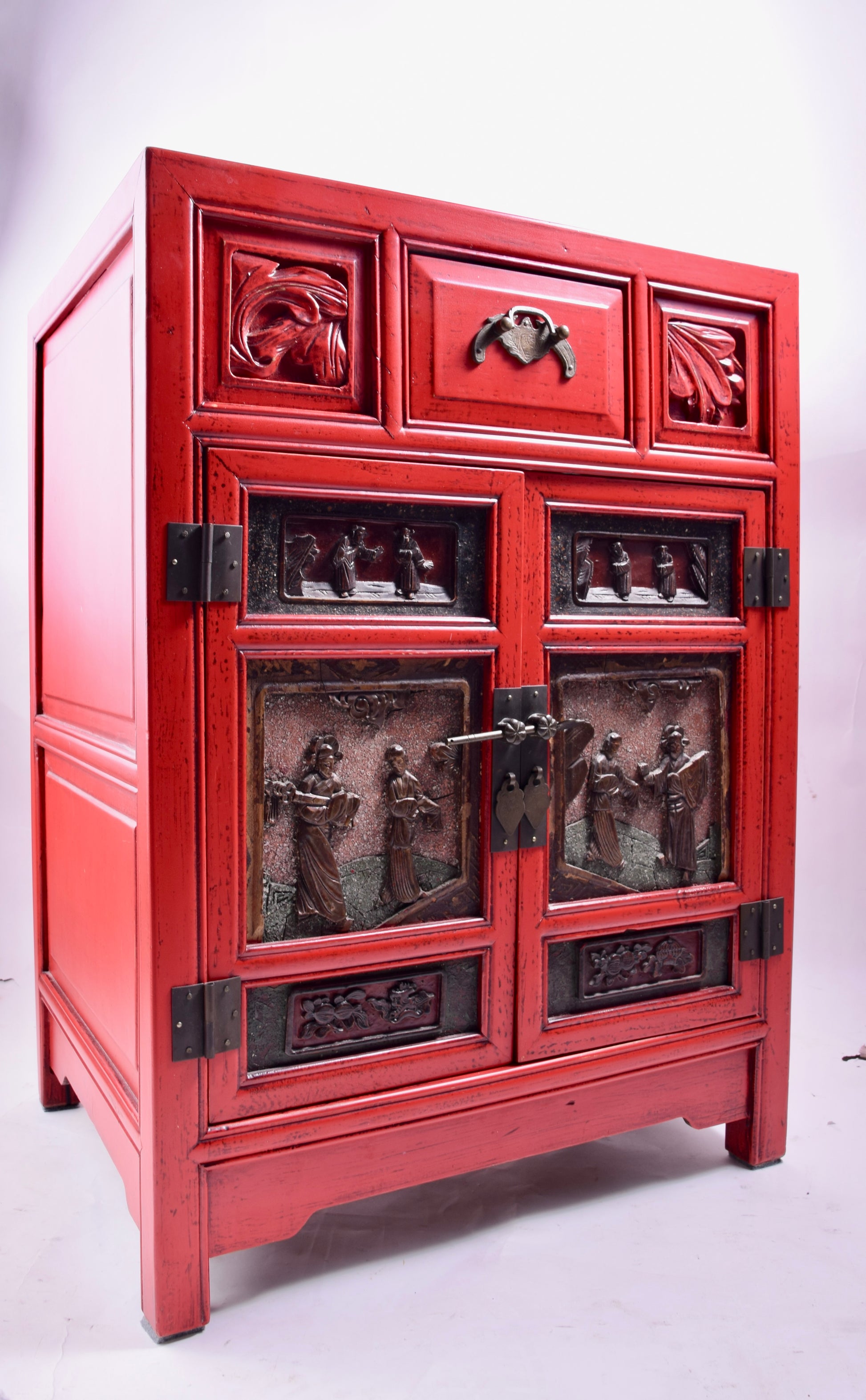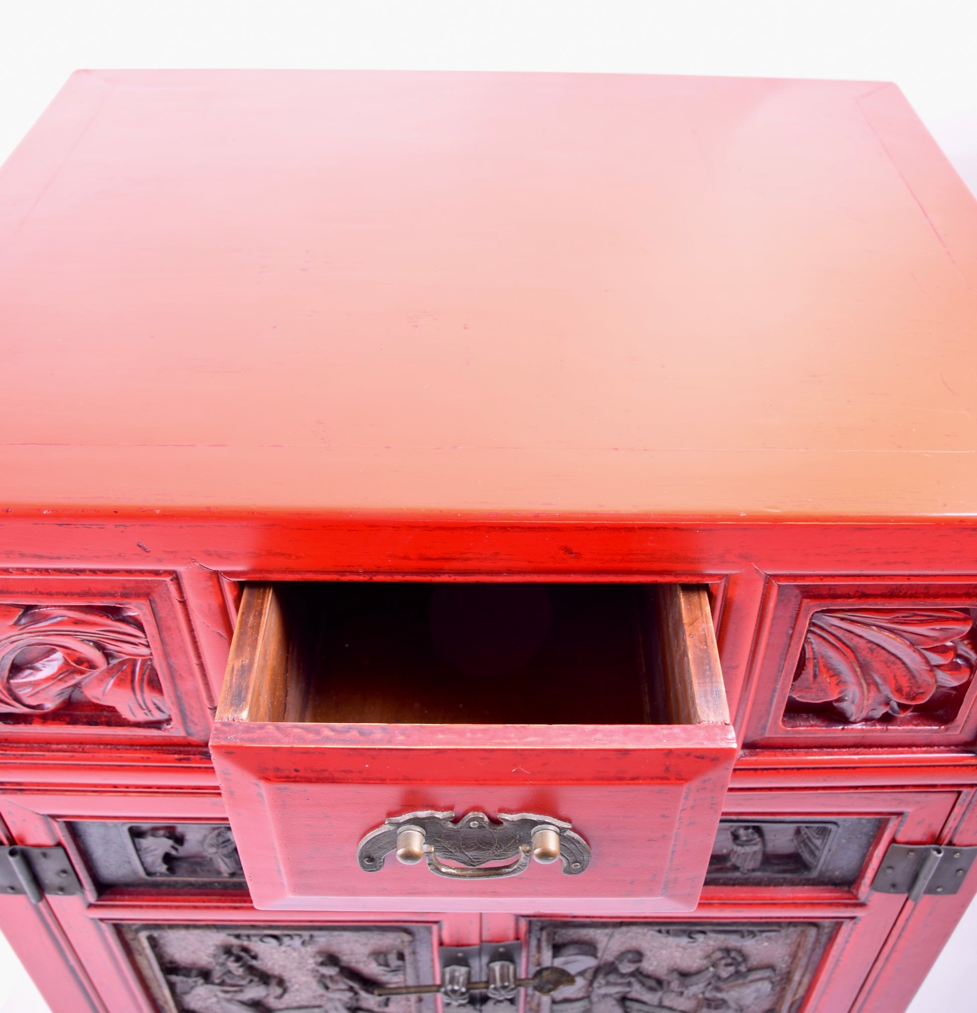 Sztuka Chin czerwona komódka z rzeźbionymi drzwiczkami 71x52x41 cm