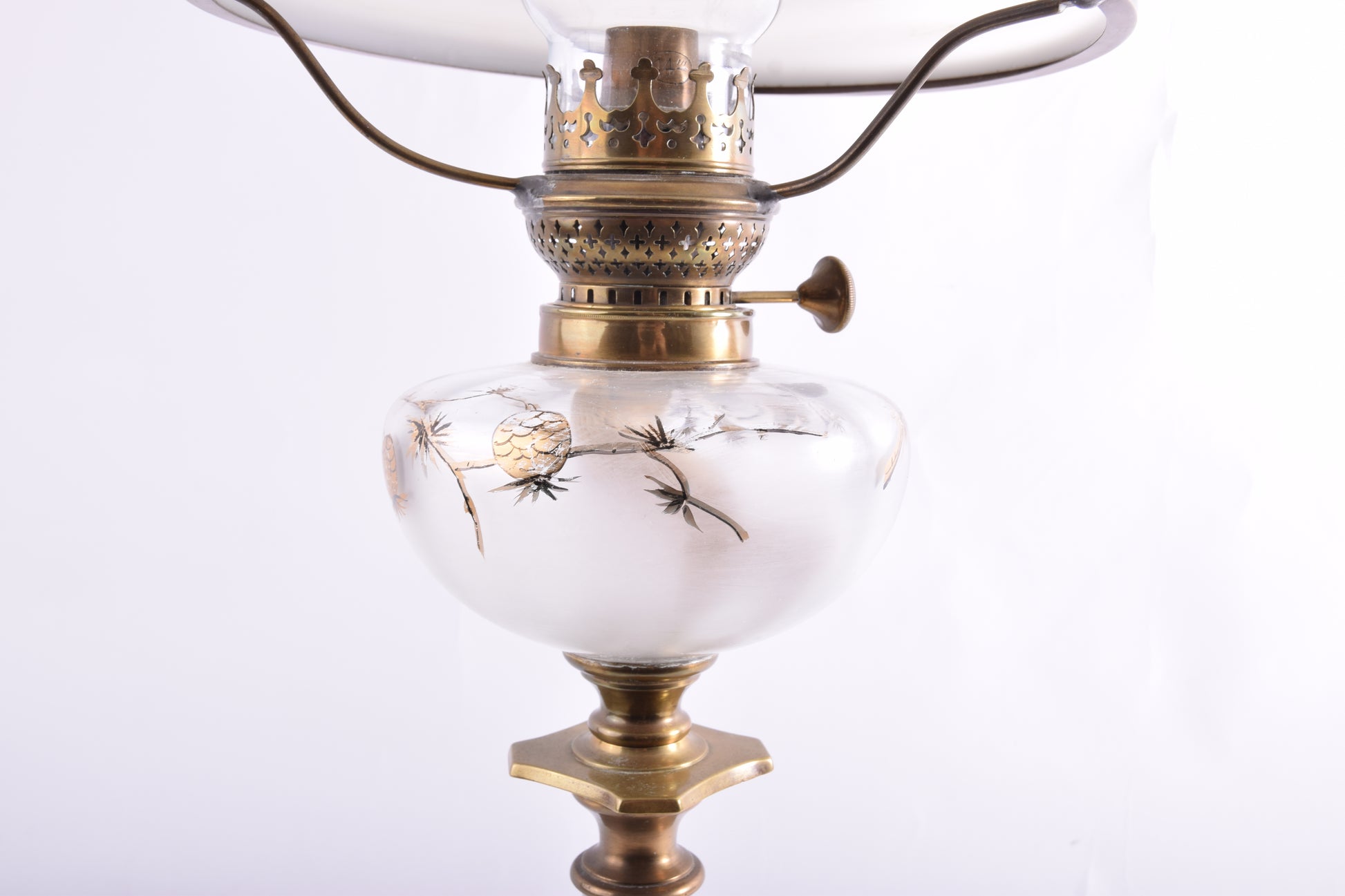 Na sprzedaż oferuję unikatową lampę naftową renomowanego niemieckiego producenta Wilhelm Jonas – Berlin, sygnowaną na oryginalnym pokrętle palnika. Lampa pochodzi z przełomu XIX i XX wieku i stanowi doskonały przykład stylu neobarokowego z secesyjnym sznytem.